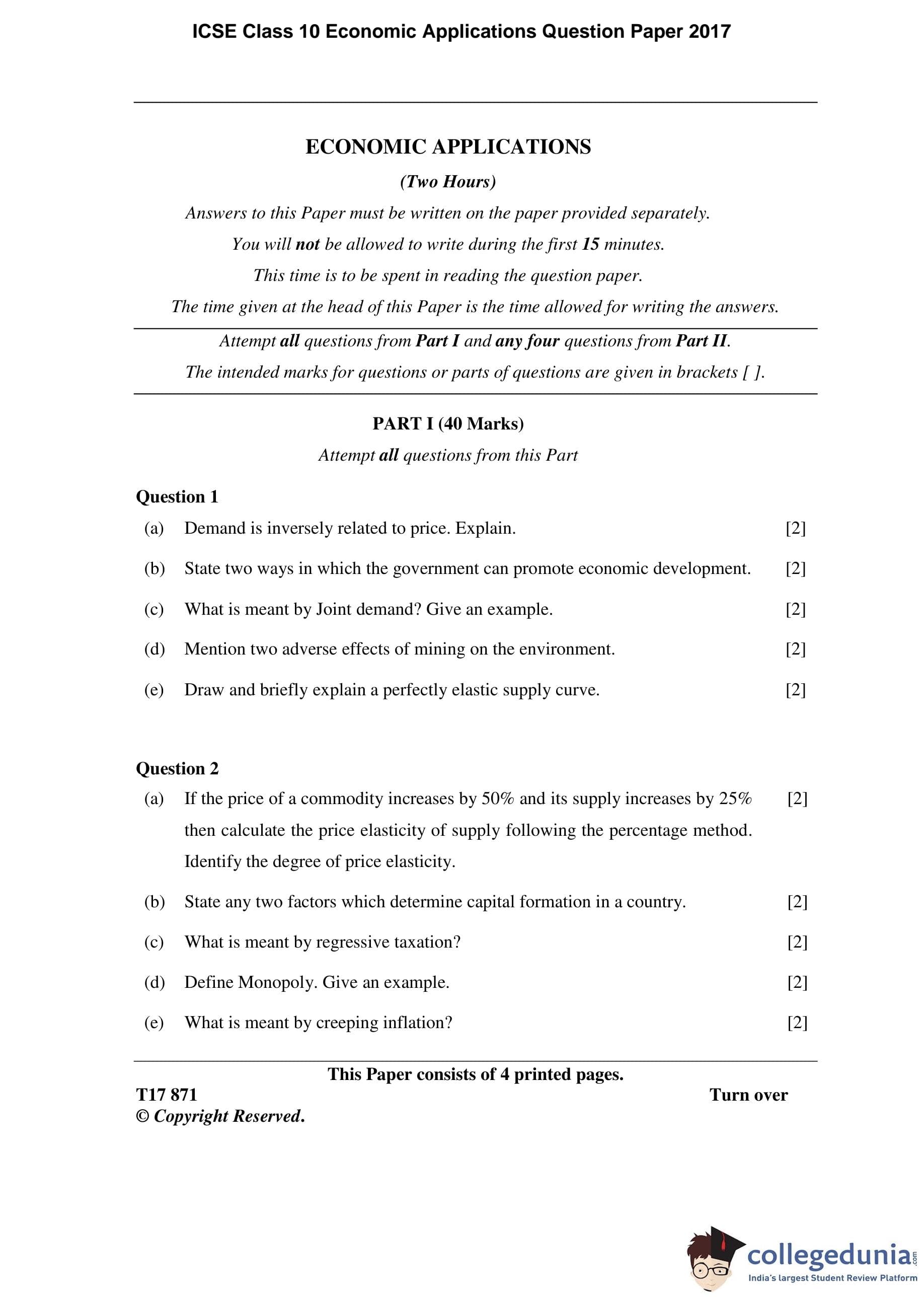 ICSE Class 10 Economic Applications Question Paper 2017 with Answer Key pdf is available for download here. The exam was conducted by Council for the Indian School Certificate Examinations on April 7, 2017 in the Morning Session 11 AM to 1 PM. The question paper comprised a total of 10 questions divided among 2 sections.