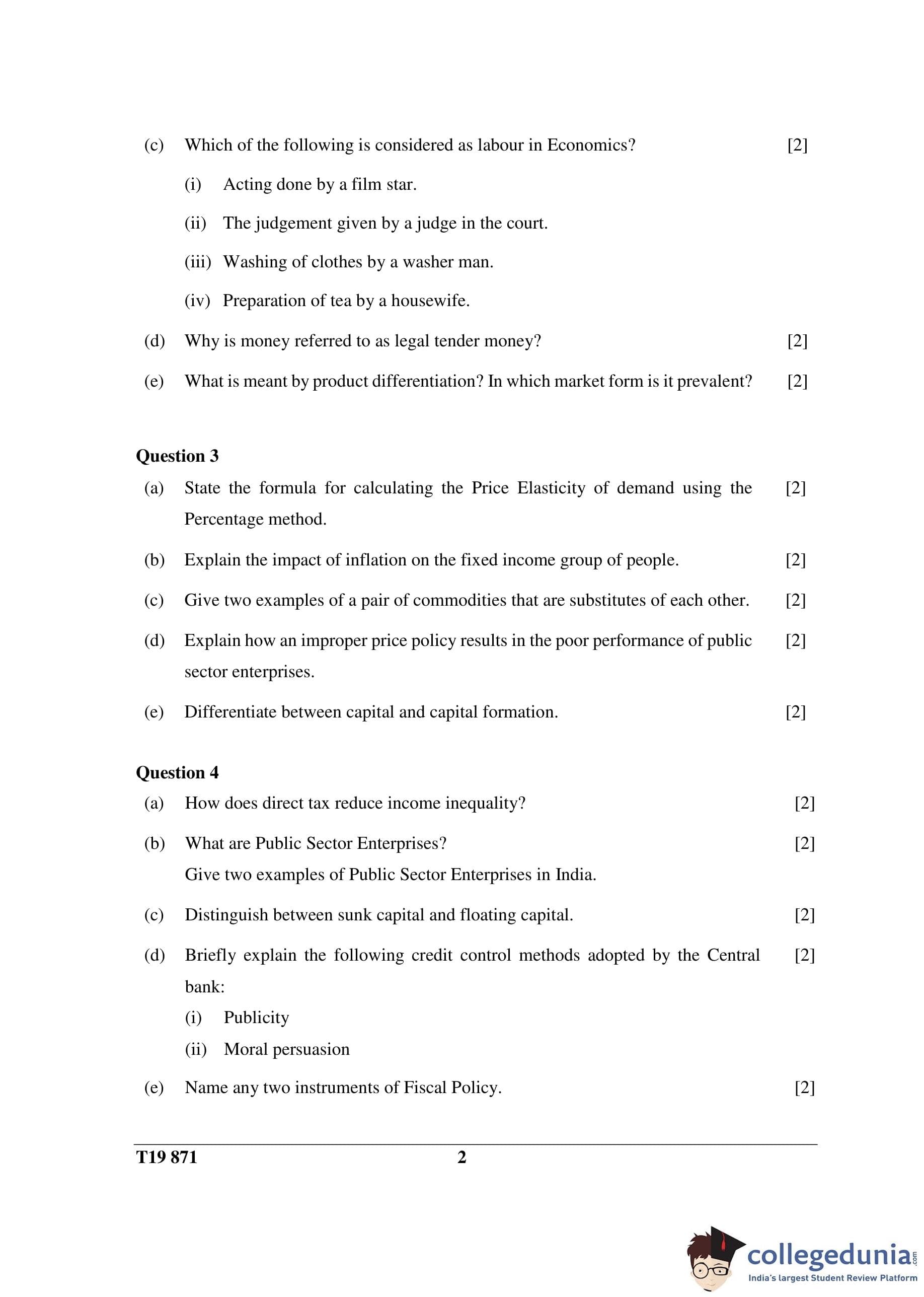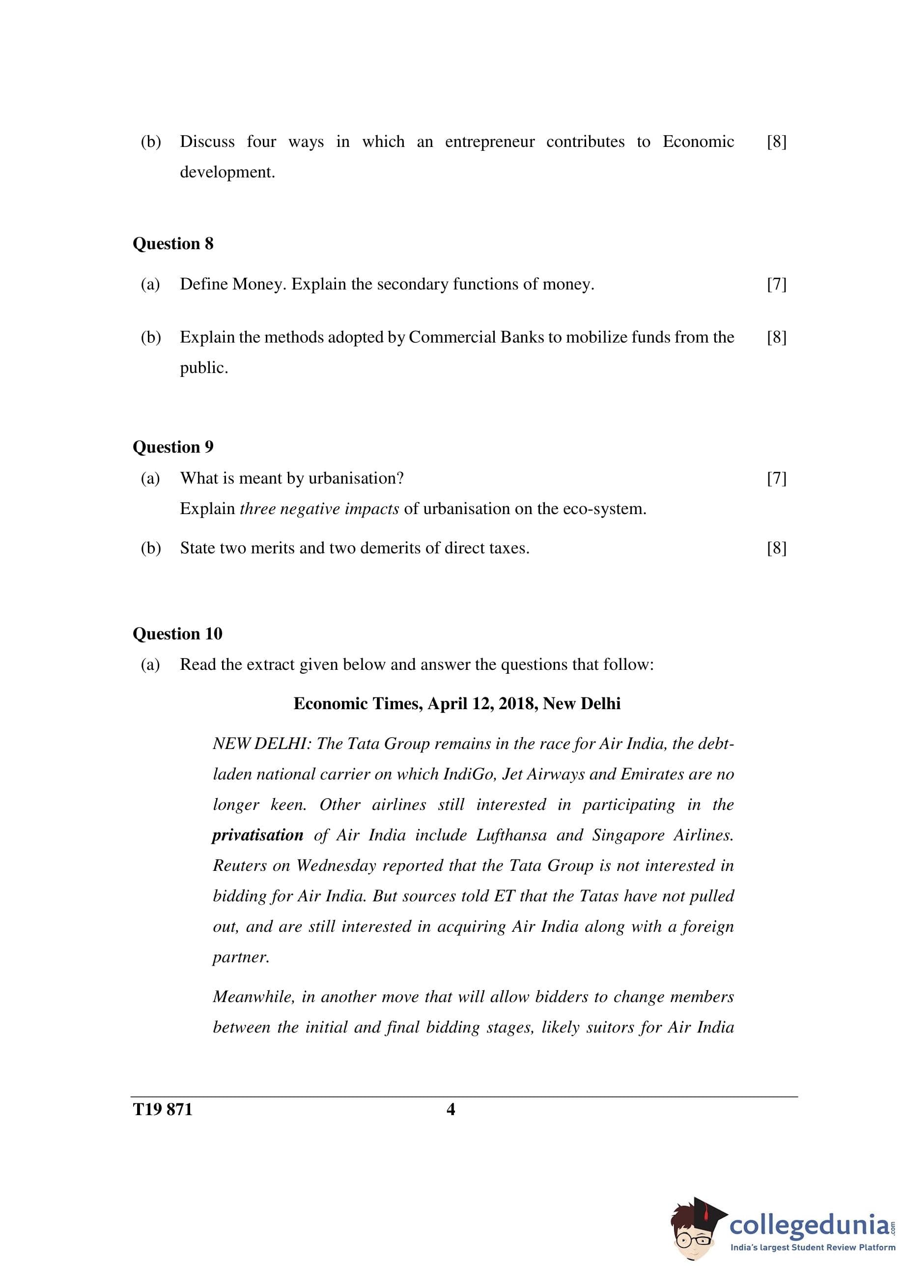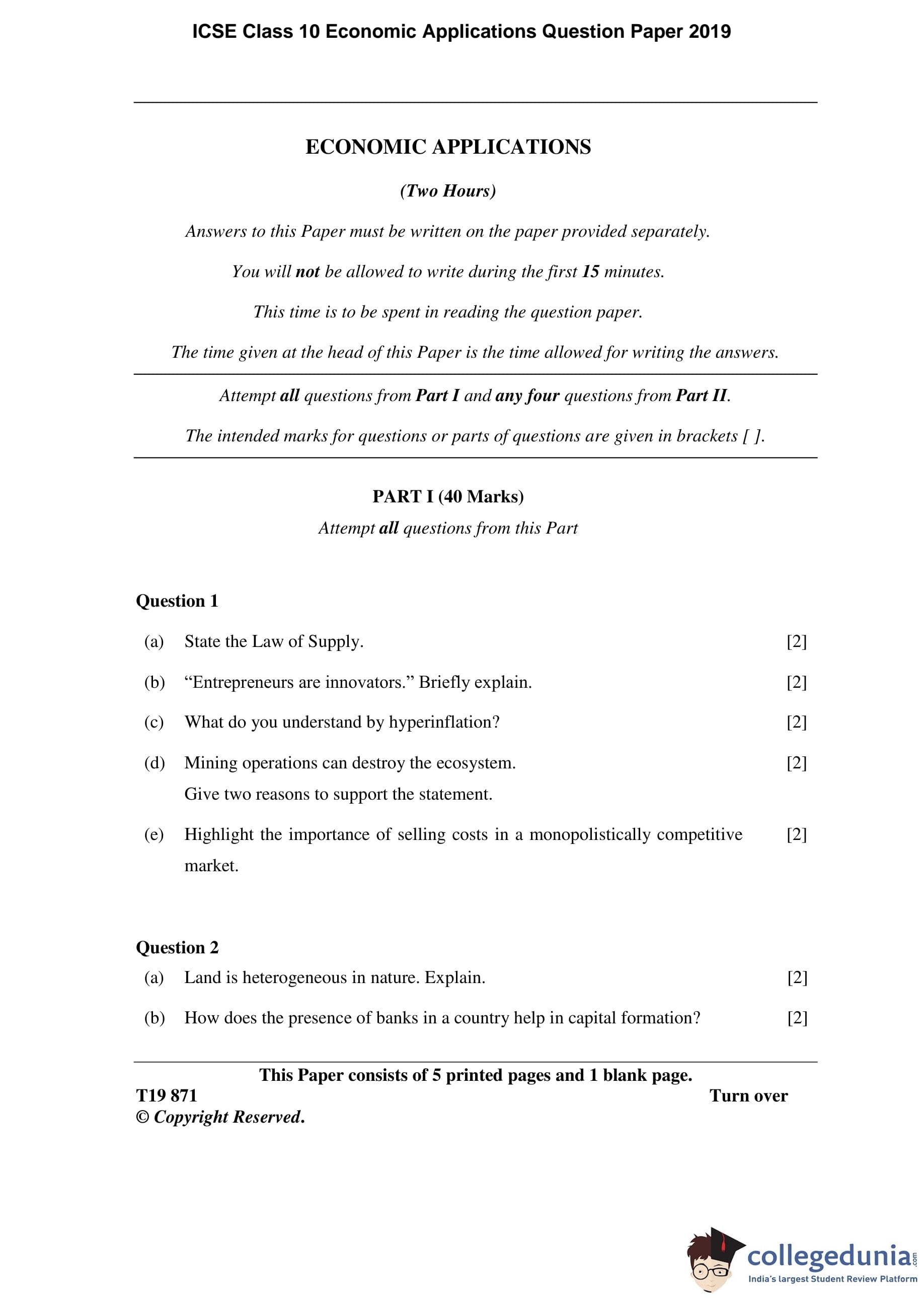 ICSE Class 10 Economic Applications Question Paper 2019 with Answer Key