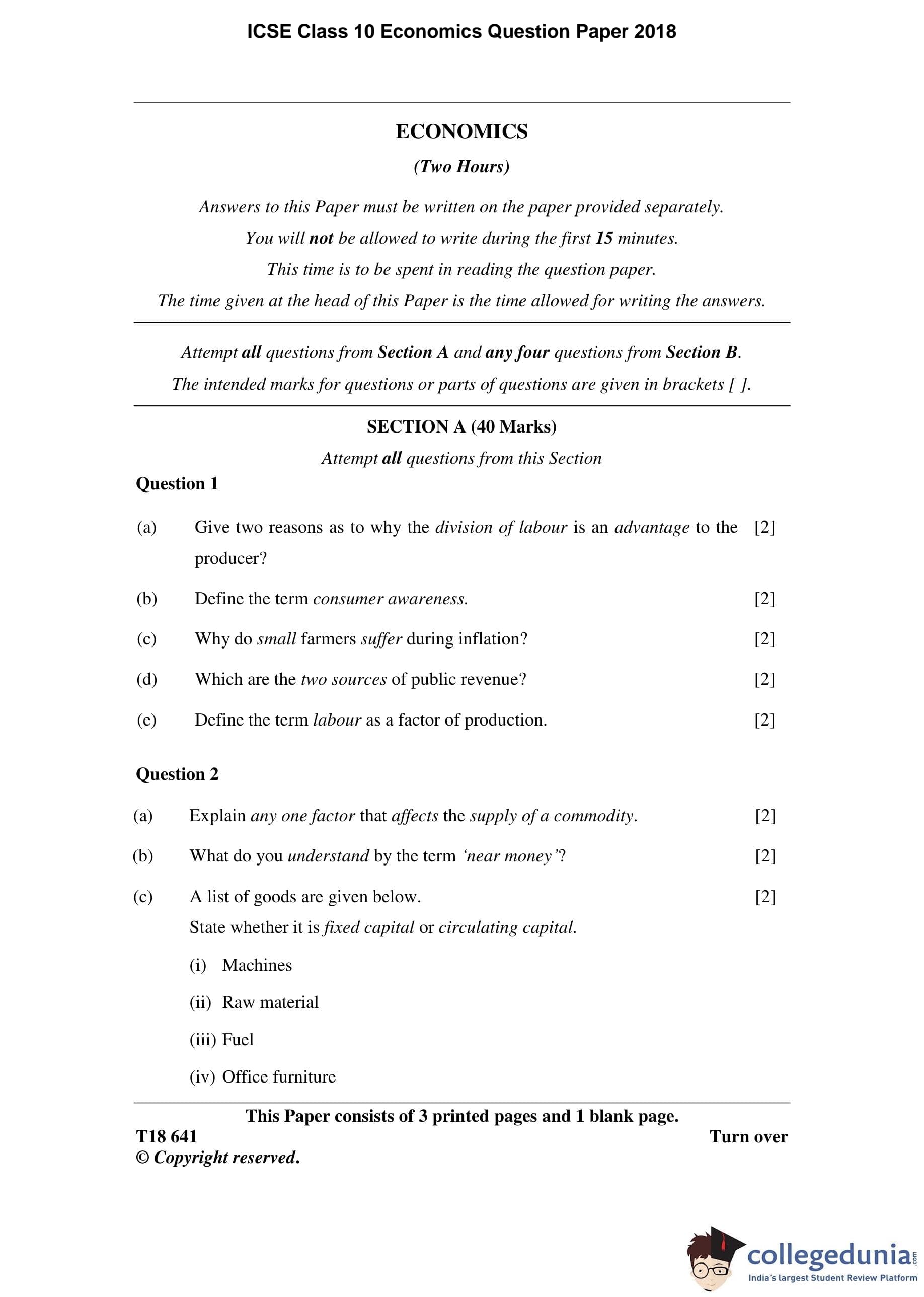 ICSE Class 10 Economics Question Paper 2018 with Answer Key pdf is available for download here. The exam was conducted by Council for the Indian School Certificate Examinations on March 21, 2018 in the Morning Session 11 AM to 1 PM. The question paper comprised a total of 10 questions divided among 2 sections.