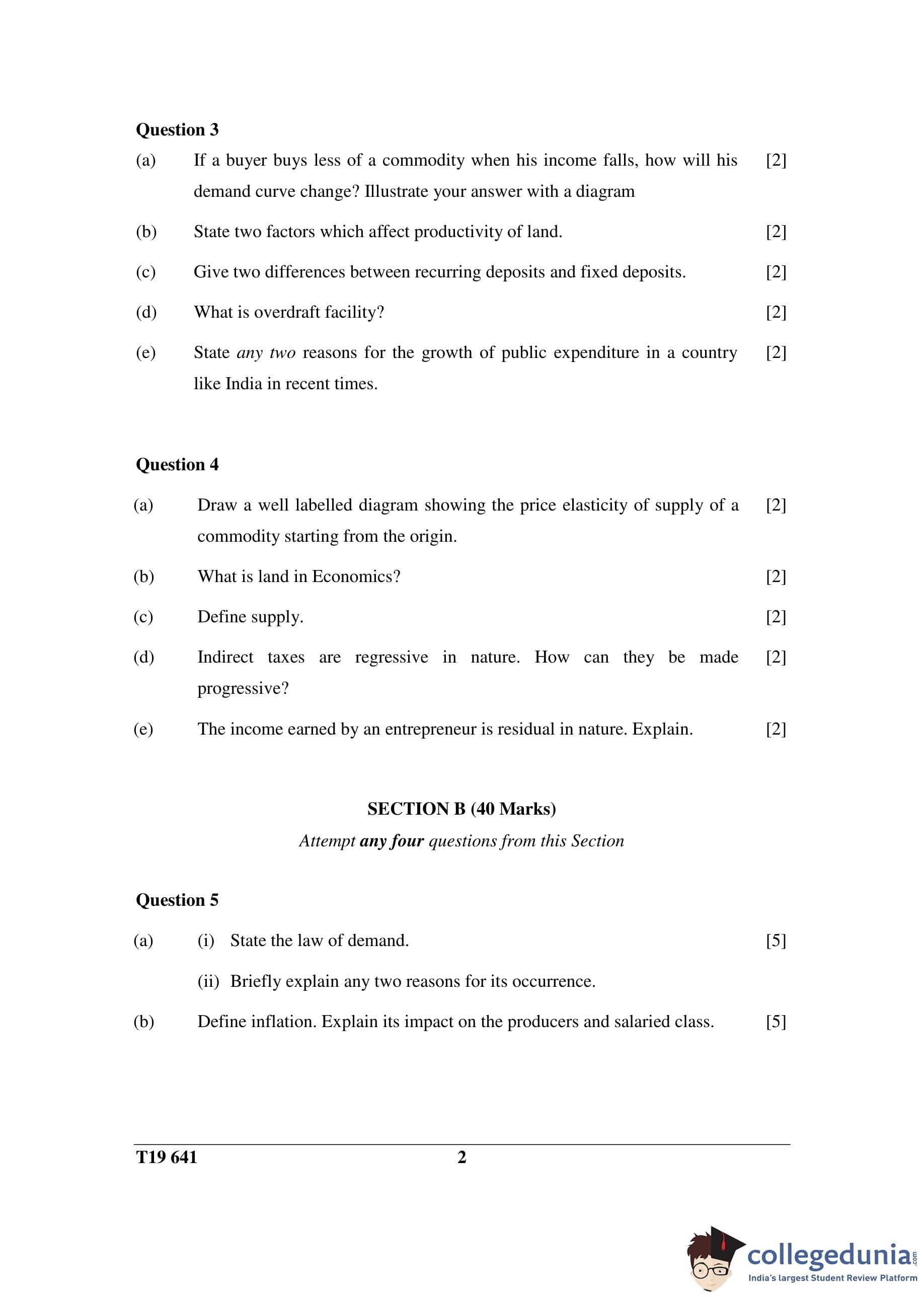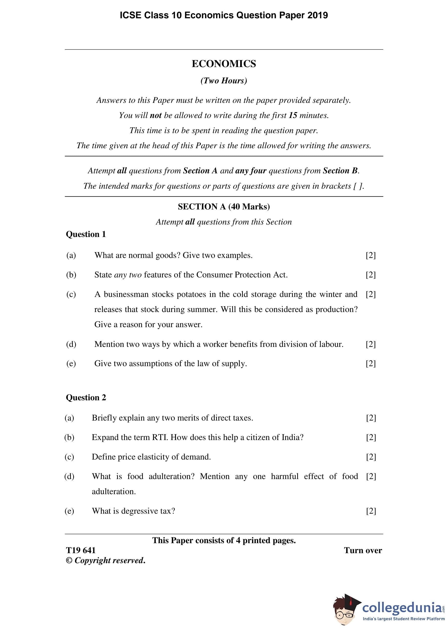 ICSE Class 10 Economics Question Paper 2019 with Answer Key pdf is available for download here. The exam was conducted by Council for the Indian School Certificate Examinations on March 15, 2019 in the Morning Session 11 AM to 1 PM. The question paper comprised a total of 10 questions divided among 2 sections.