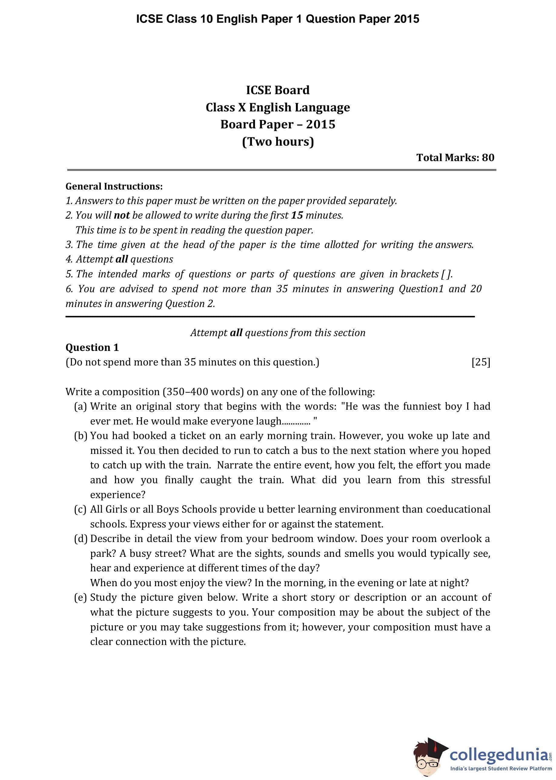 ICSE Class 10 English Paper 1 Question Paper 2015 with Answer Key