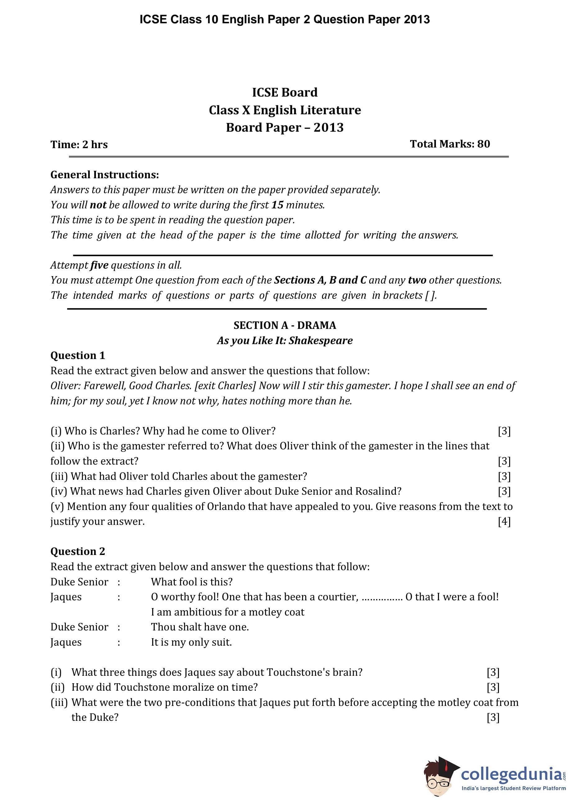ICSE Class 10 English Paper 2 Question Paper 2013 with Answer Key