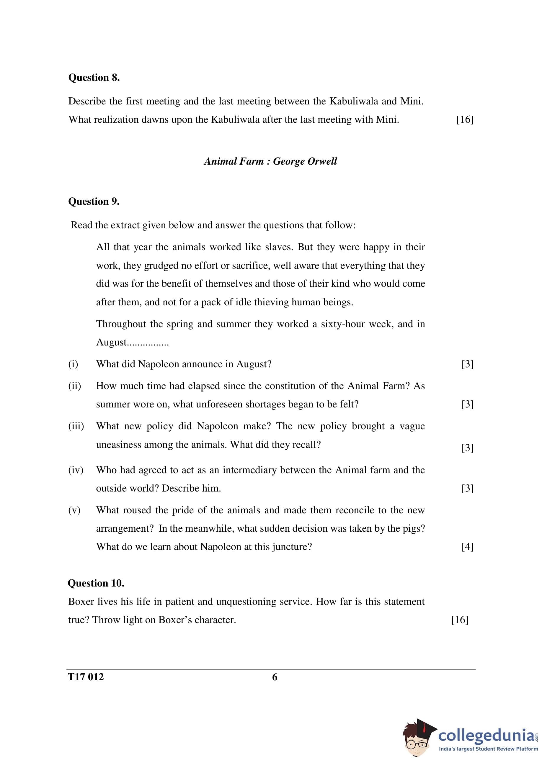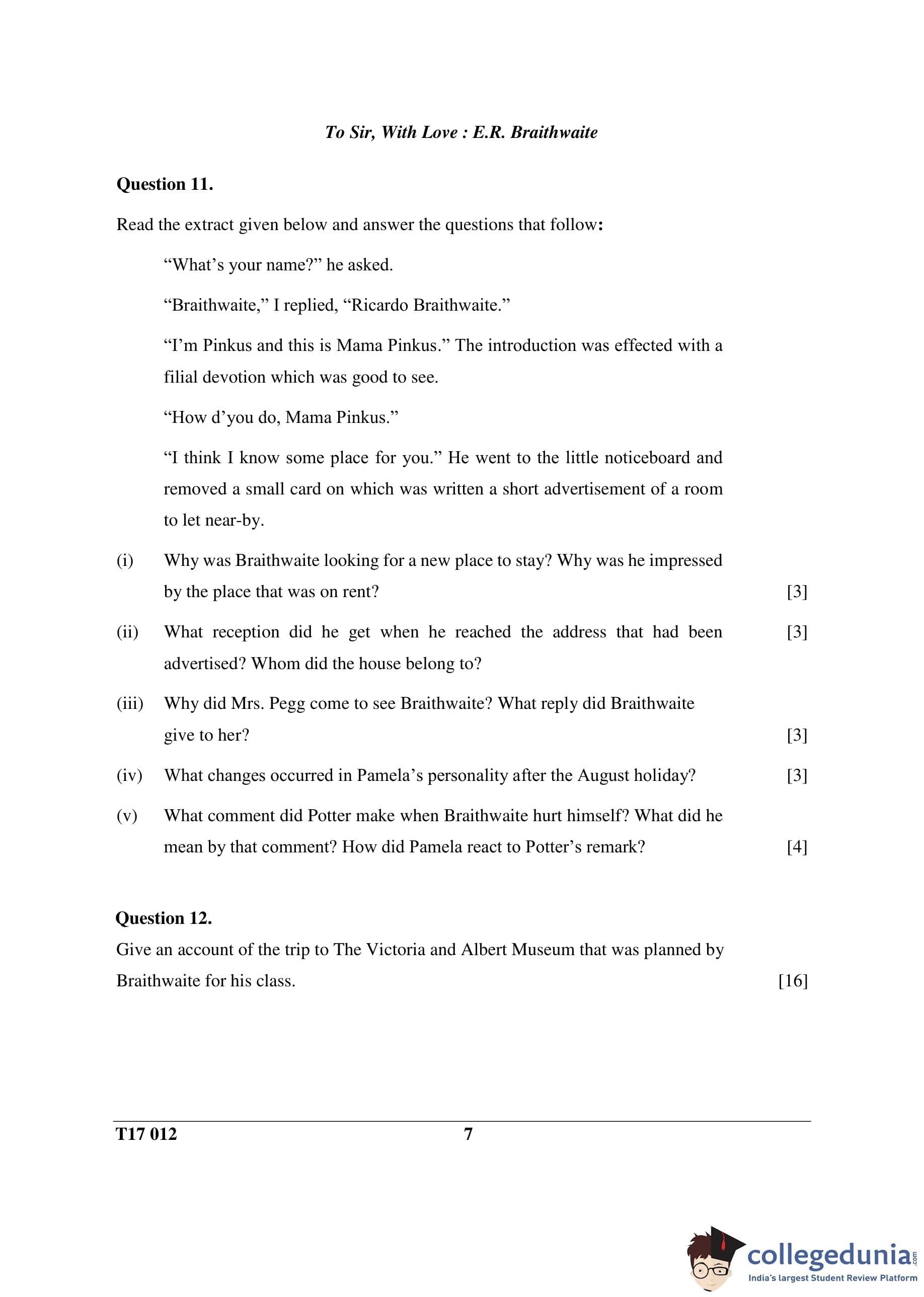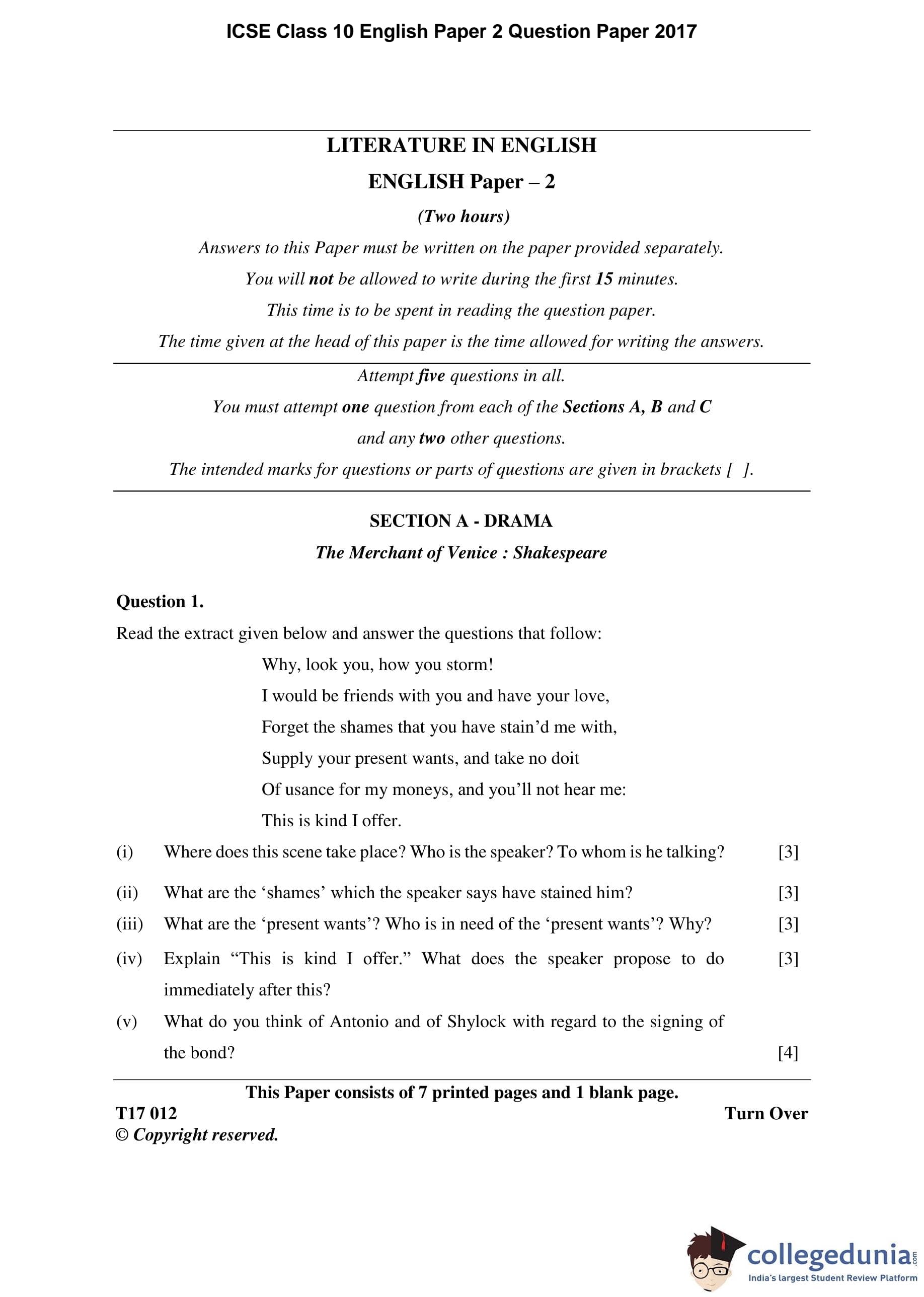 ICSE Class 10 English Paper 2 Question Paper 2017 with Answer Key