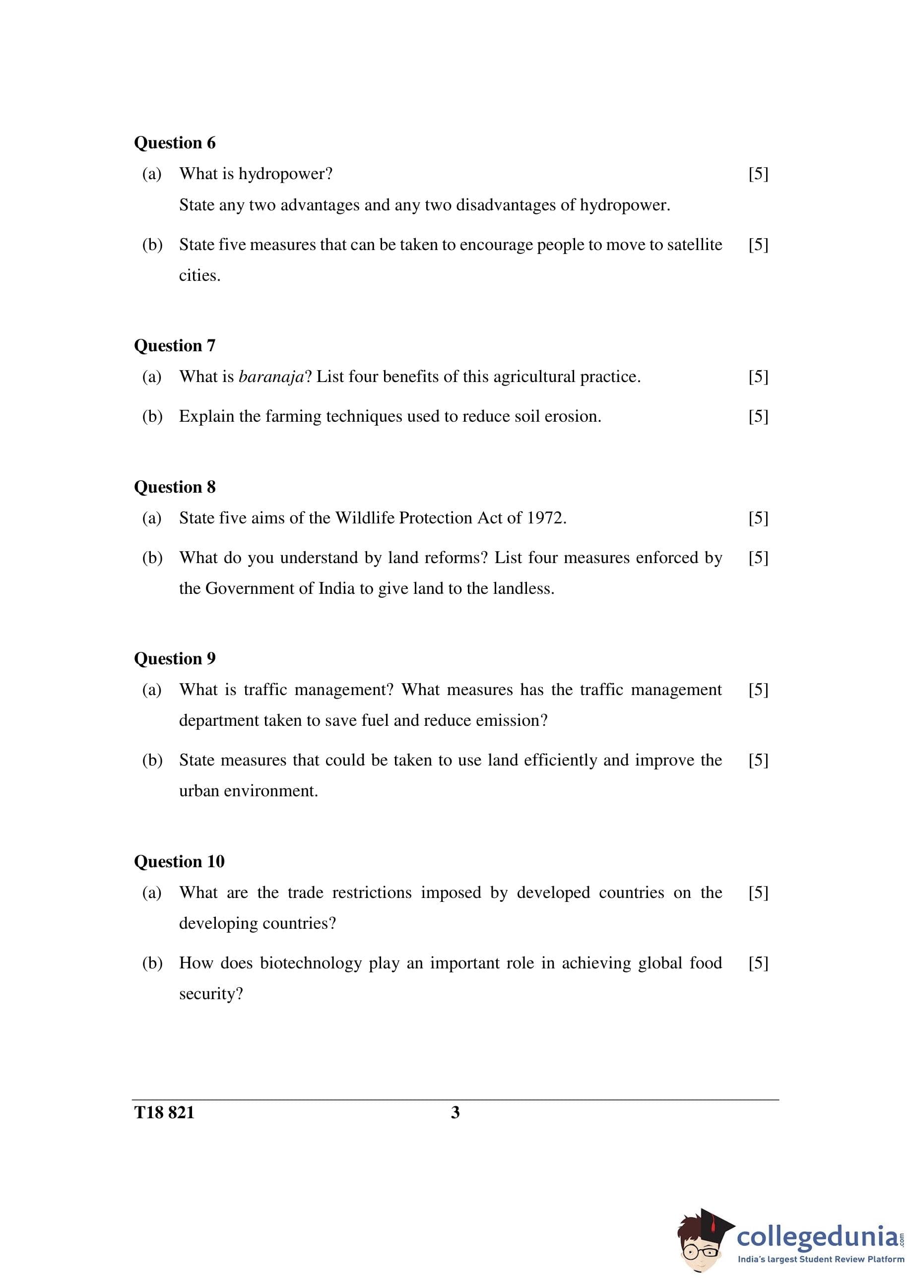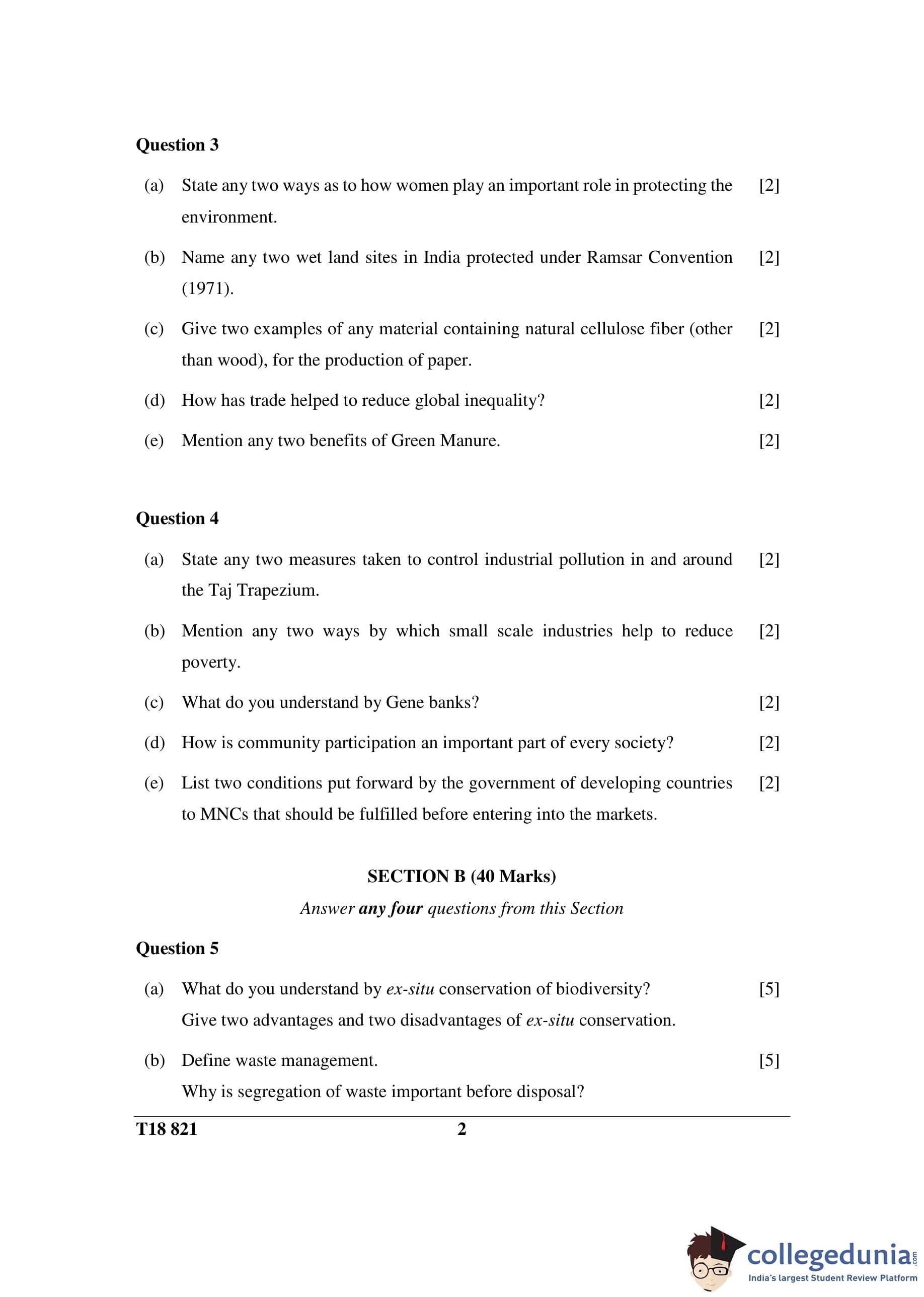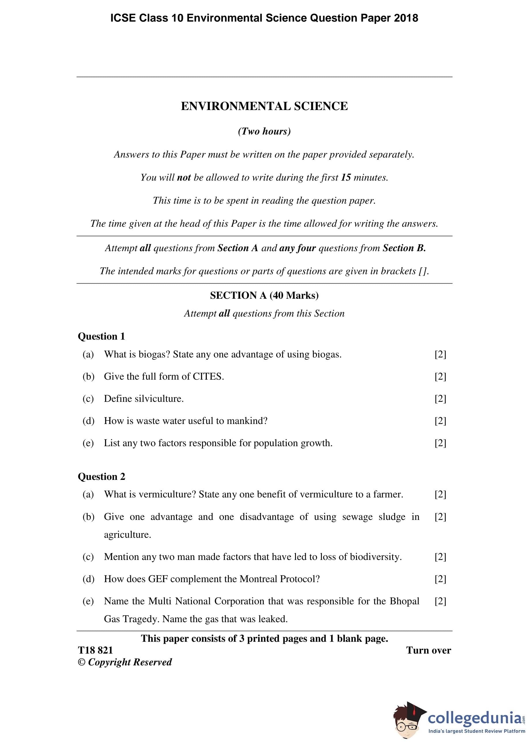 ICSE Class 10 Environmental Science Question Paper 2018 with Answer Key pdf is available for download here. The exam was conducted by Council for the Indian School Certificate Examinations on March 28, 2018 in the Morning Session 11 AM to 1 PM. The question paper comprised a total of 10 questions divided among 2 sections.