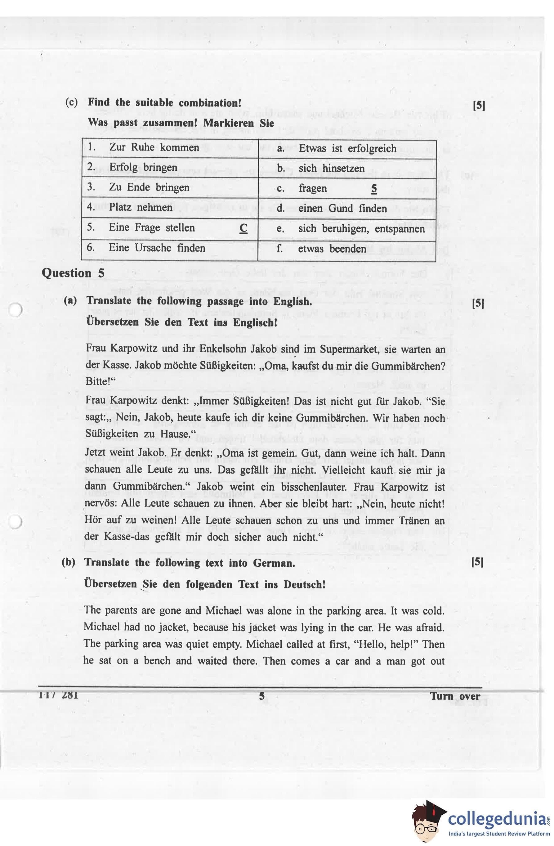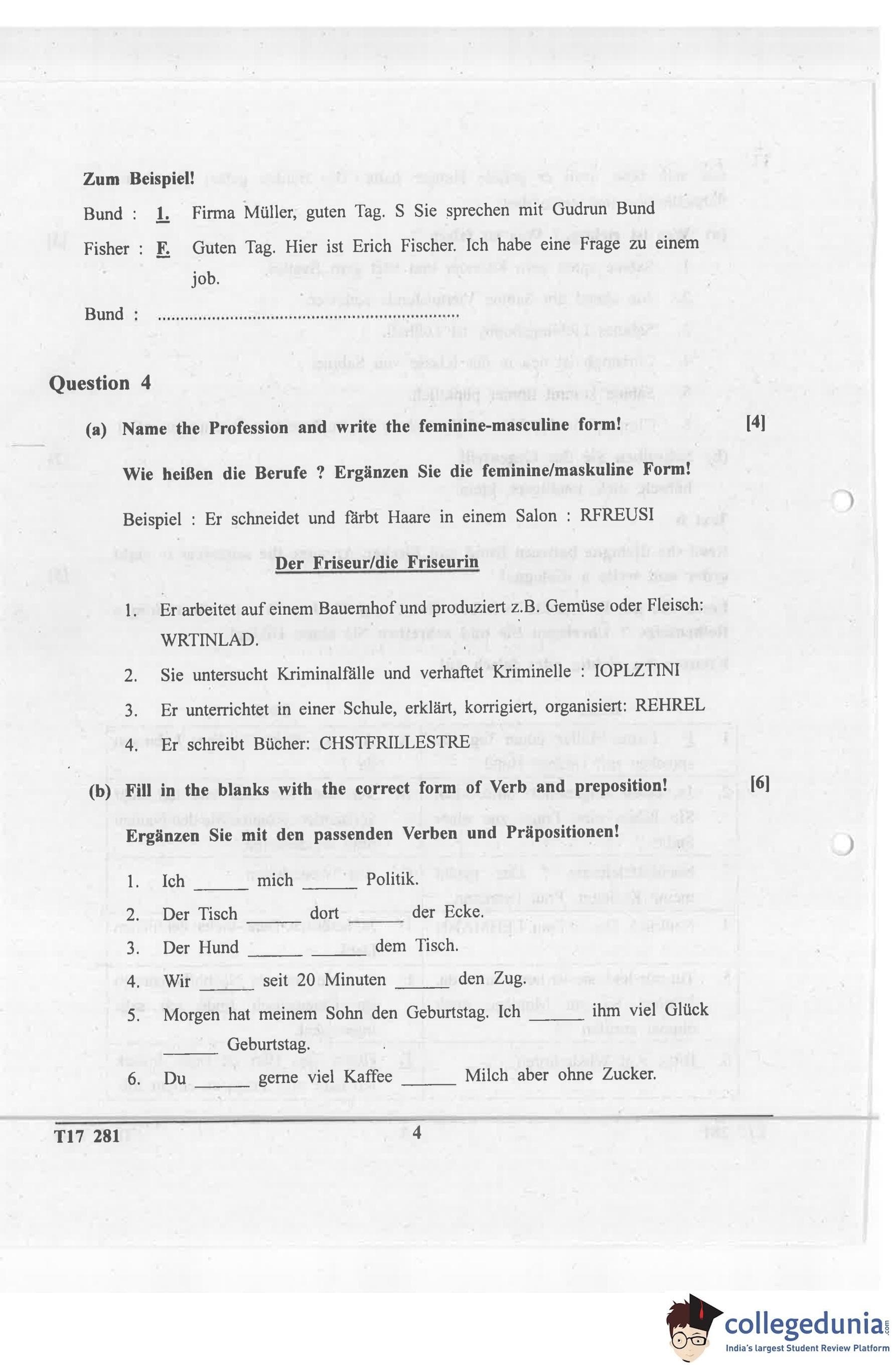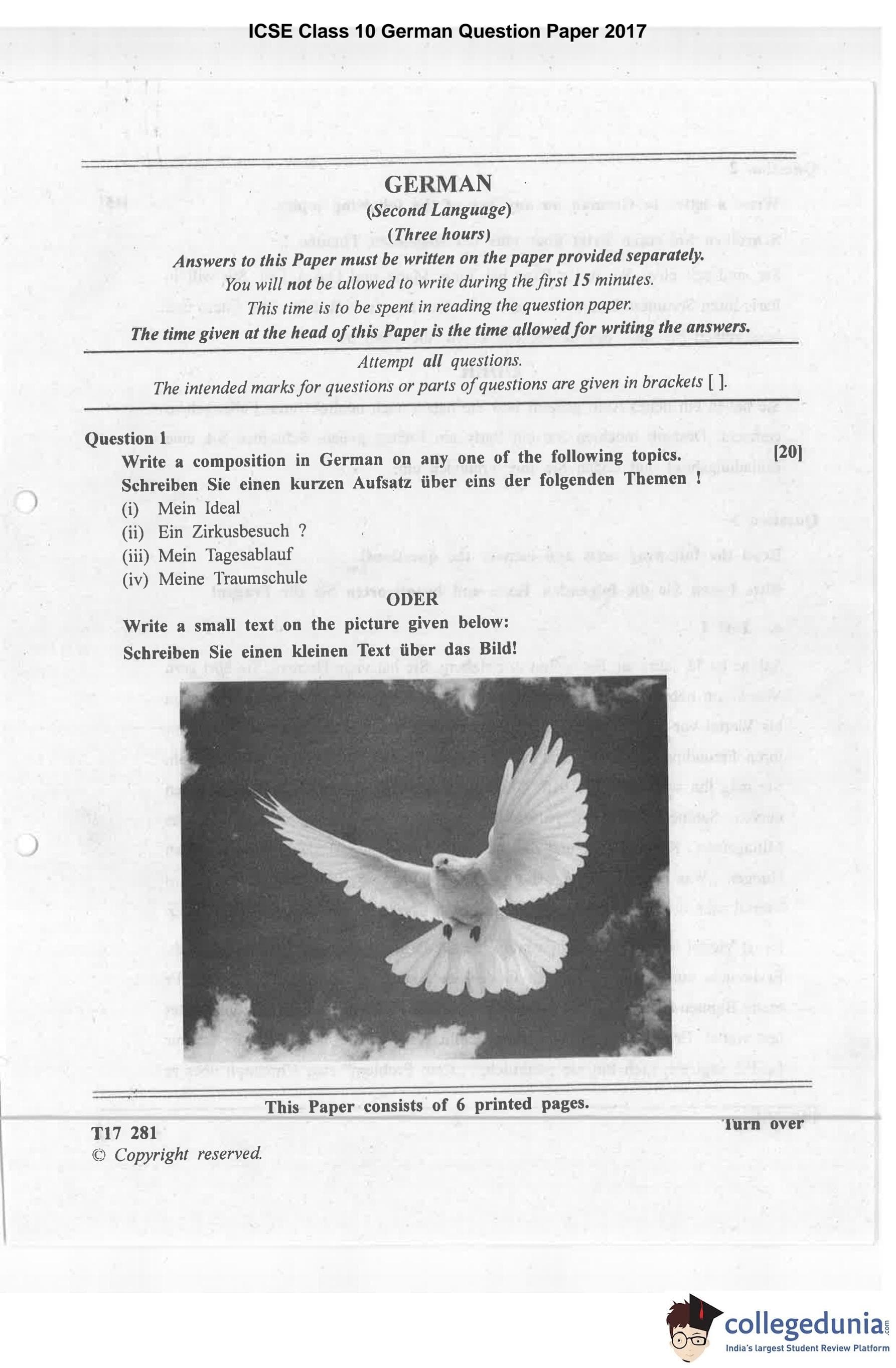 ICSE Class 10 German Question Paper 2017 with Answer Key pdf is available for download here. The exam was conducted by Council for the Indian School Certificate Examinations on March 23, 2017 in the Morning Session 11 AM to 2 PM. The question paper comprised a total of 5 questions.