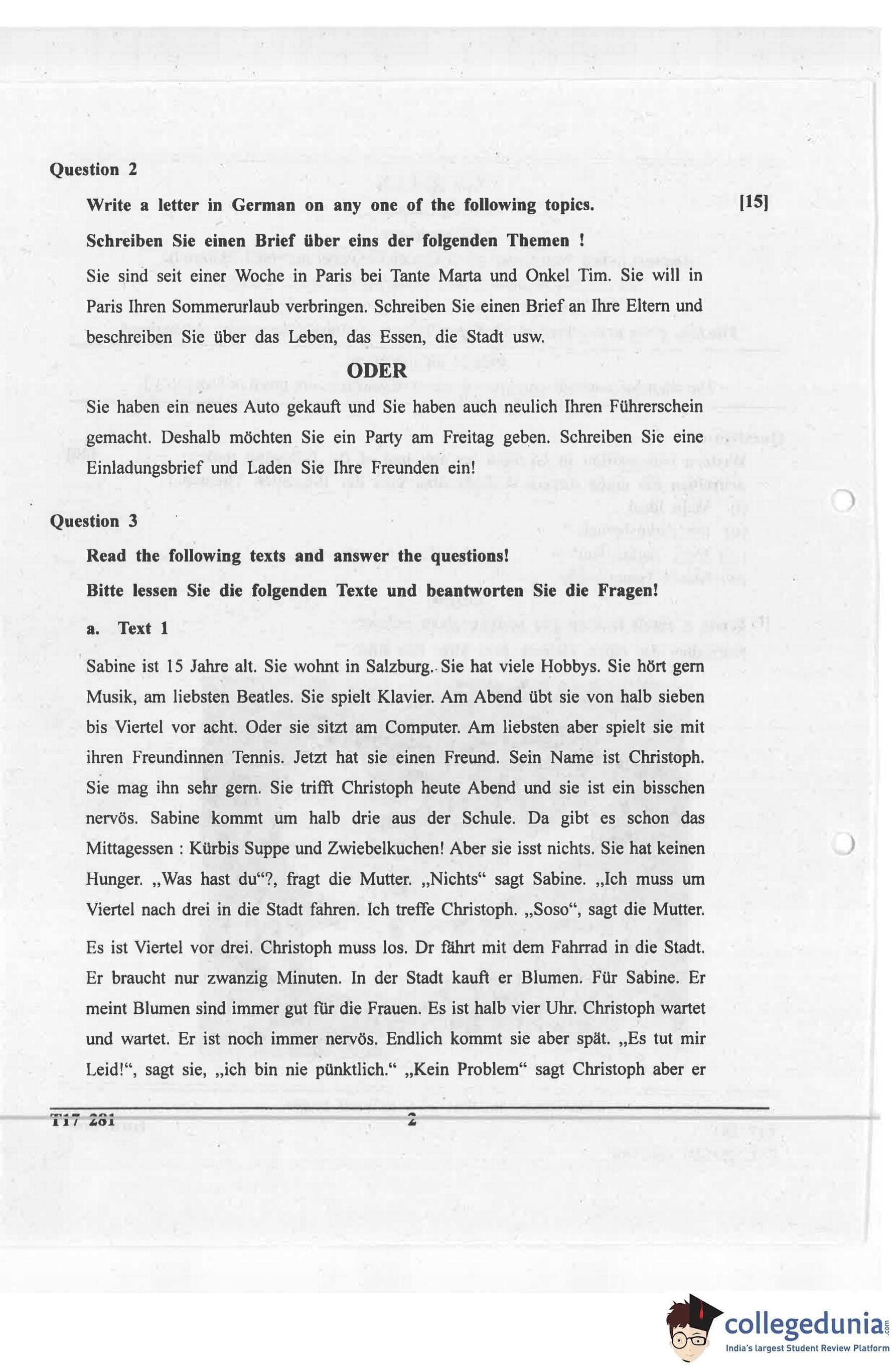 ICSE Class 10 German Question Paper 2017 with Answer Key