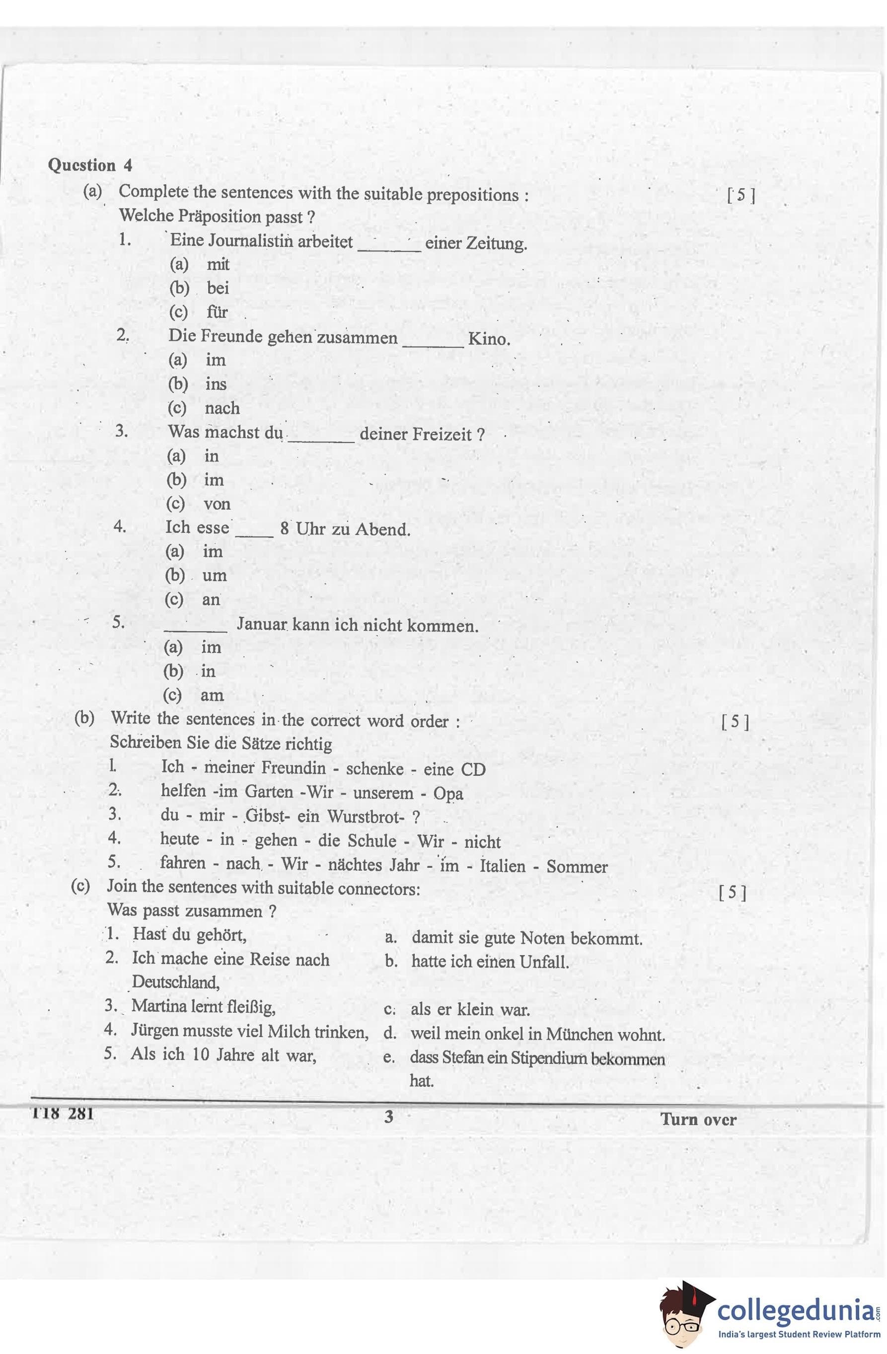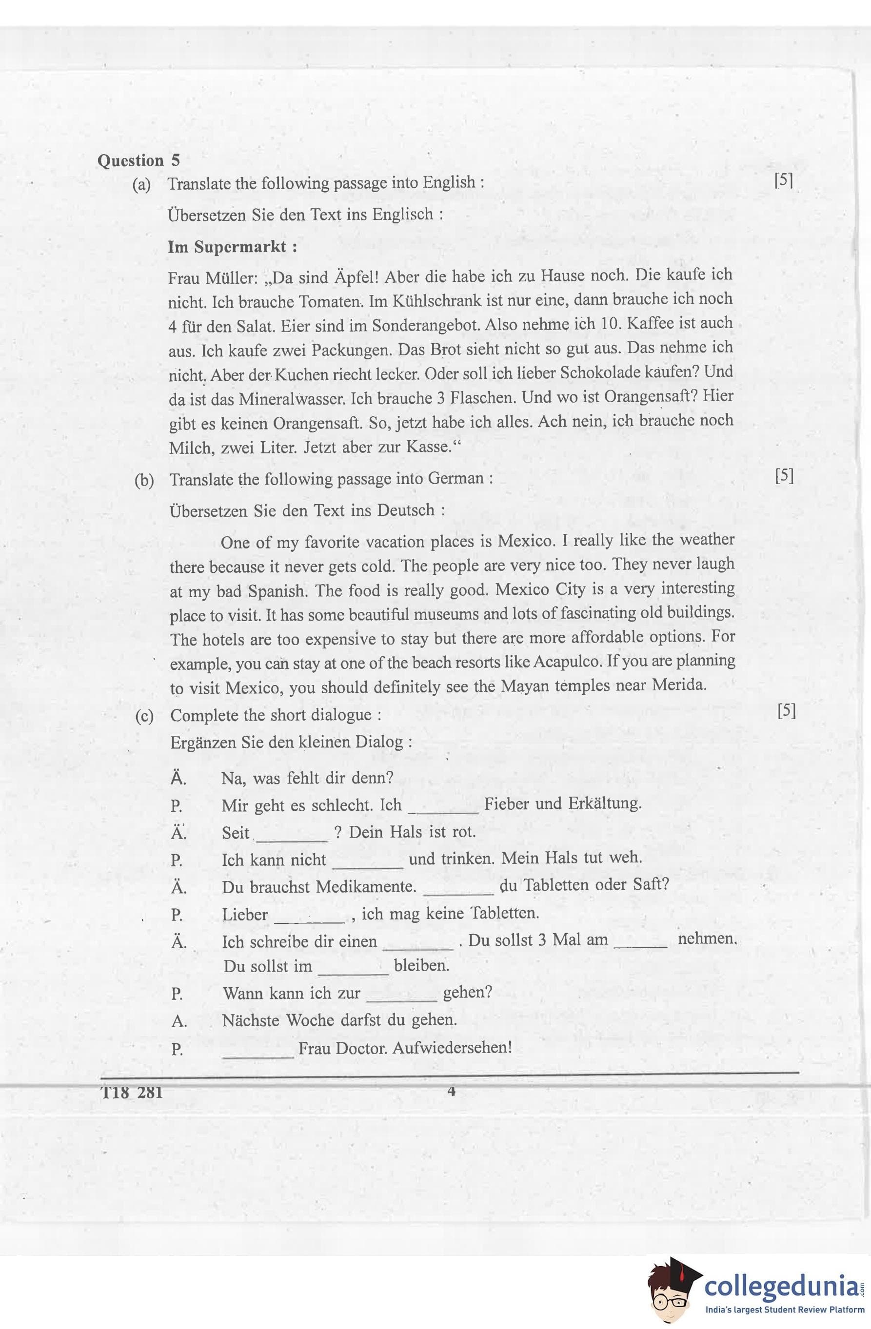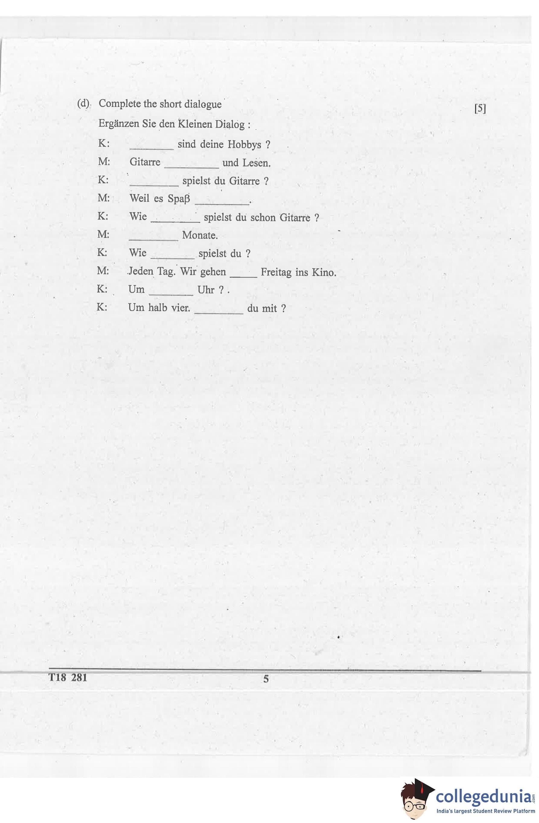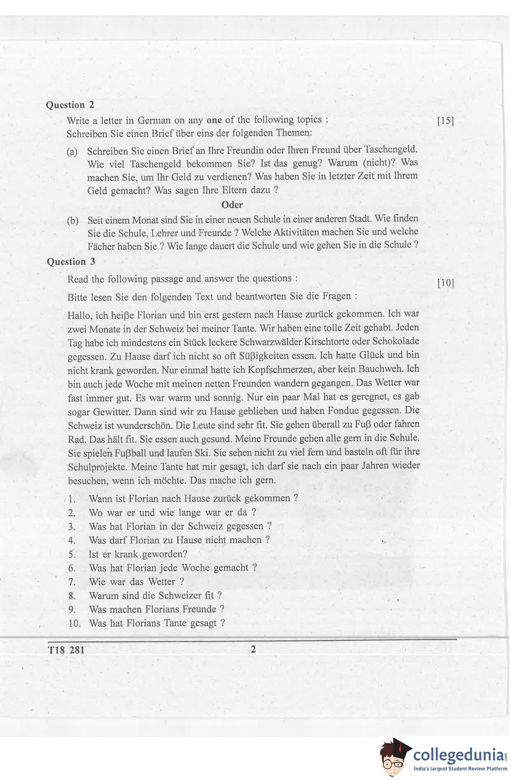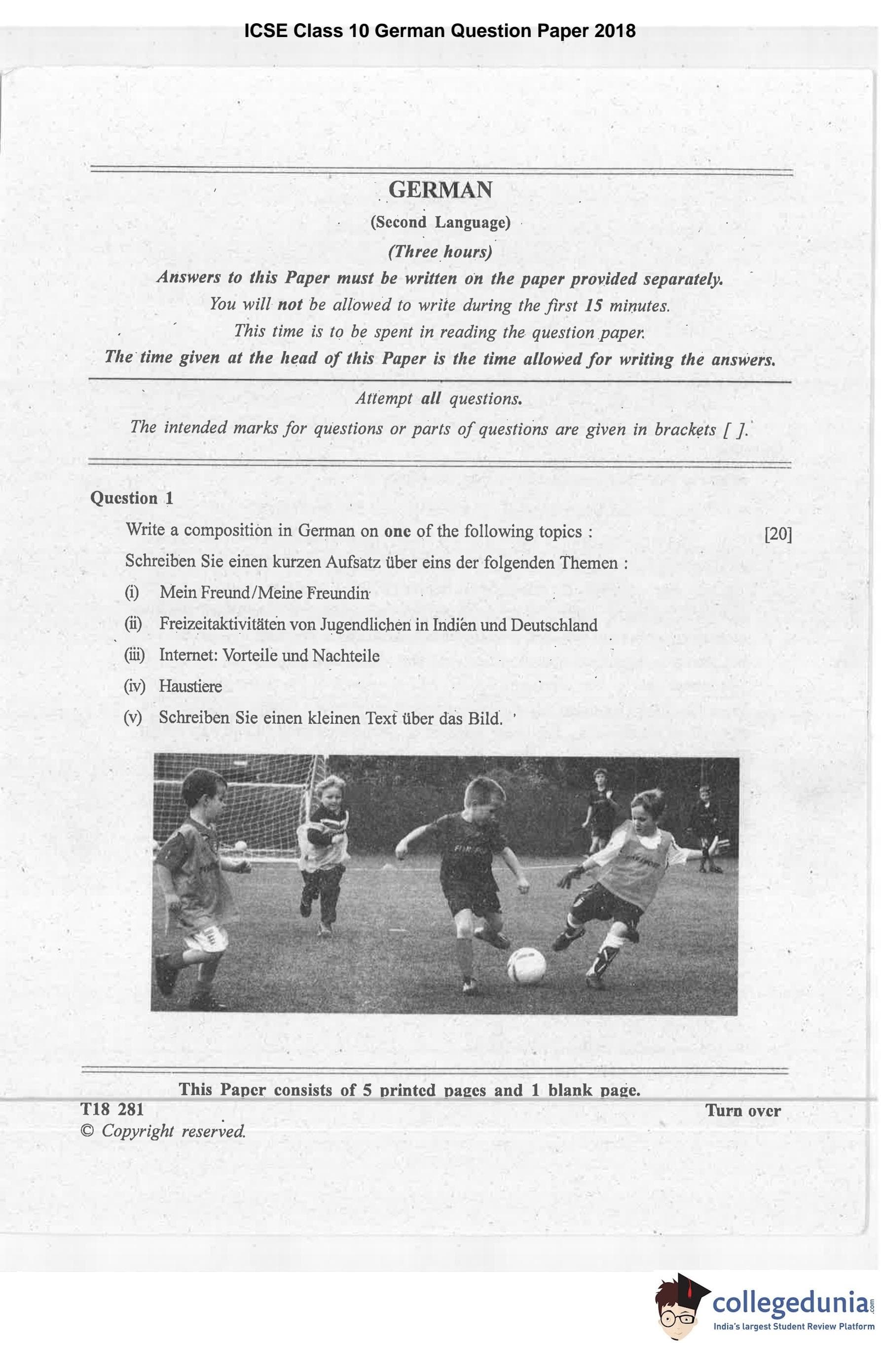 ICSE Class 10 German Question Paper 2018 with Answer Key pdf is available for download here. The exam was conducted by Council for the Indian School Certificate Examinations on March 9, 2018 in the Morning Session 11 AM to 2 PM. The question paper comprised a total of 5 questions.
