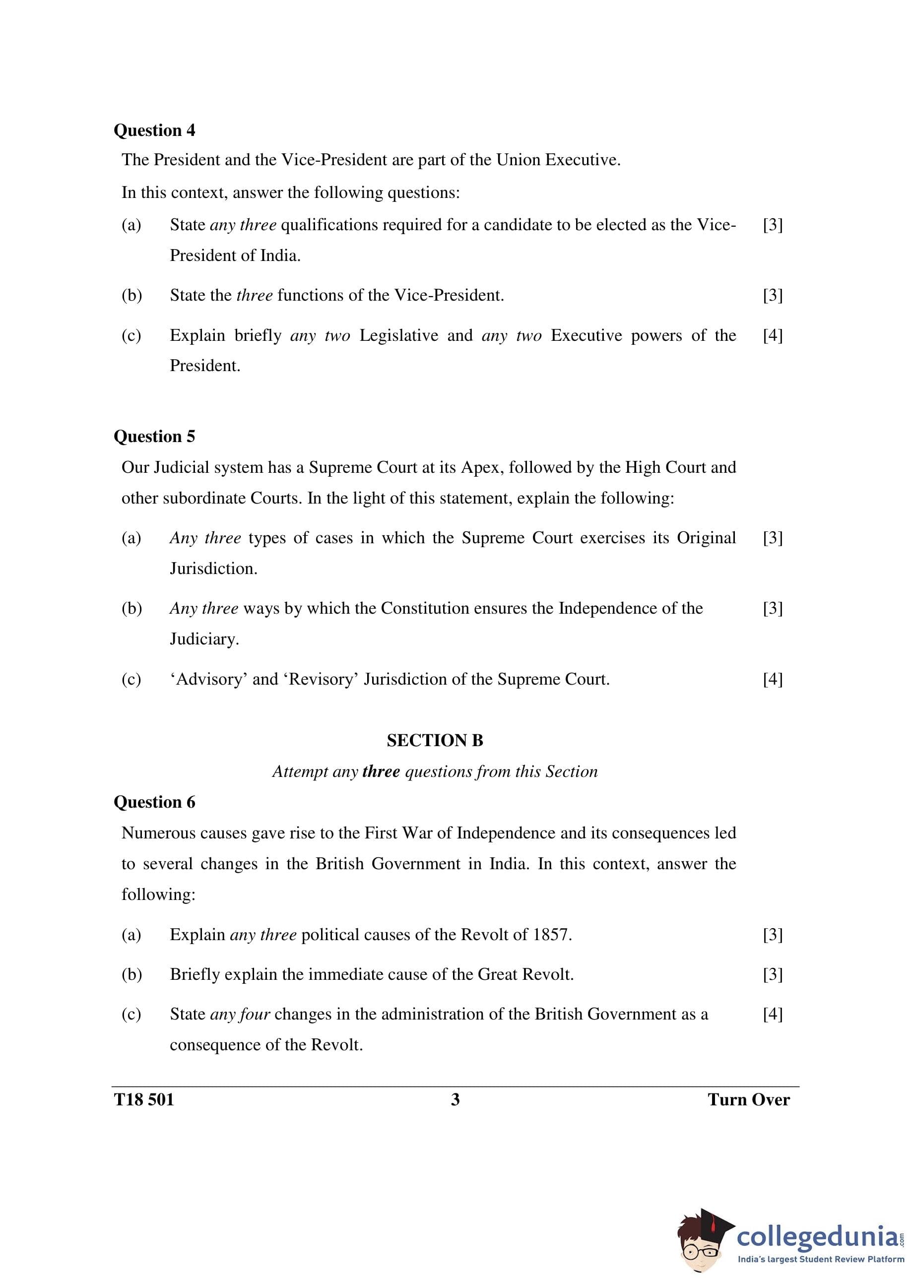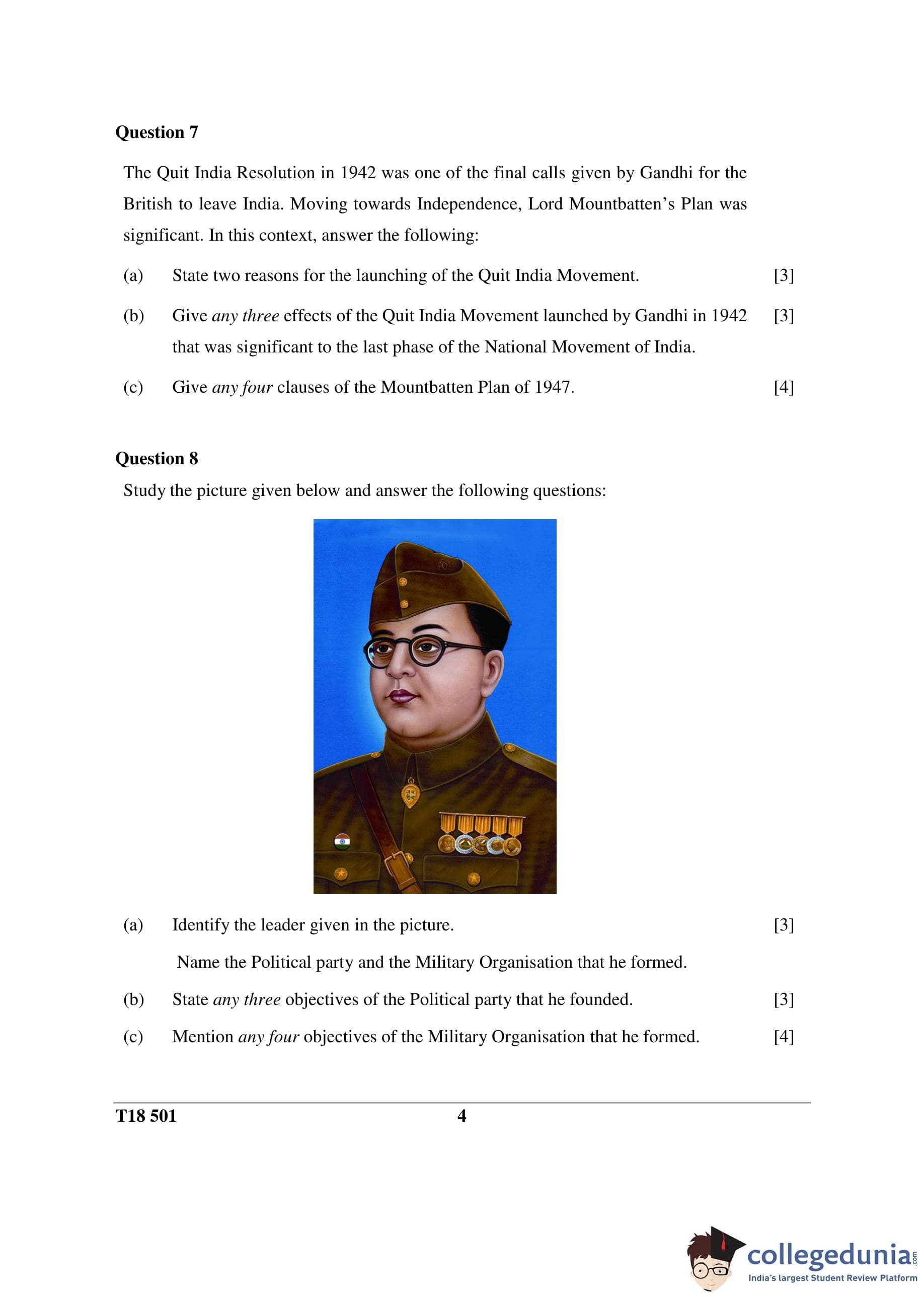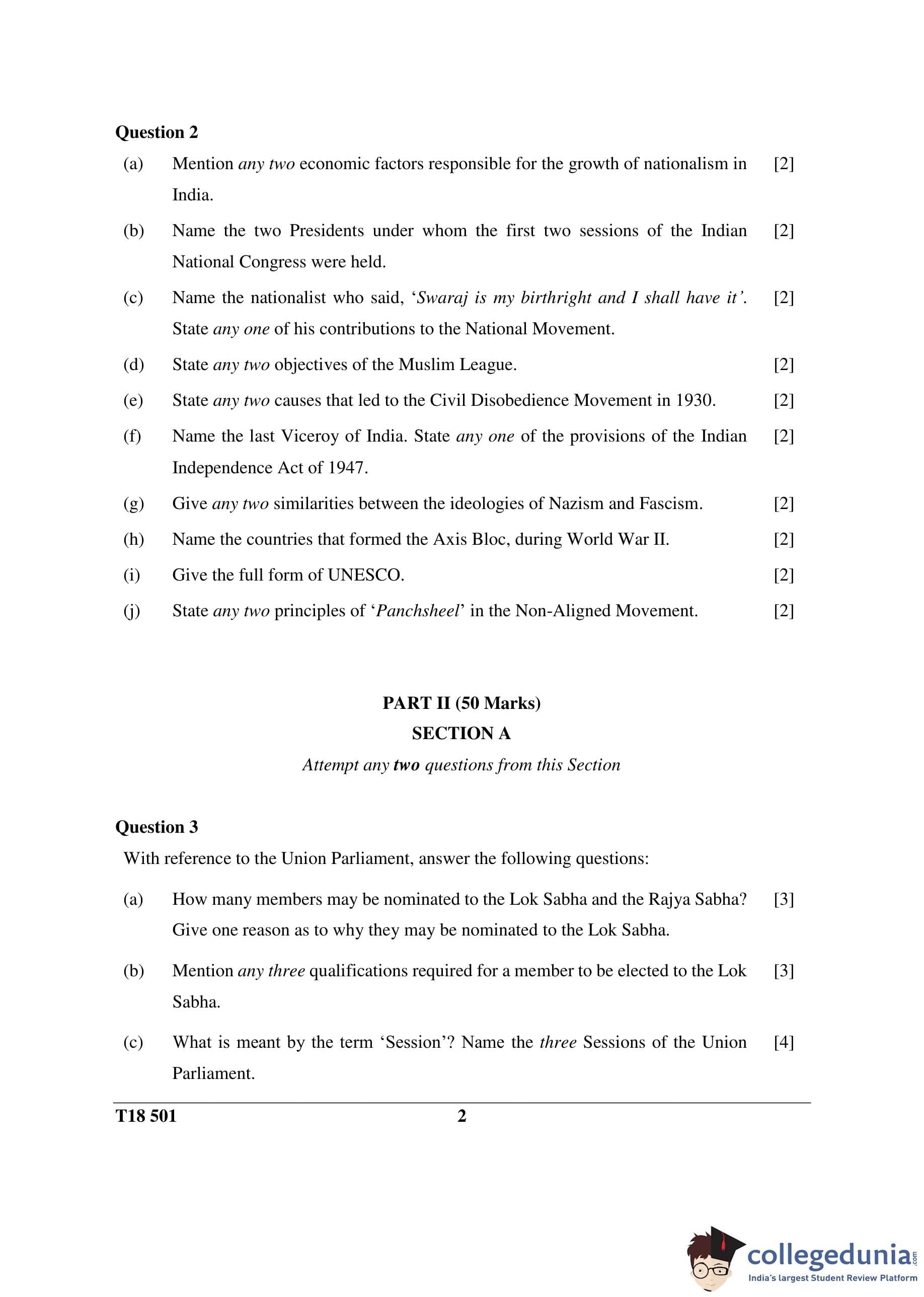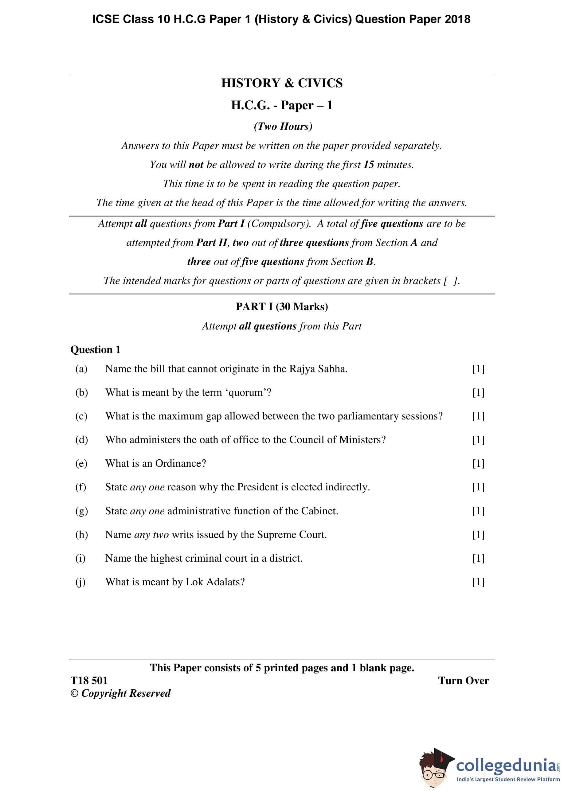 ICSE Class 10 H.C.G Paper 1 (History & Civics) Question Paper 2018 with Answer Key