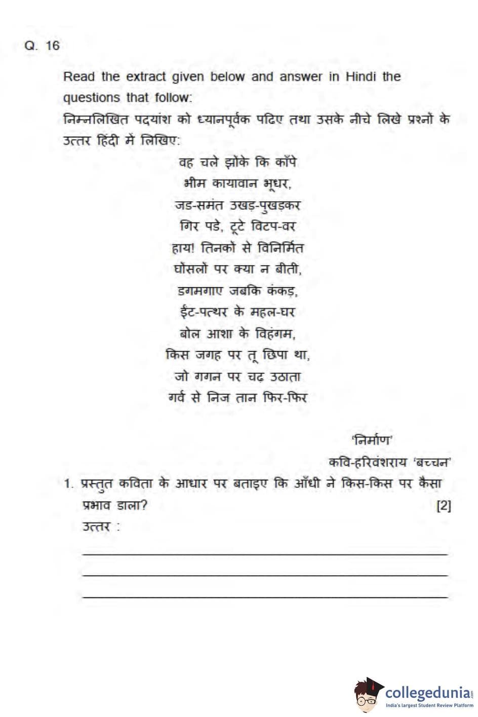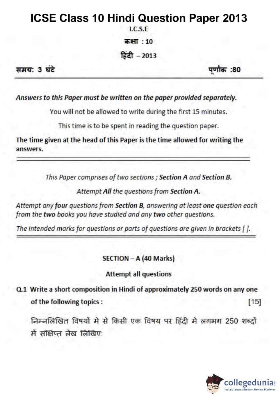ICSE Class 10 Hindi Question Paper 2013 with Answer Key pdf is available for download here. The exam was conducted by Council for the Indian School Certificate Examinations on March 13, 2013 in the Morning Session 11 AM to 2 PM. The question paper comprised a total of 16 questions divided among 2 sections.