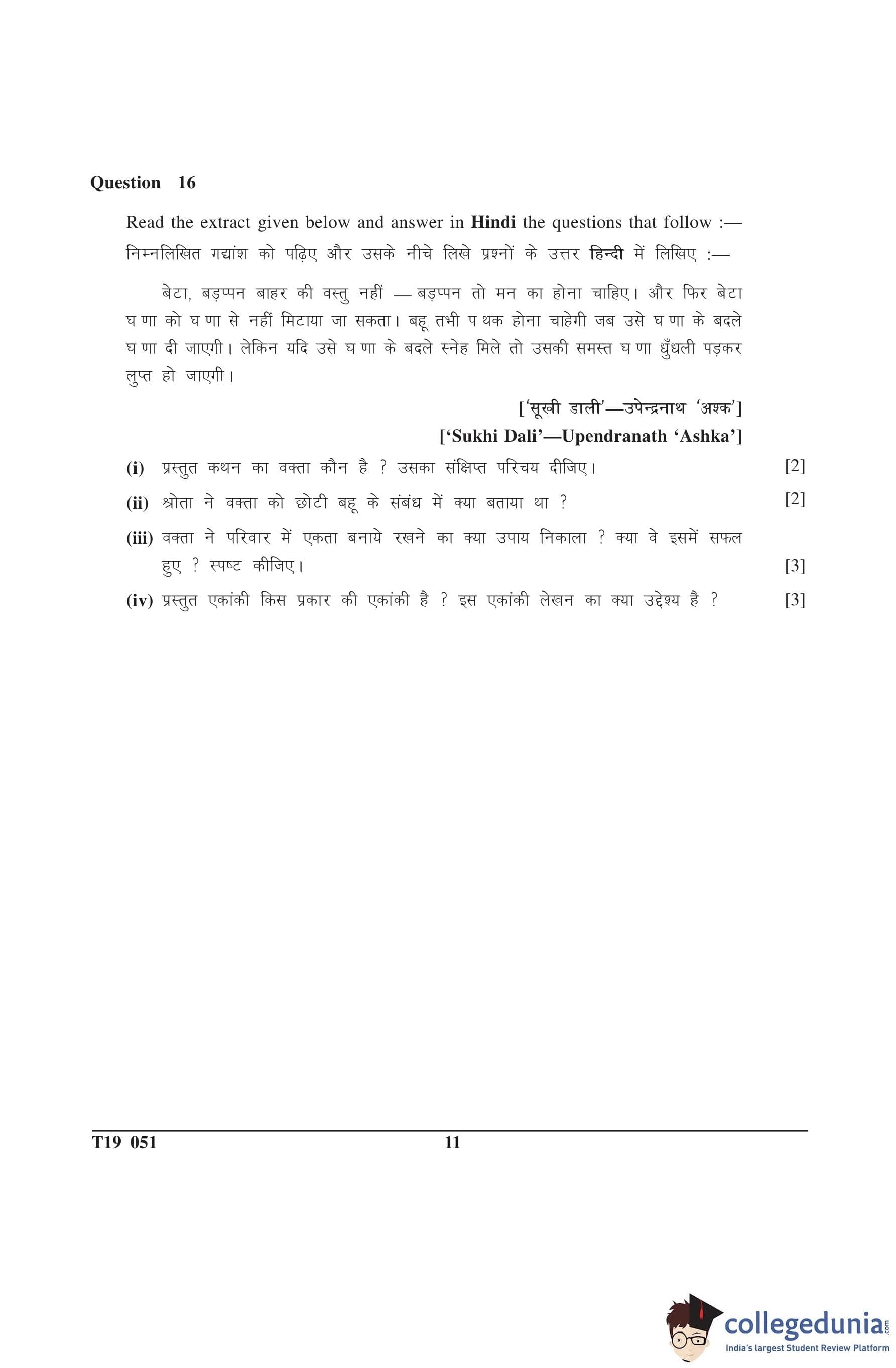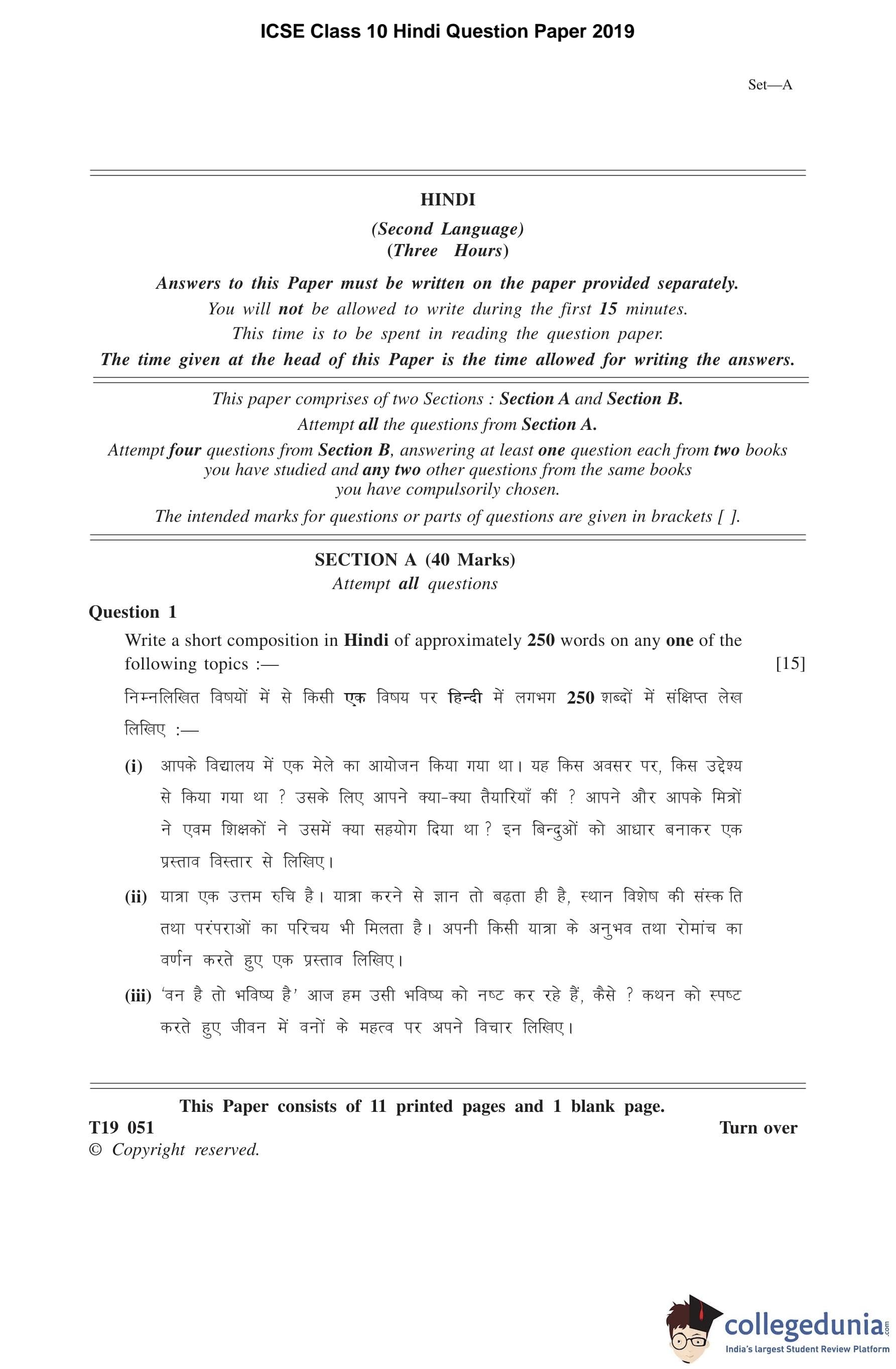 ICSE Class 10 Hindi Question Paper 2019 with Answer Key pdf is available for download here. The exam was conducted by Council for the Indian School Certificate Examinations on February 26, 2019 in the Morning Session 11 AM to 2 PM. The question paper comprised a total of 16 questions divided among 2 sections.
