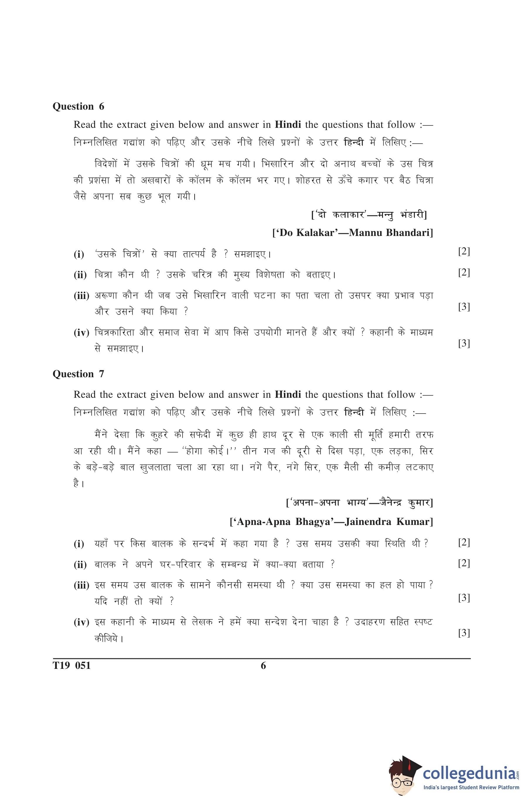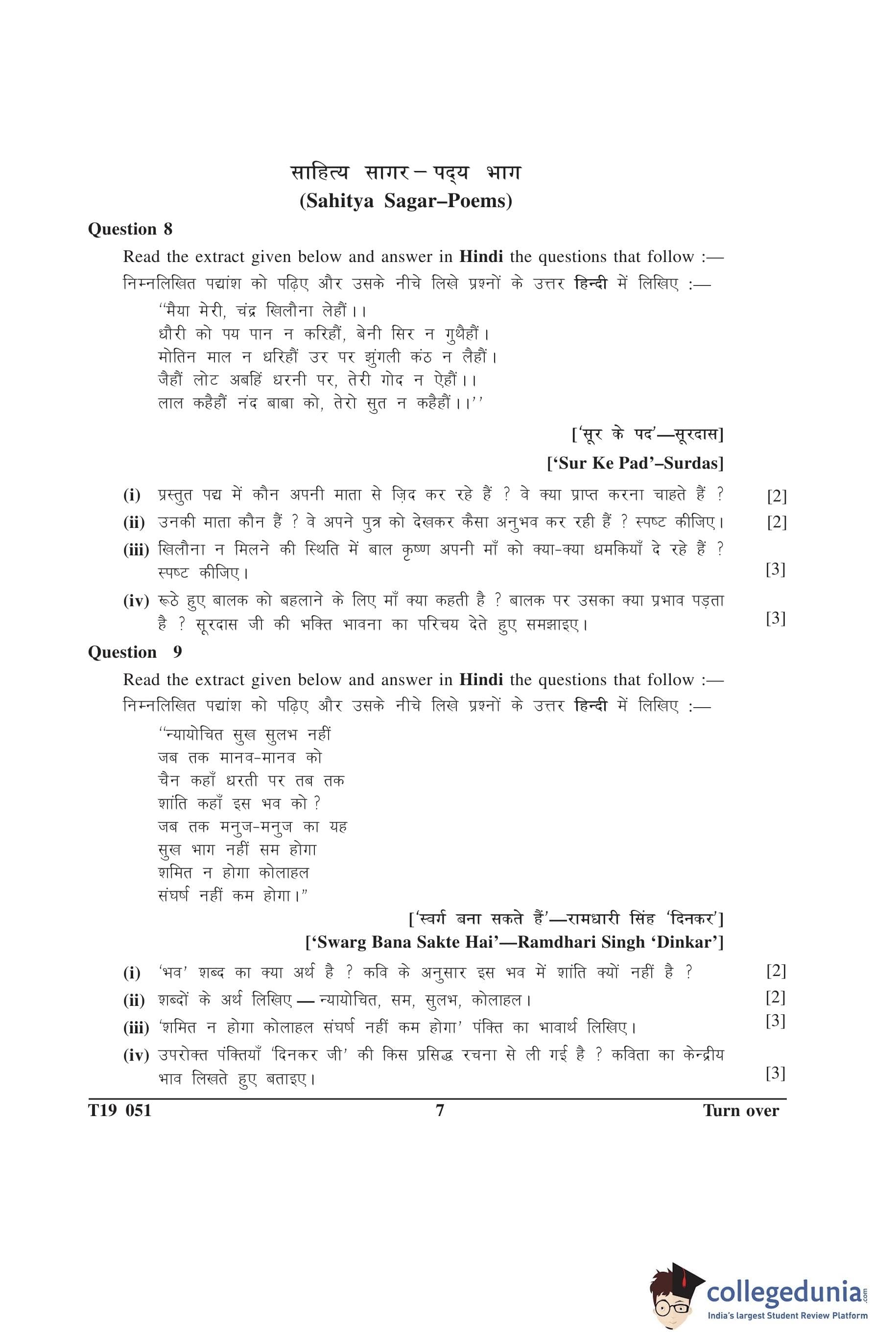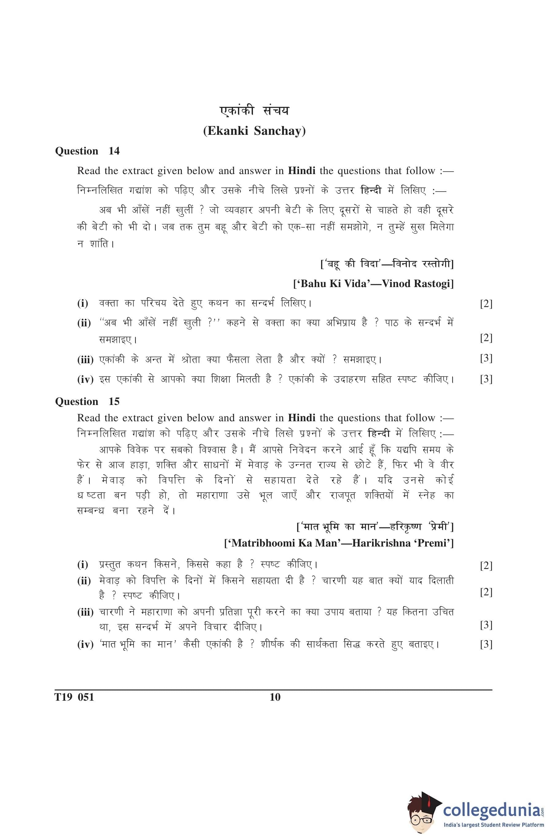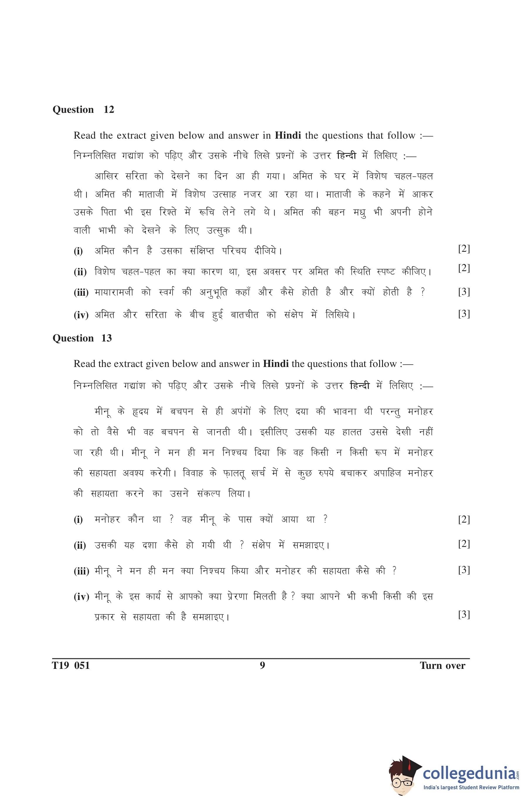 ICSE Class 10 Hindi Question Paper 2019 with Answer Key
