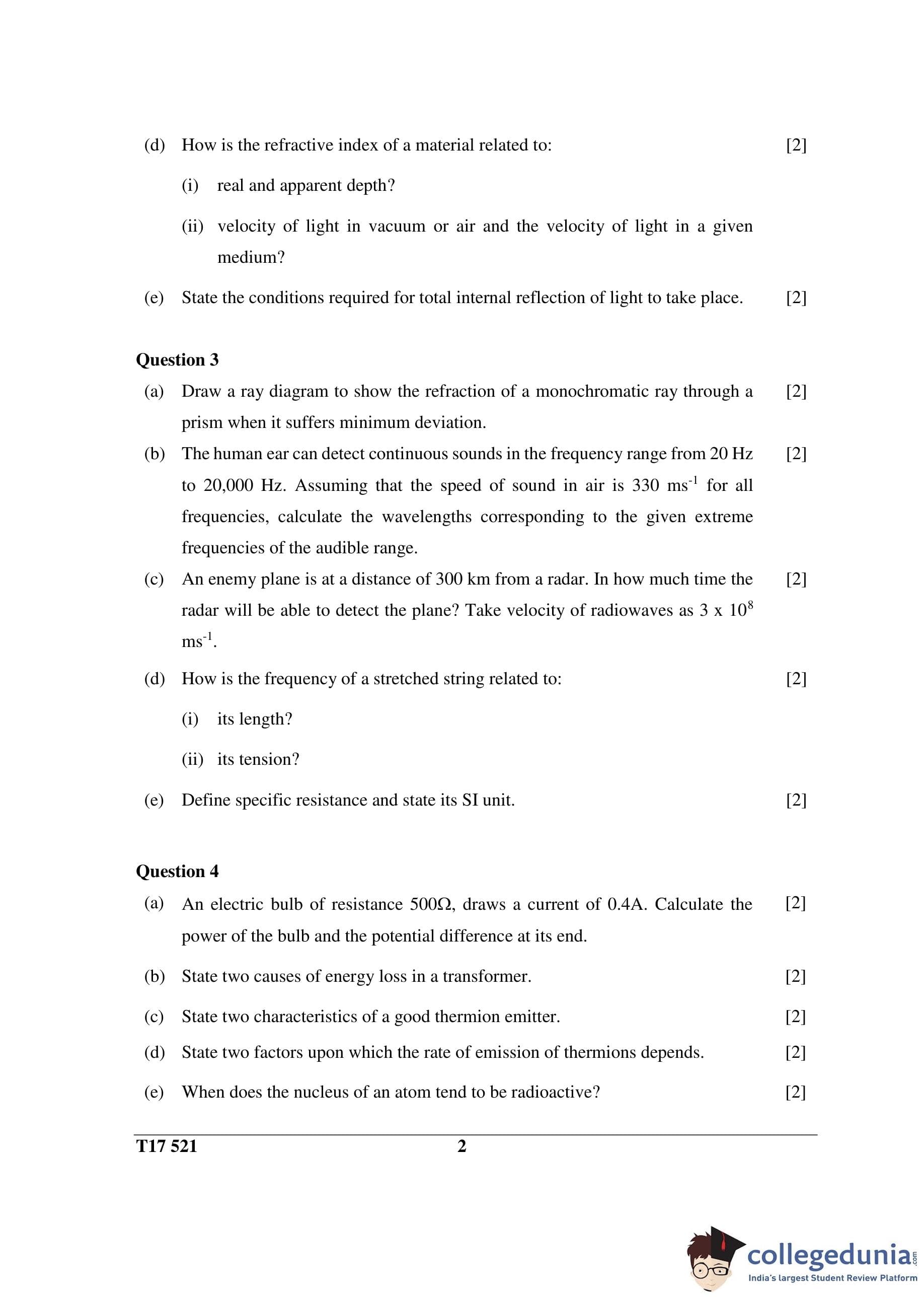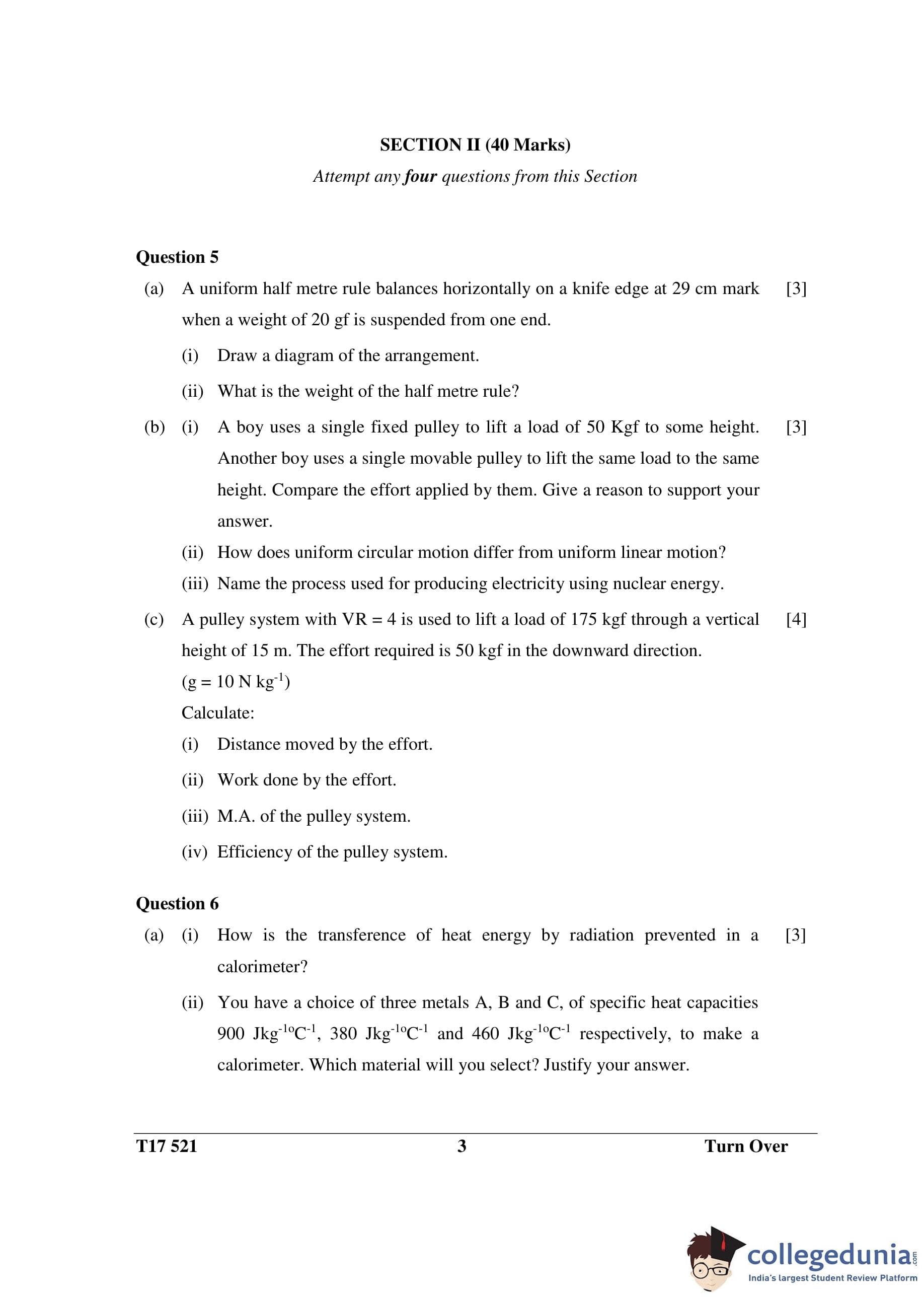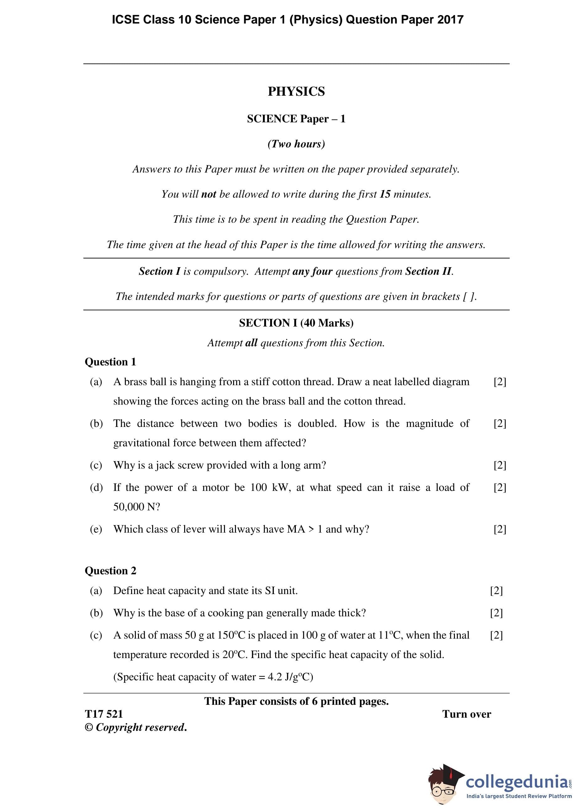 ICSE Class 10 Science Paper 1 (Physics) Question Paper 2017 with Answer Key pdf is available for download here. The exam was conducted by Council for the Indian School Certificate Examinations on March 27, 2017 in the Morning Session 11 AM to 1 PM. The question paper comprised a total of 10 questions divided among 2 sections.