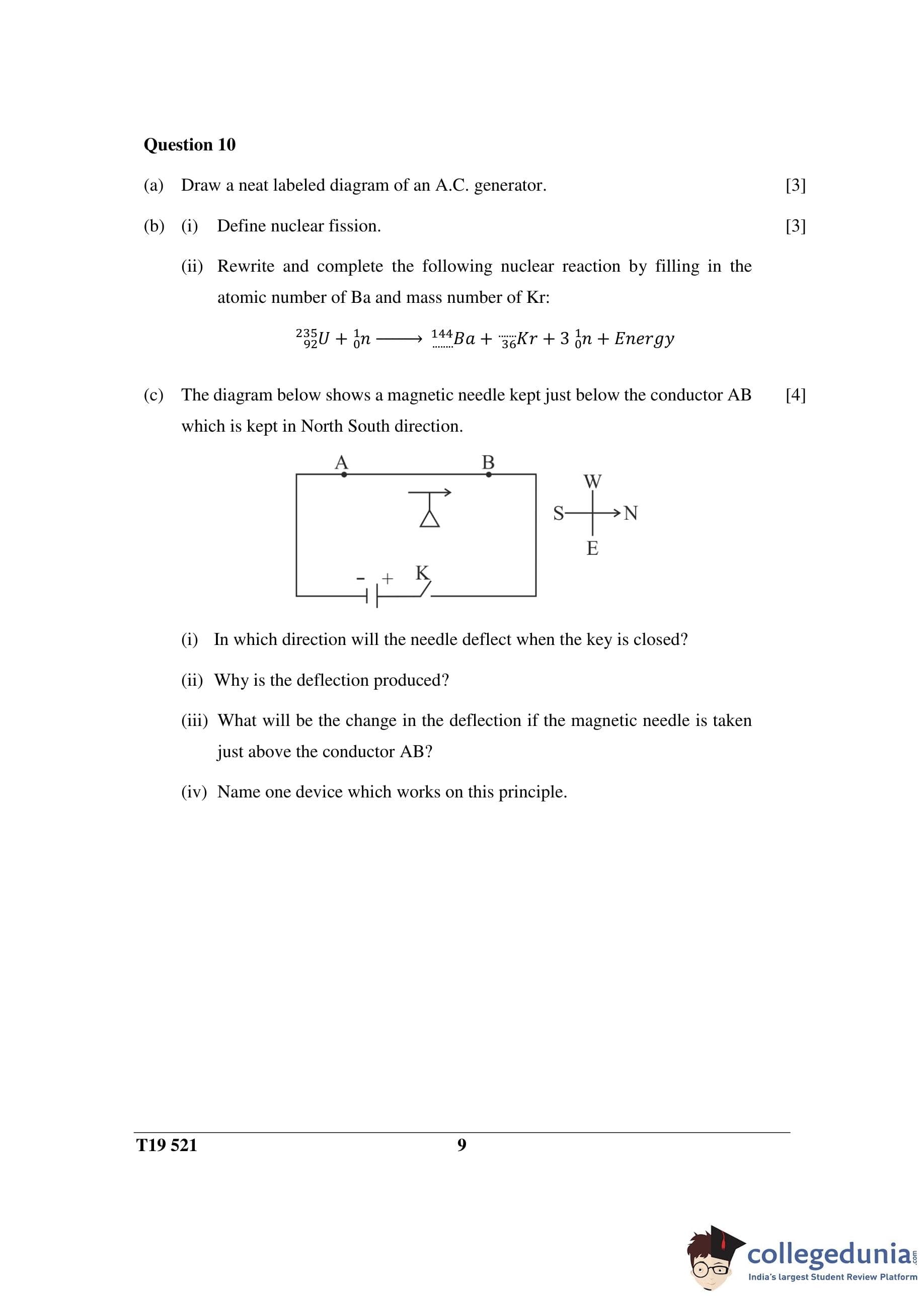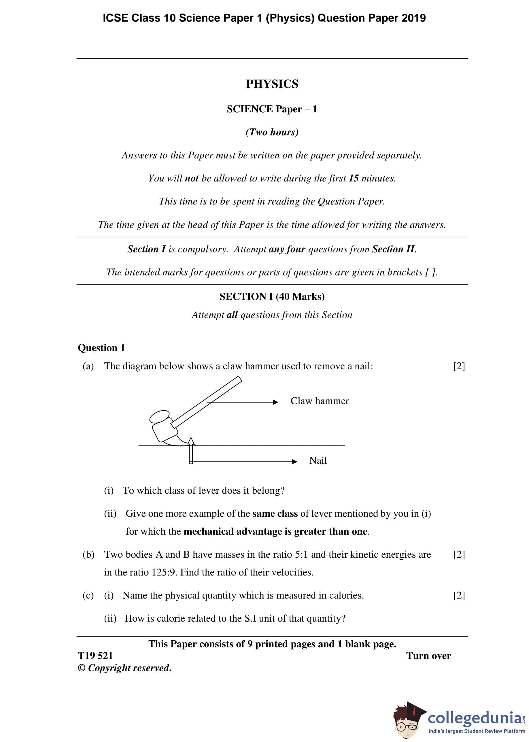 ICSE Class 10 Science Paper 1 (Physics) Question Paper 2019 with Answer Key pdf is available for download here. The exam was conducted by Council for the Indian School Certificate Examinations on March 5, 2019 in the Morning Session 11 AM to 1 PM. The question paper comprised a total of 10 questions divided among 2 sections.