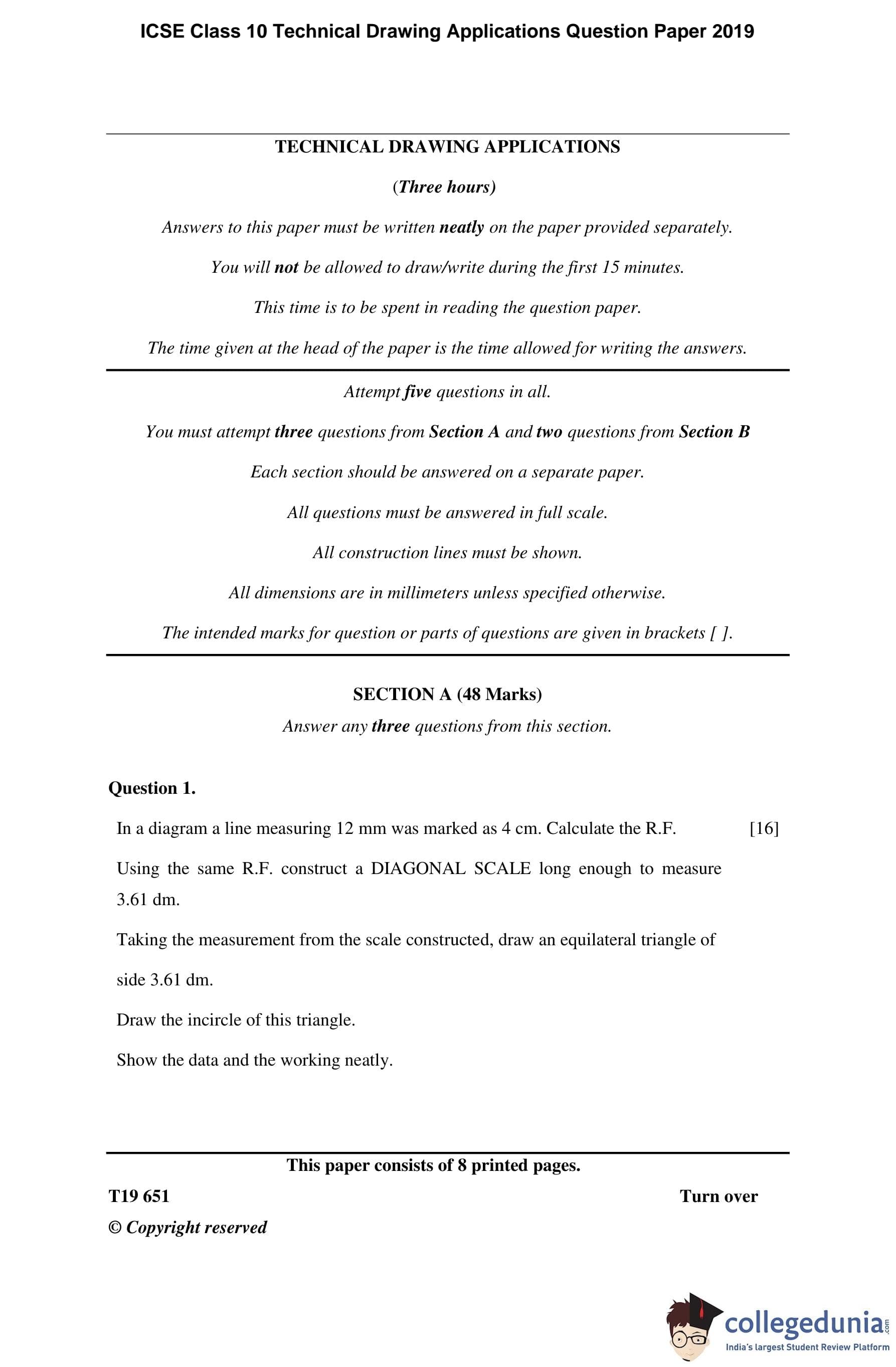 ICSE Class 10 Technical Drawing Applications Question Paper 2019 with Answer Key