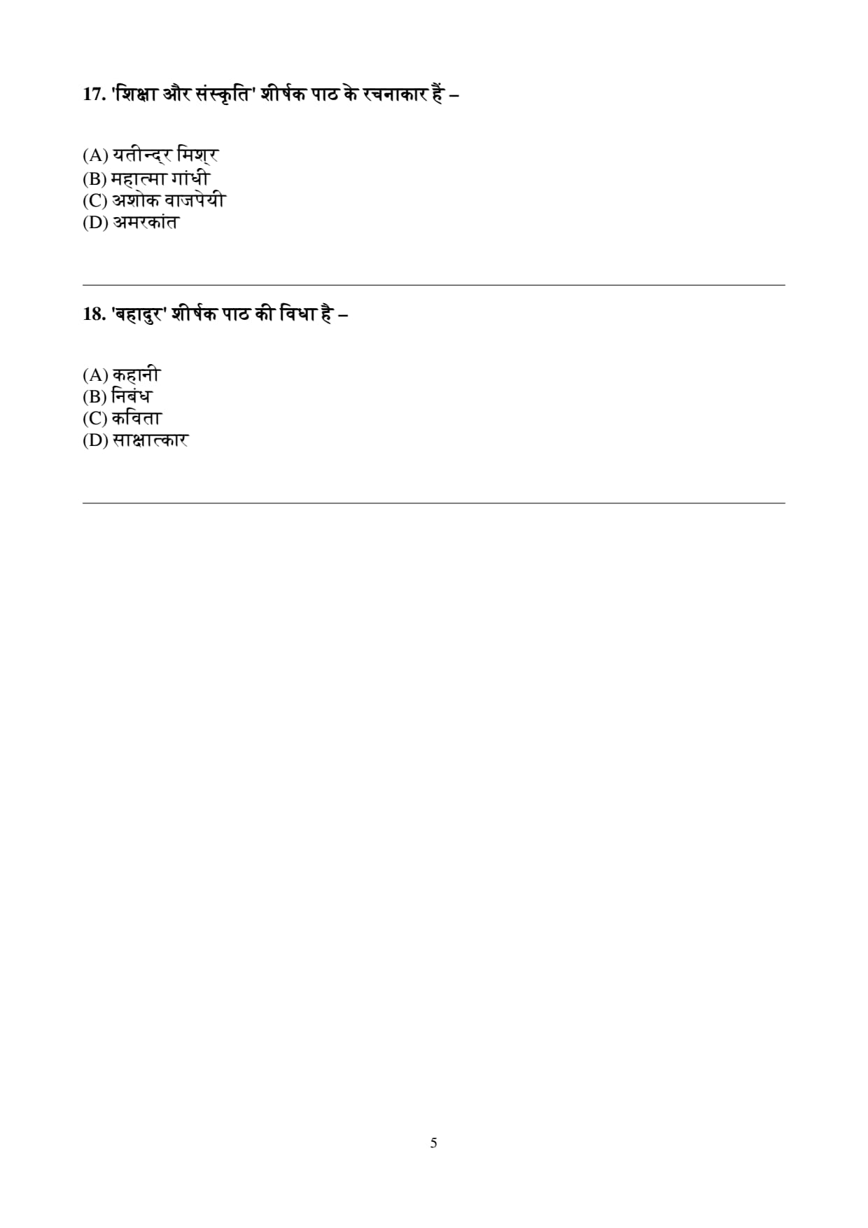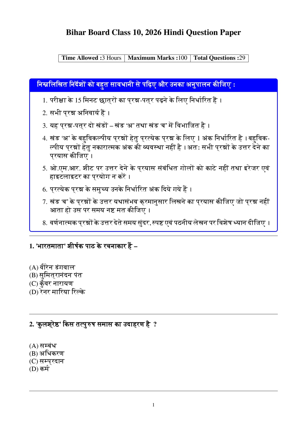 The official question paper of Bihar Board Class 10 Hindi Board Exam 2026 is provided below. Students can download the official paper in PDF format for reference.