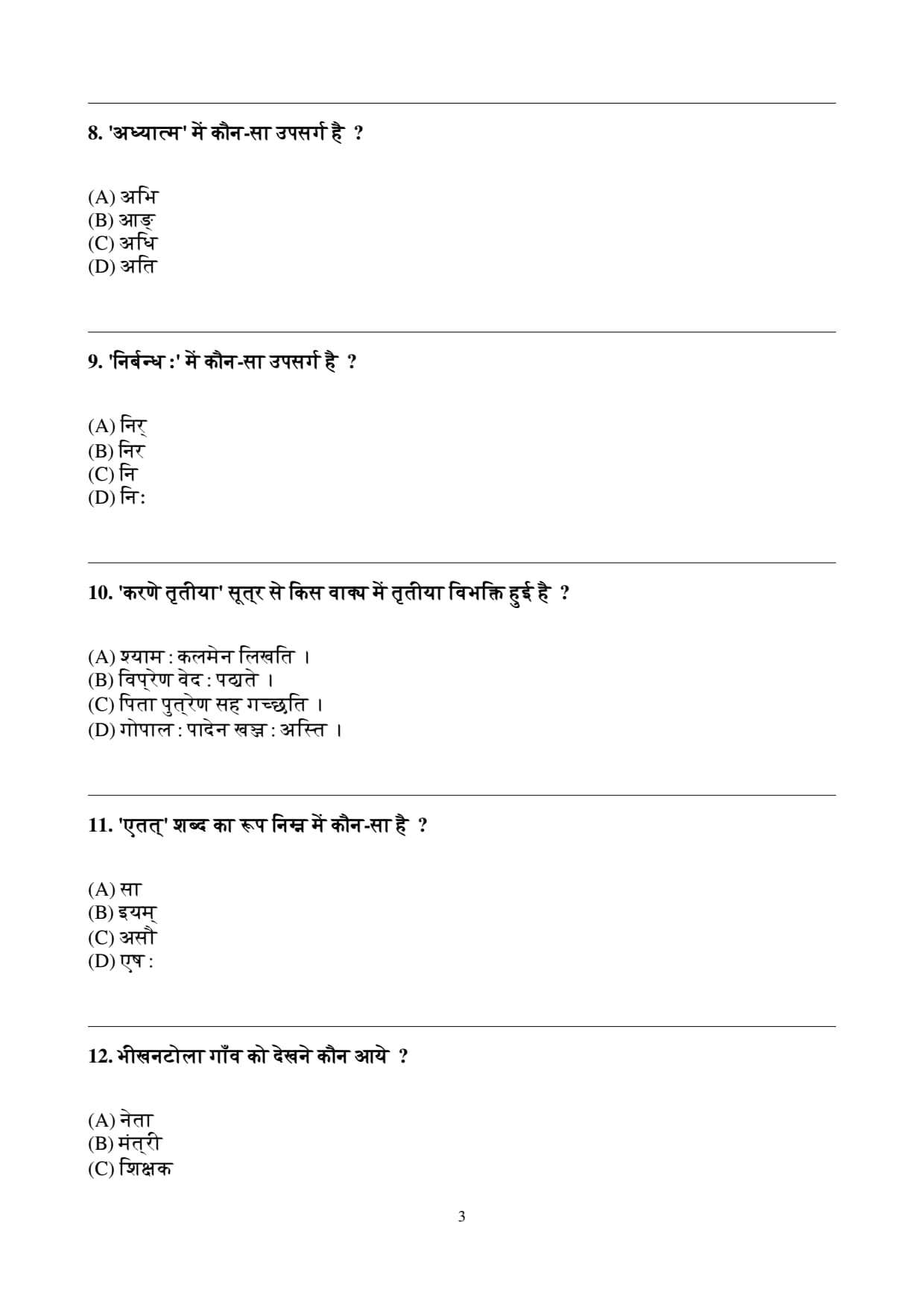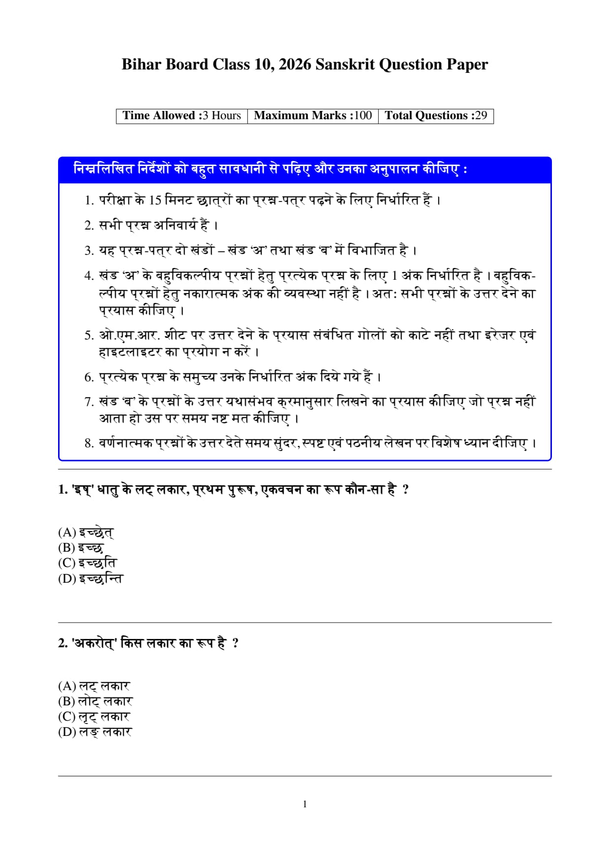 The official question paper of Bihar Board Class 10 Sanskrit Board Exam 2026 is provided below. Students can download the official paper in PDF format for reference.