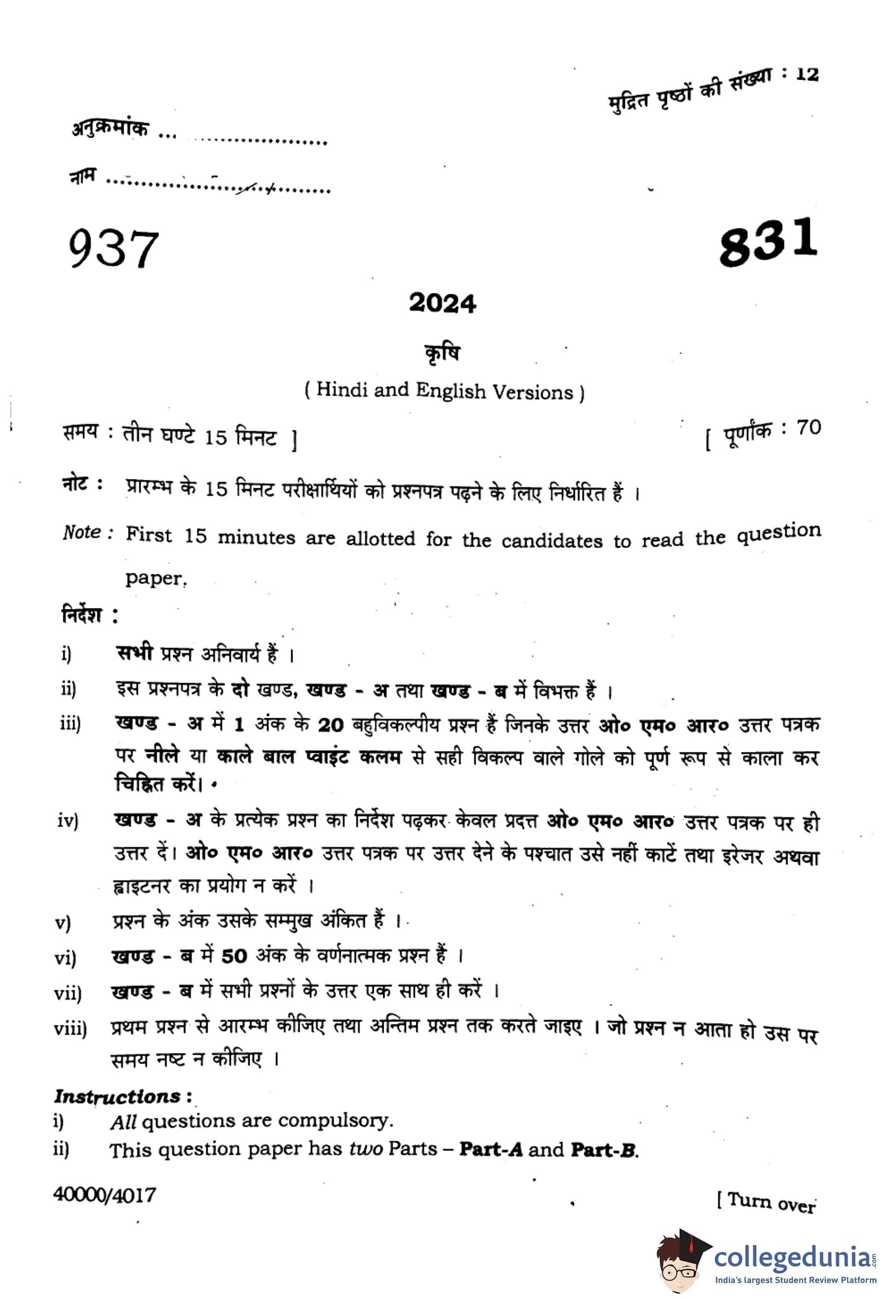 UP Board Class 10 Agriculture Question Paper 2024 PDF is available for download here. The Agriculture exam was conducted on February 29, 2024 in the Afternoon Shift from 2:00 PM to 5:15 PM. The total marks for the theory paper are 70. Students reported the paper to be easy to moderate.