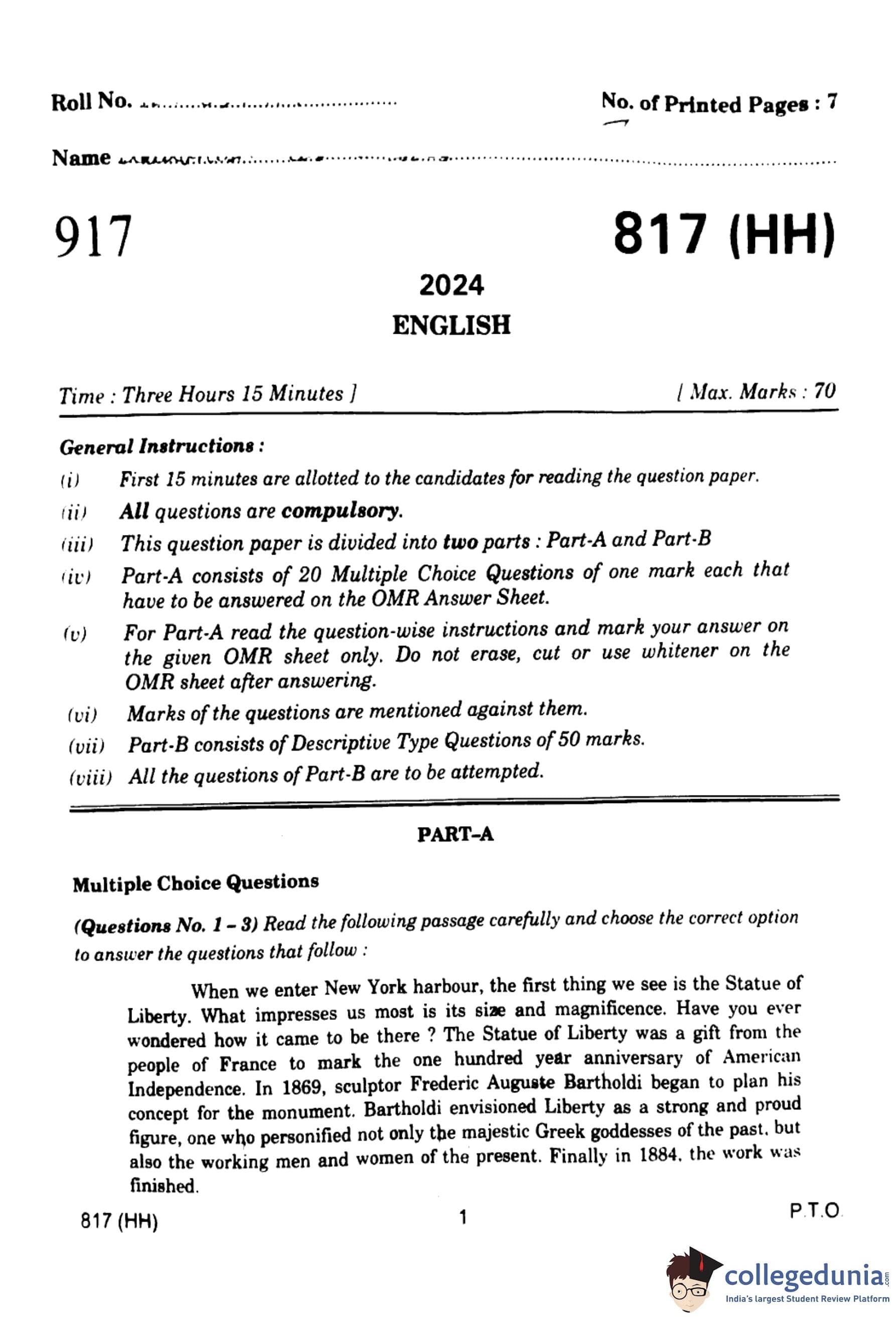 | UP Board Class 10 English (817 HH) 2024 Question Paper with Answer Key | Check Solutions |