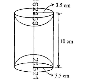 A wooden toy was made by scooping out a hemisphere from each end of a solid cylinder as shown in the figure. If the height of the cylinder is 10 cm and its base is of radius 3.5 cm, find the total surface area of the toy. (Use \(\pi = \frac{22}{7}\))