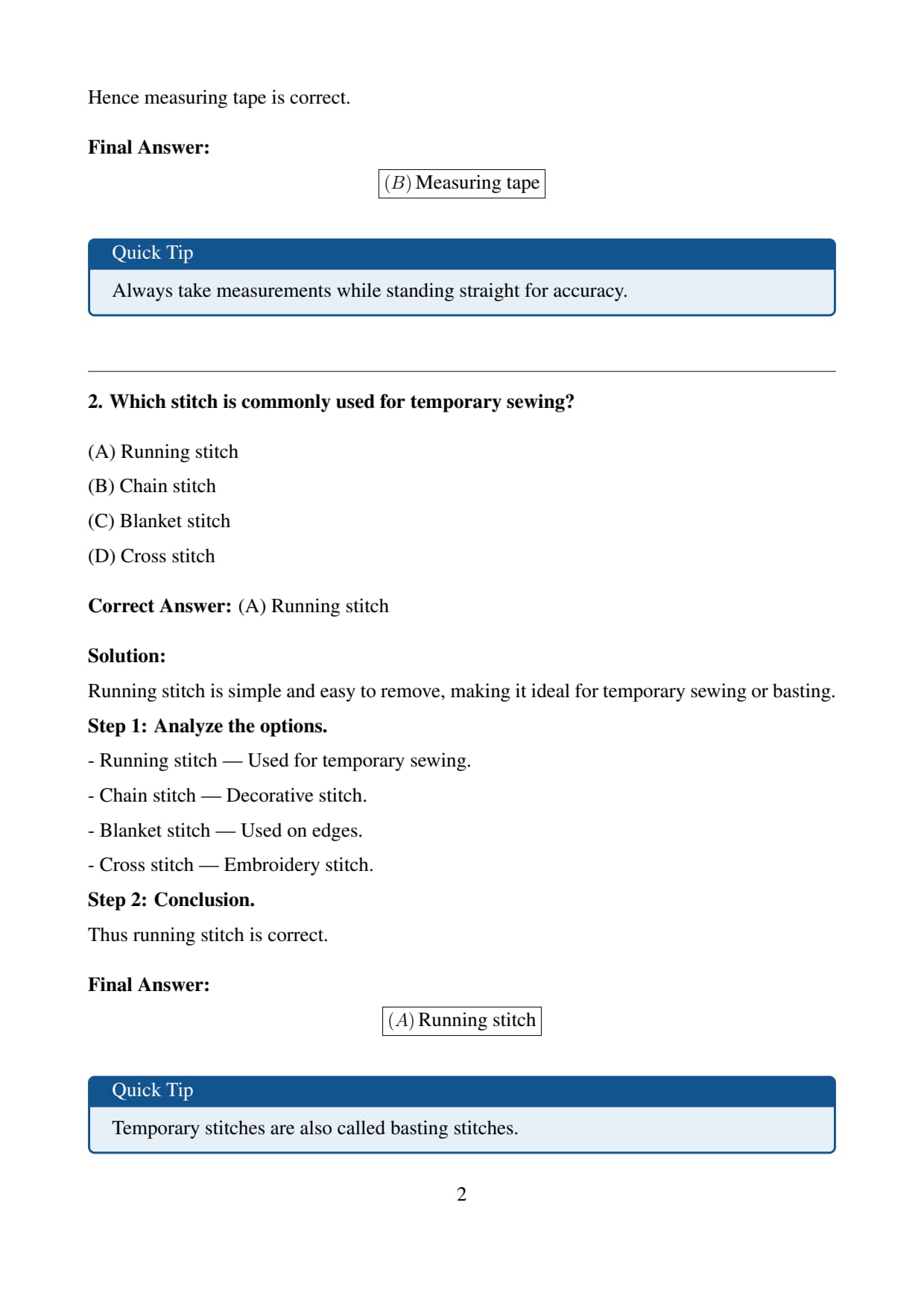 Final Answer: \[ \boxed{(A) \, Running stitch} \] Quick Tip: Temporary stitches are also called basting stitches.