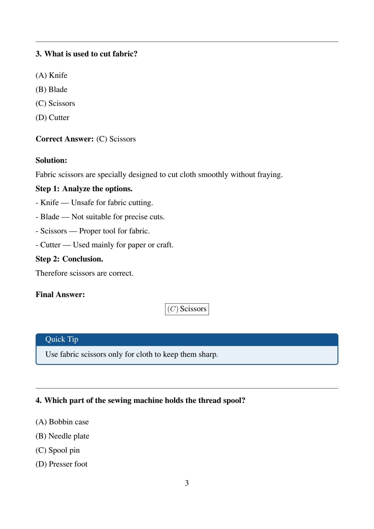 Final Answer: \[ \boxed{(C) \, Scissors} \] Quick Tip: Use fabric scissors only for cloth to keep them sharp.