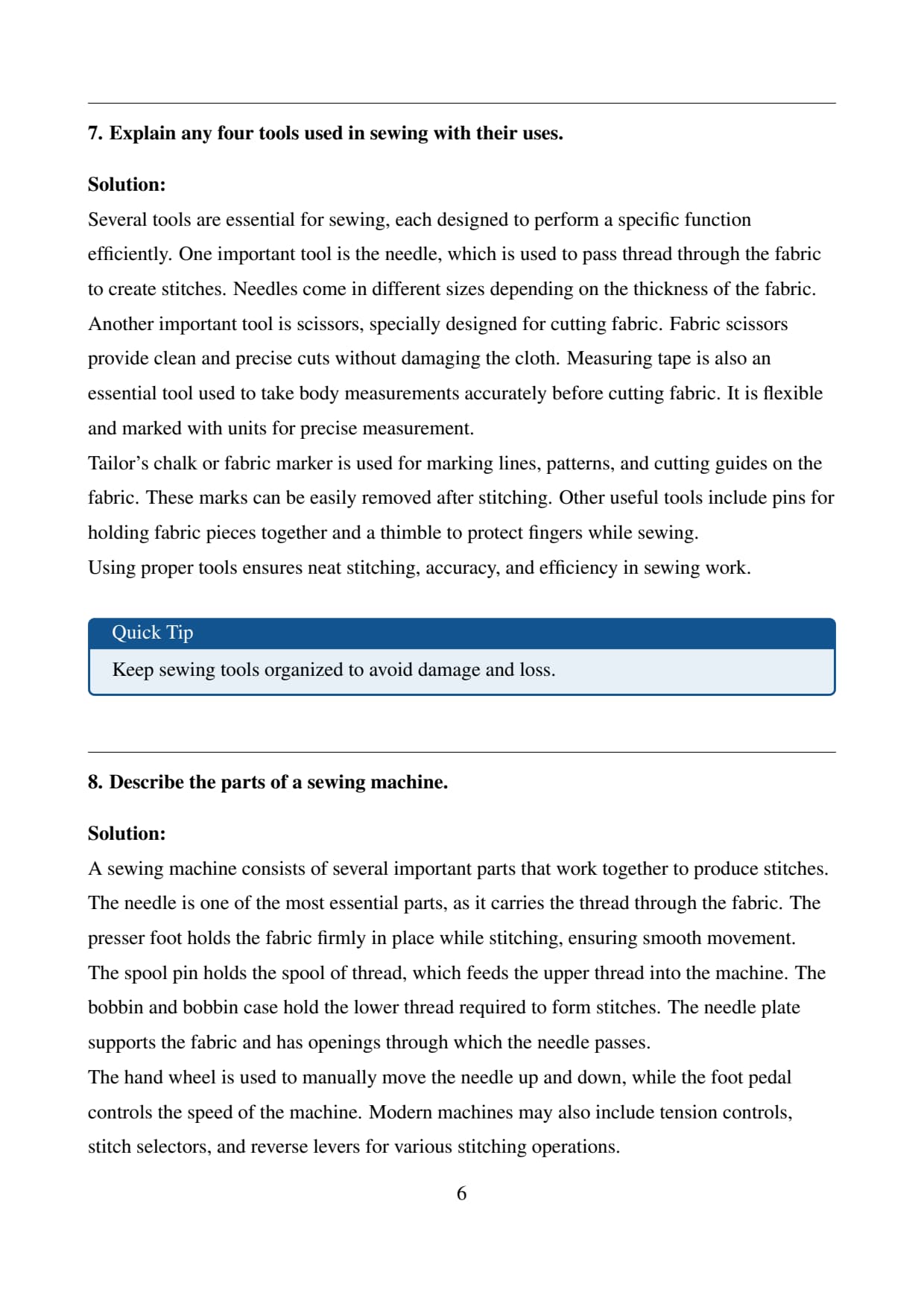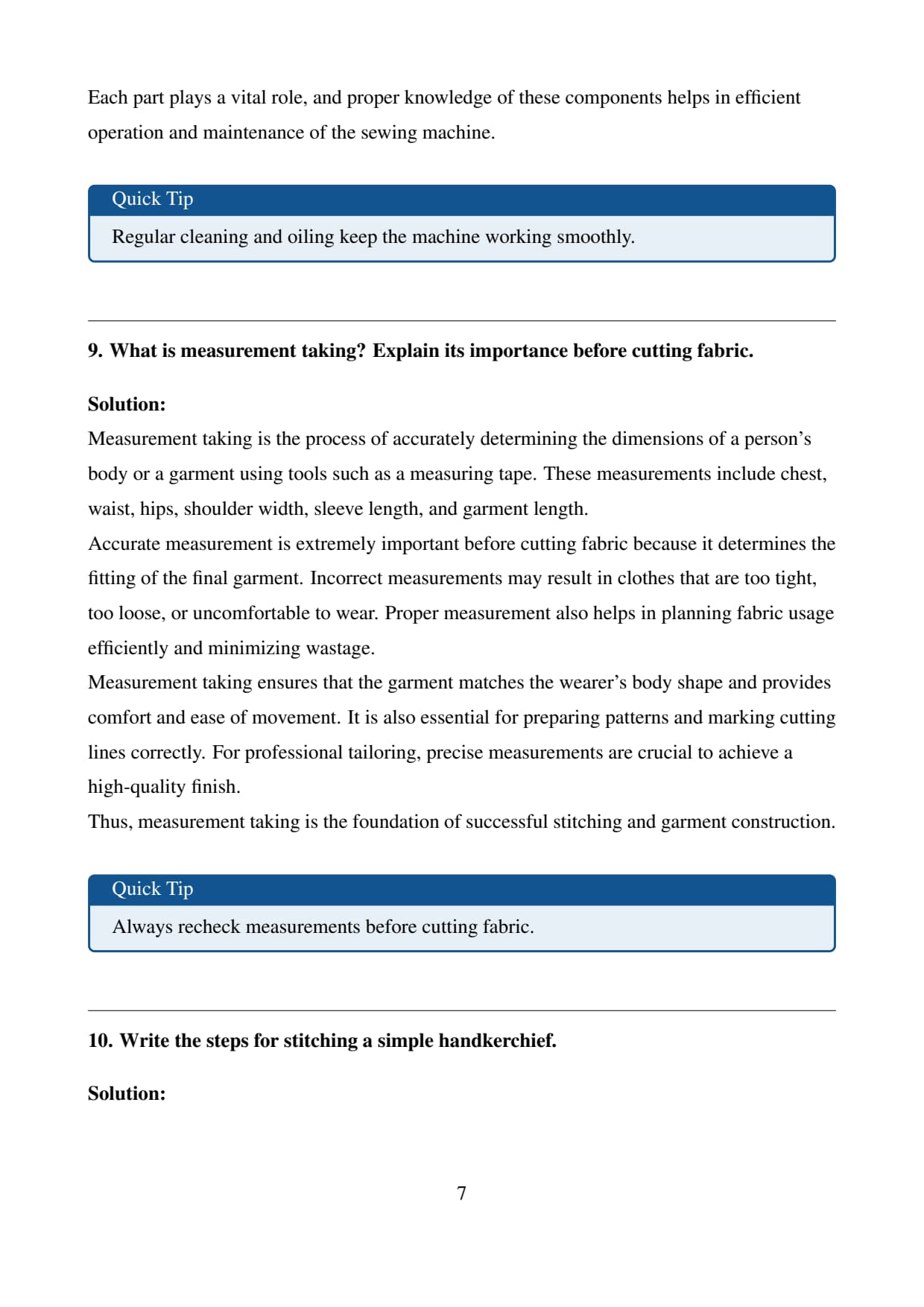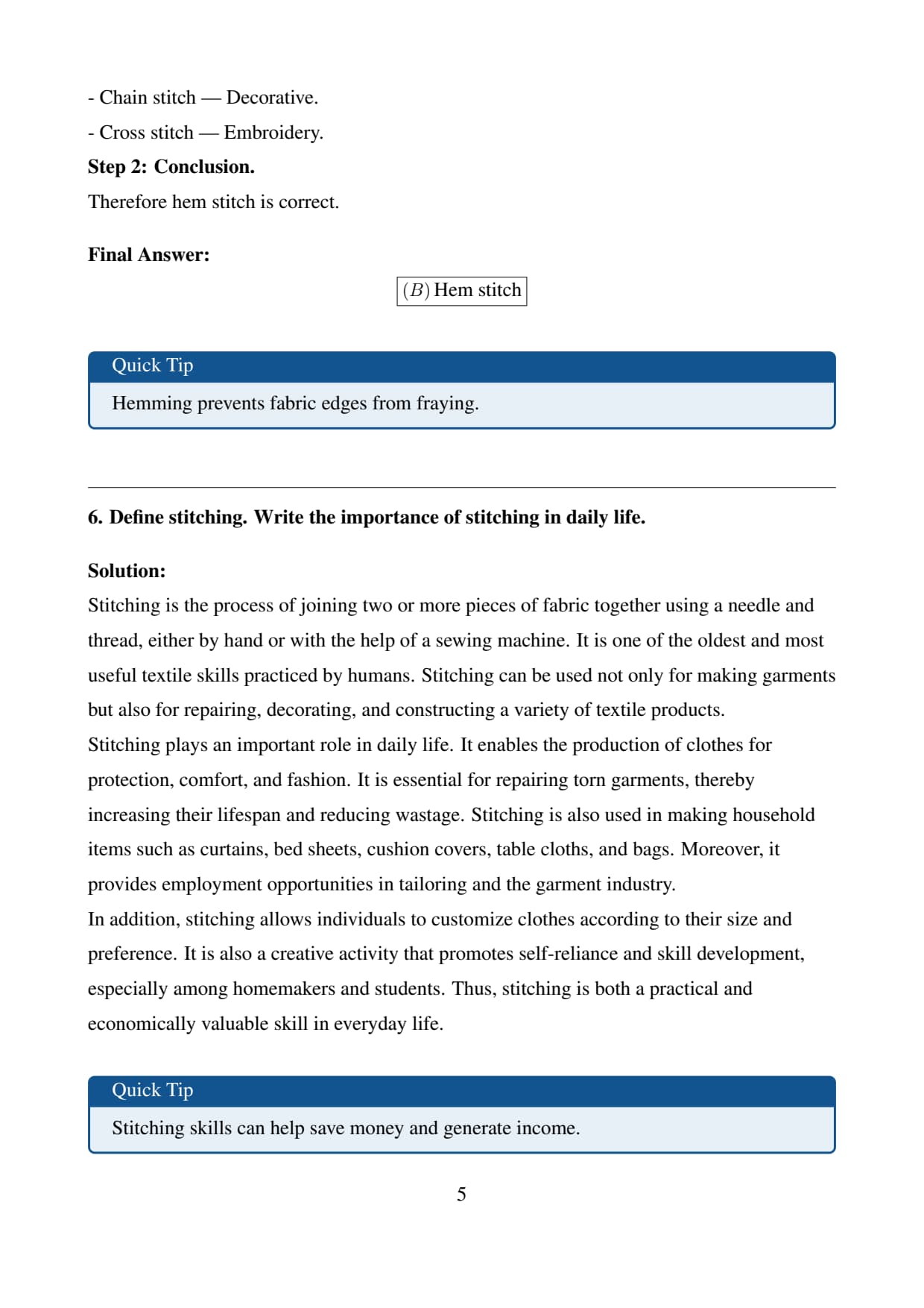 In addition, stitching allows individuals to customize clothes according to their size and preference. It is also a creative activity that promotes self-reliance and skill development, especially among homemakers and students. Thus, stitching is both a practical and economically valuable skill in everyday life. Quick Tip: Stitching skills can help save money and generate income.