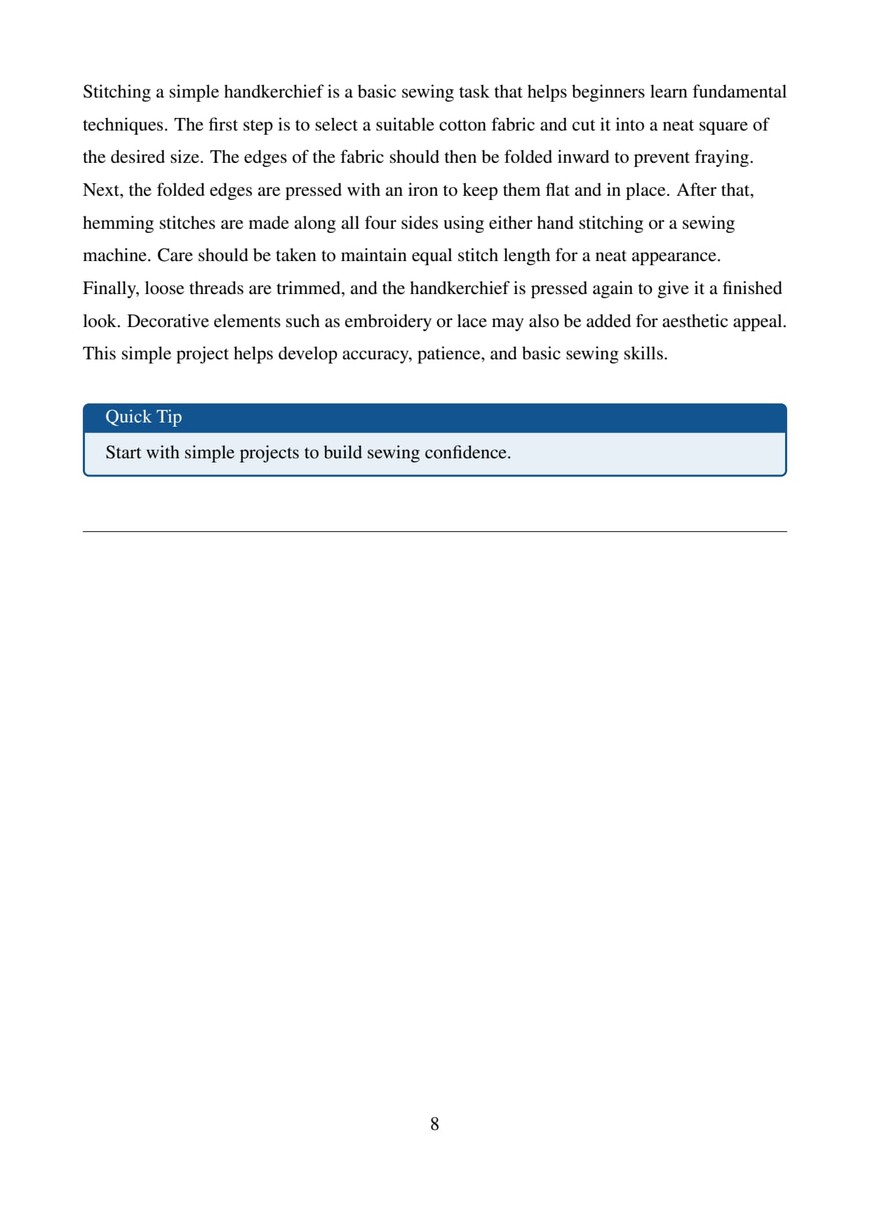 This simple project helps develop accuracy, patience, and basic sewing skills. Quick Tip: Start with simple projects to build sewing confidence.