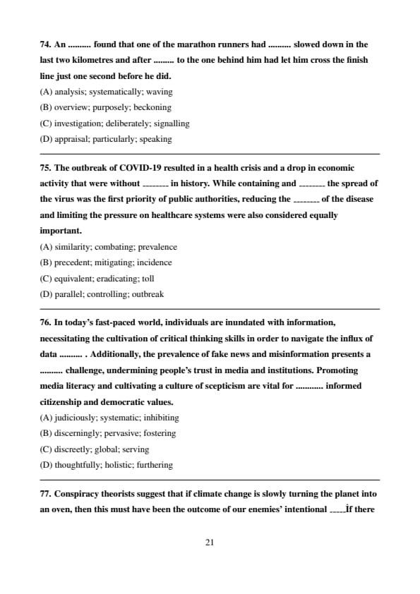 In today's fast-paced world, individuals are inundated with information, necessitating the cultivation of critical thinking skills in order to navigate the influx of data .......... . Additionally, the prevalence of fake news and misinformation presents a .......... challenge, undermining people’s trust in media and institutions. Promoting media literacy and cultivating a culture of scepticism are vital for ............ informed citizenship and democratic values.