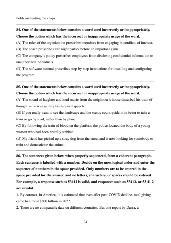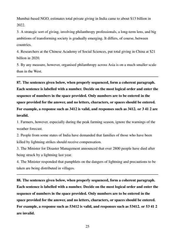 The sentences given below, when properly sequenced, form a coherent paragraph. Each sentence is labelled with a number. Decide on the most logical order and enter the sequence of numbers in the space provided. Only numbers are to be entered in the space provided for the answer, and no letters, characters, or spaces should be entered. For example, a response such as 53412 is valid, and responses such as 53412. or 53 41 2 are invalid.