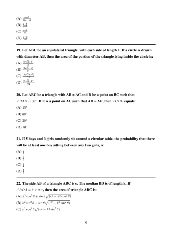 Let ABC be an equilateral triangle, with each side of length \(k\). If a circle is drawn with diameter AB, then the area of the portion of the triangle lying inside the circle is: