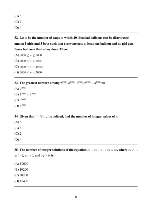 Let \( n \) be the number of ways in which 20 identical balloons can be distributed among 5 girls and 3 boys such that everyone gets at least one balloon and no girl gets fewer balloons than a boy does. Then: