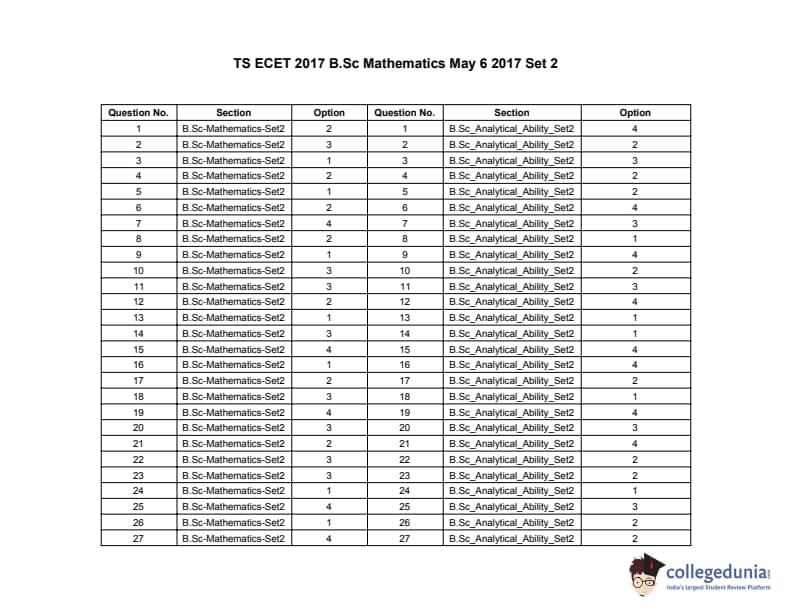 | TS ECET 2017 B.Sc Mathematics Question Paper PDF | TS ECET 2017 B.Sc Mathematics Answer Key PDF |