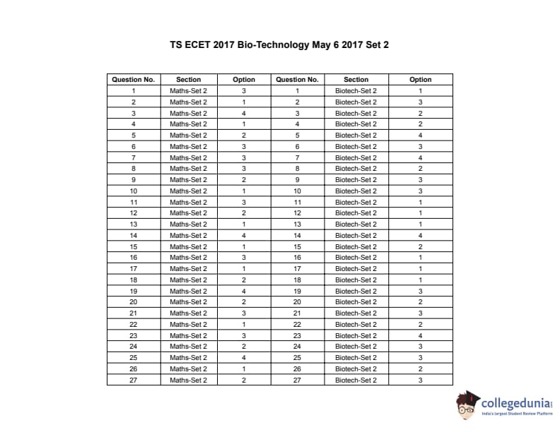 | TS ECET 2017 Bio Technology Question Paper PDF | TS ECET 2017 Bio Technology Answer Key PDF |