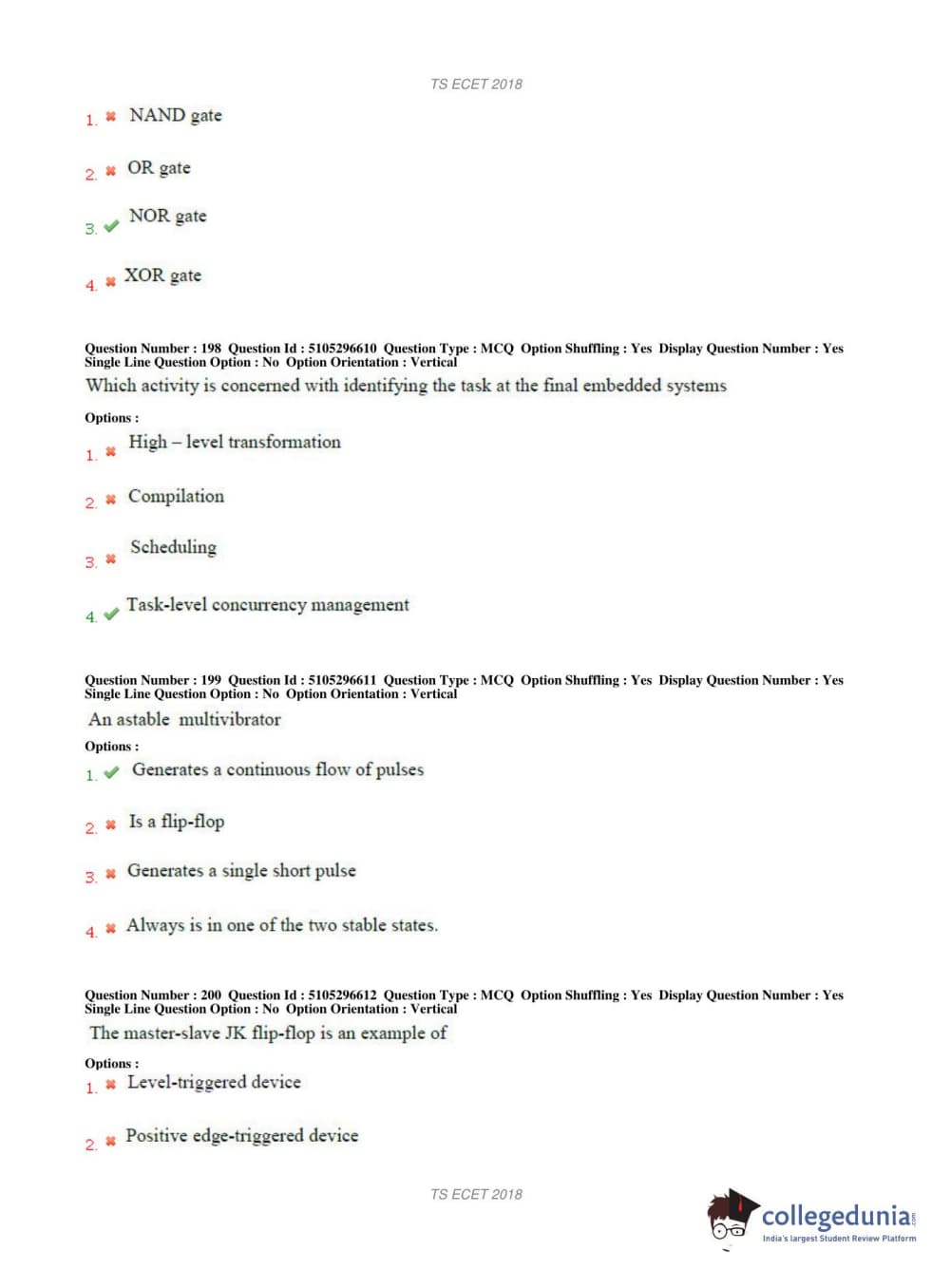 TS ECET 2018 ELECTRONICS & COMMUNICATION ENGINEERING Question paper with answer key pdf conducted on May 9, 2018 in Shift 1 10 AM to 1 PM is available for download. The exam was successfully organized by Jawaharlal Nehru Technological University Hyderabad. The question paper comprised a total of 200 questions.