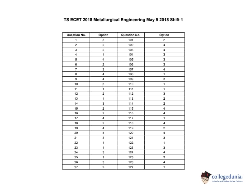 TS ECET 2018 METALLURGICAL ENGINEERING Question paper with answer key pdf conducted on May 9, 2018 in Shift 1 10 AM to 1 PM is available for download. The exam was successfully organized by Jawaharlal Nehru Technological University Hyderabad. The question paper comprised a total of 200 questions.