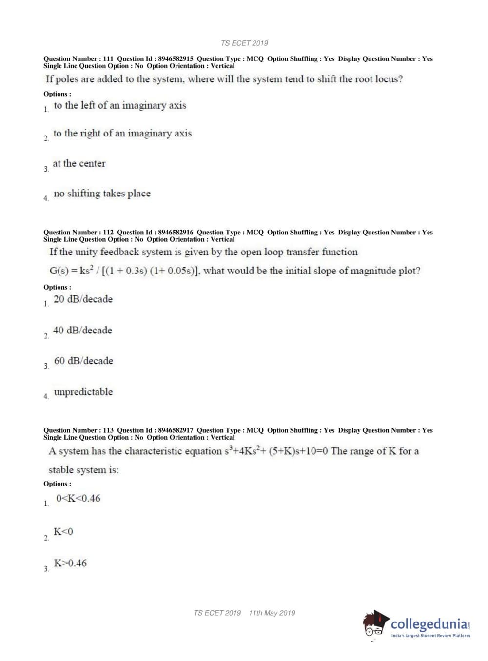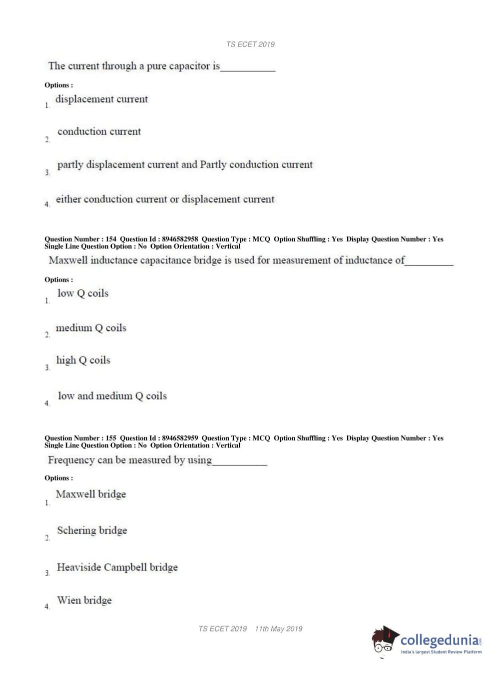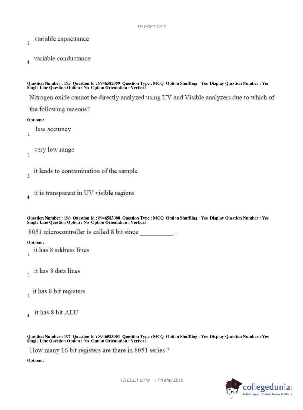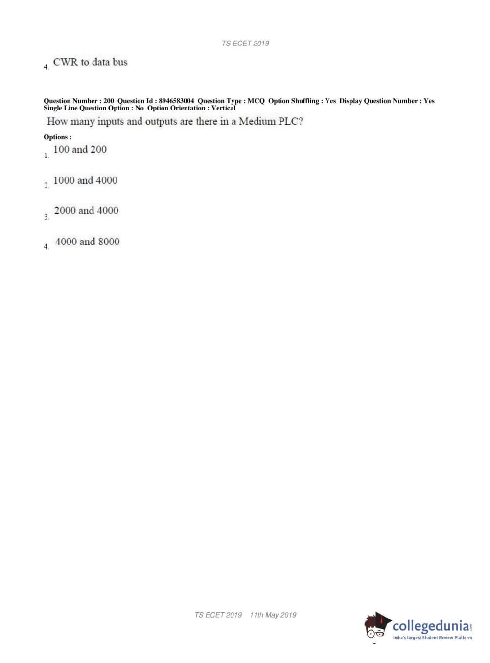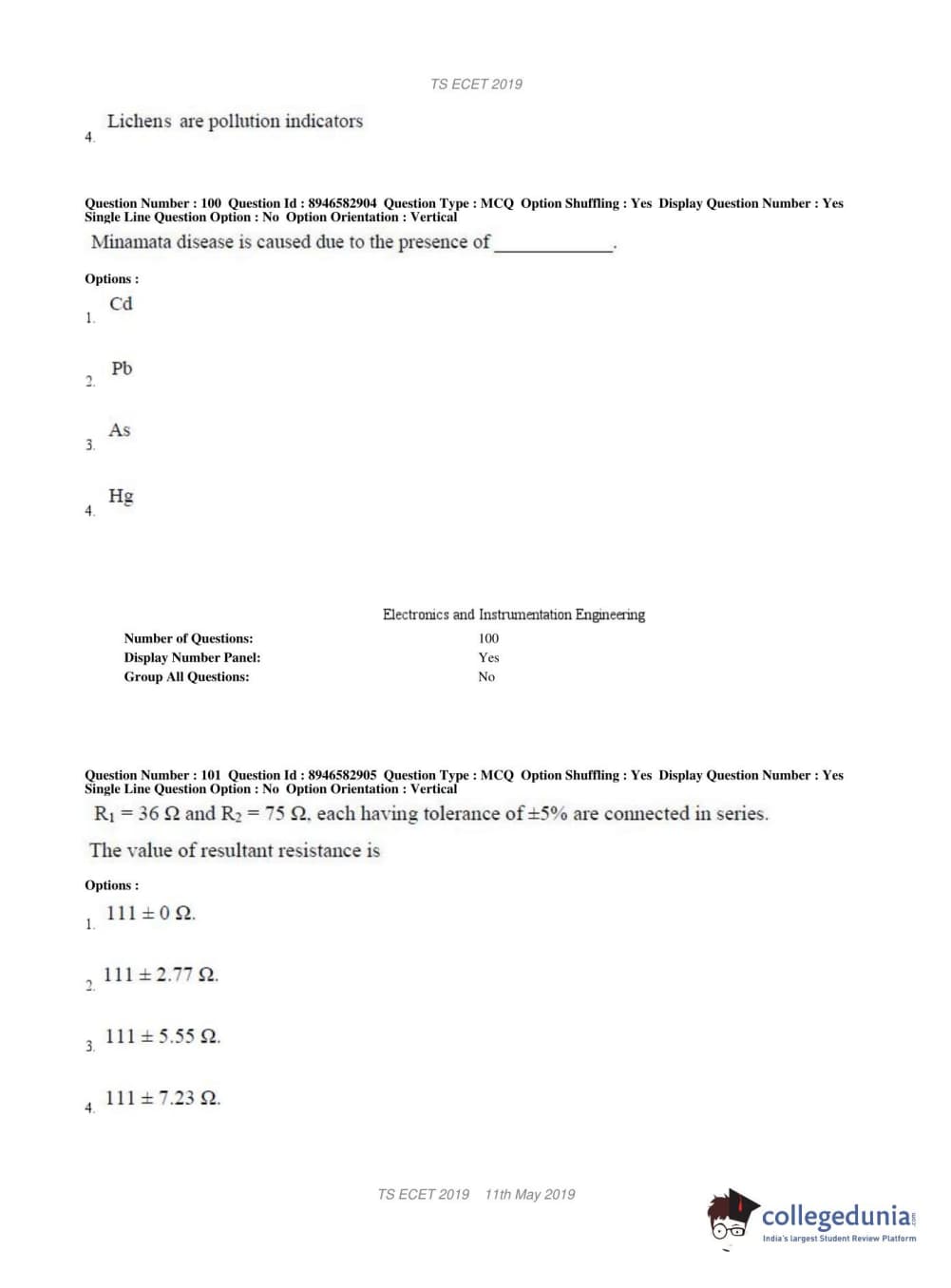 TS ECET 2019 ELECTRONICS & INSTRUMENTATION ENGINEERING Question paper with answer key pdf conducted on May 11, 2019 in Shift 1 is available for download. The exam was successfully organized by Jawaharlal Nehru Technological University Hyderabad. The question paper comprised a total of 200 questions.