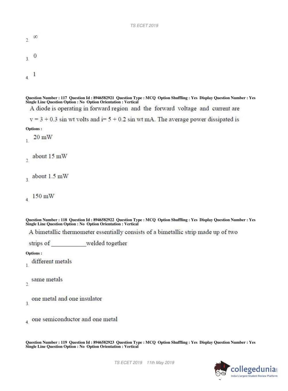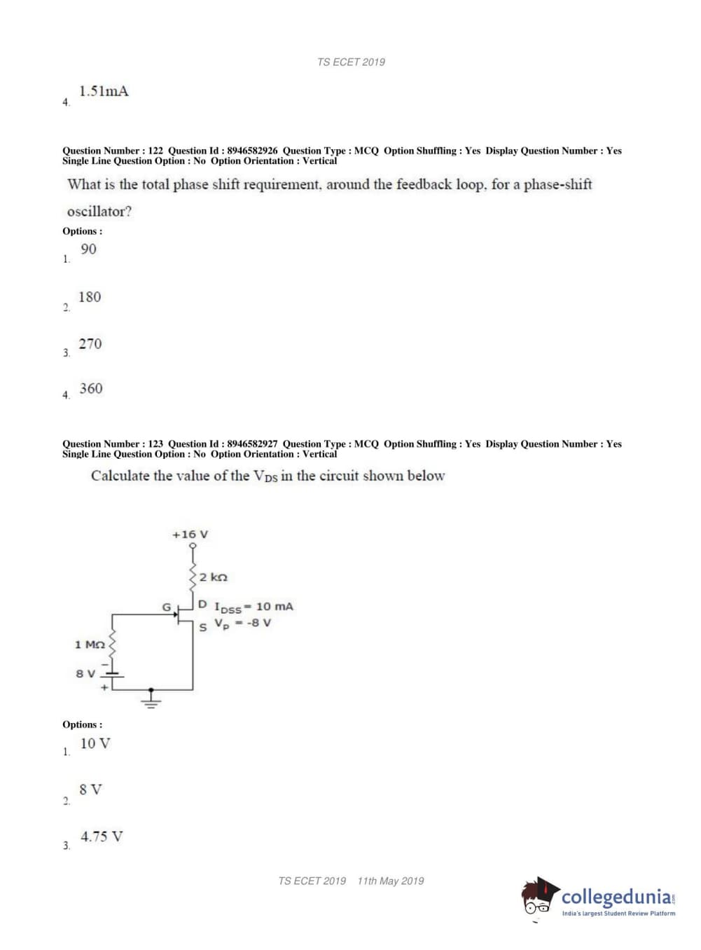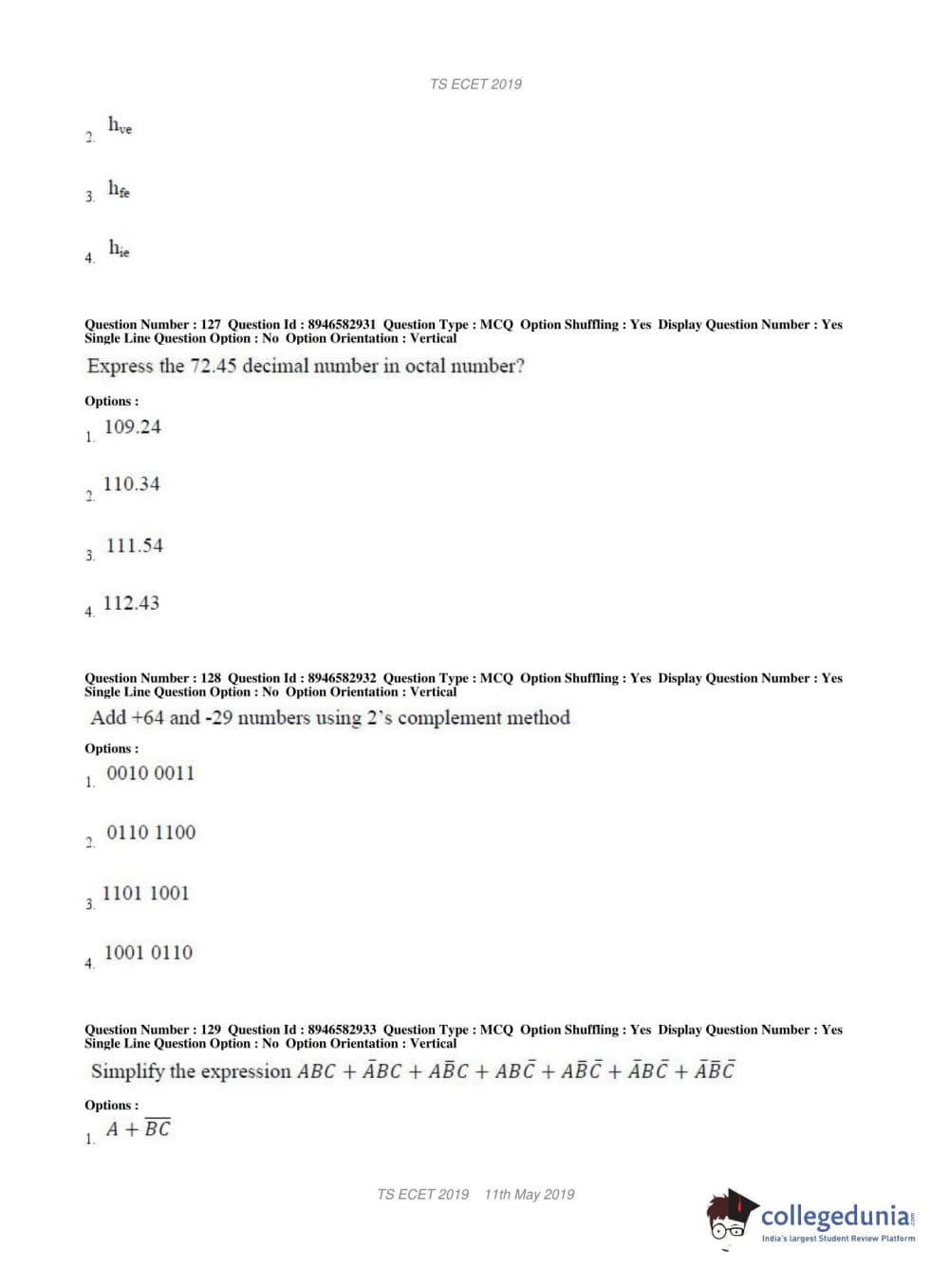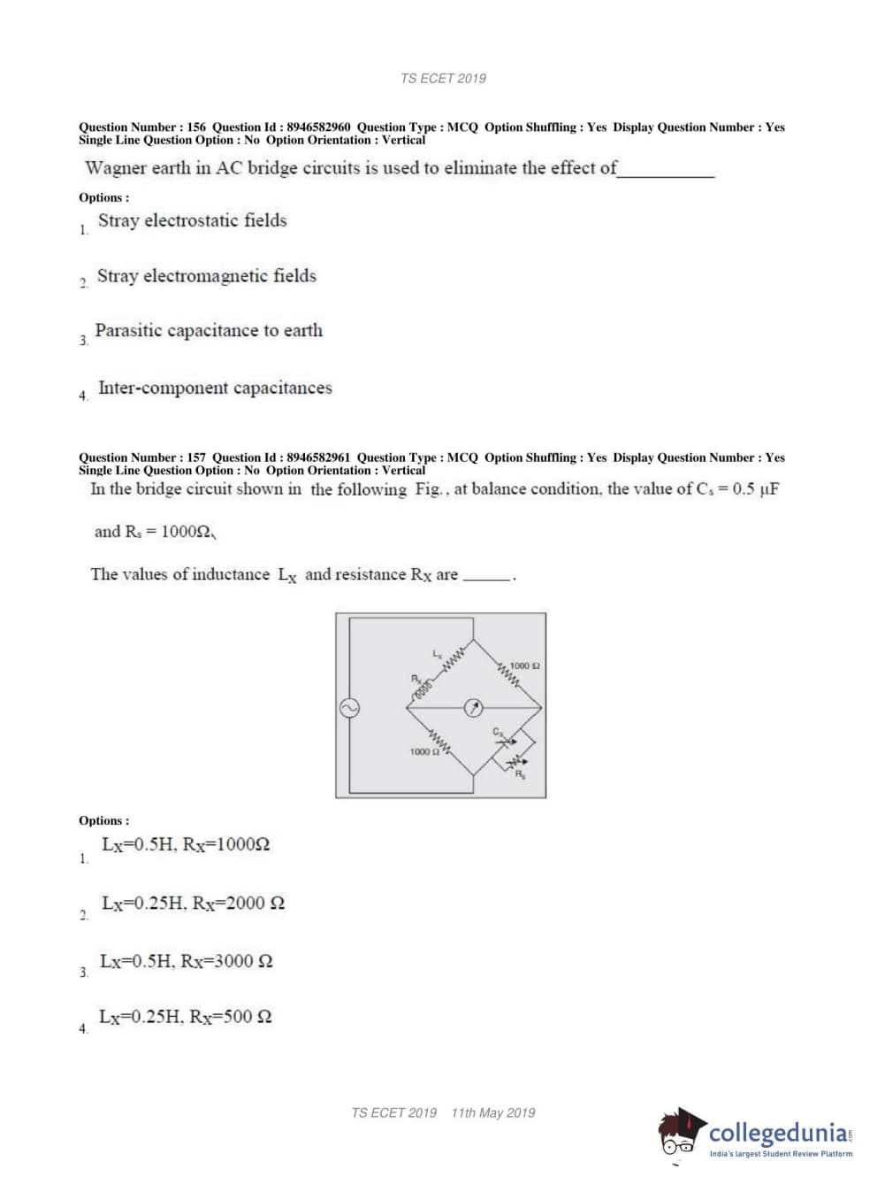 TS ECET 2019 ELECTRONICS & INSTRUMENTATION ENGINEERING Question Paper with Answer Key PDFs Shift 1