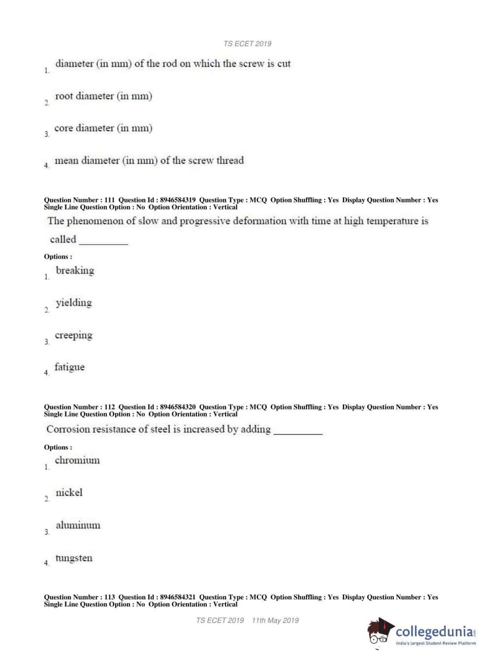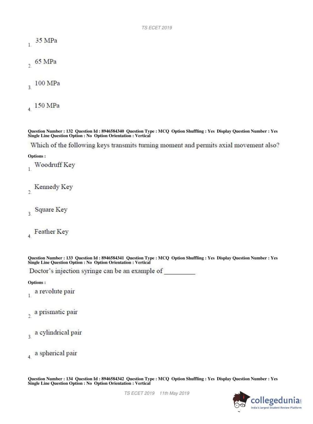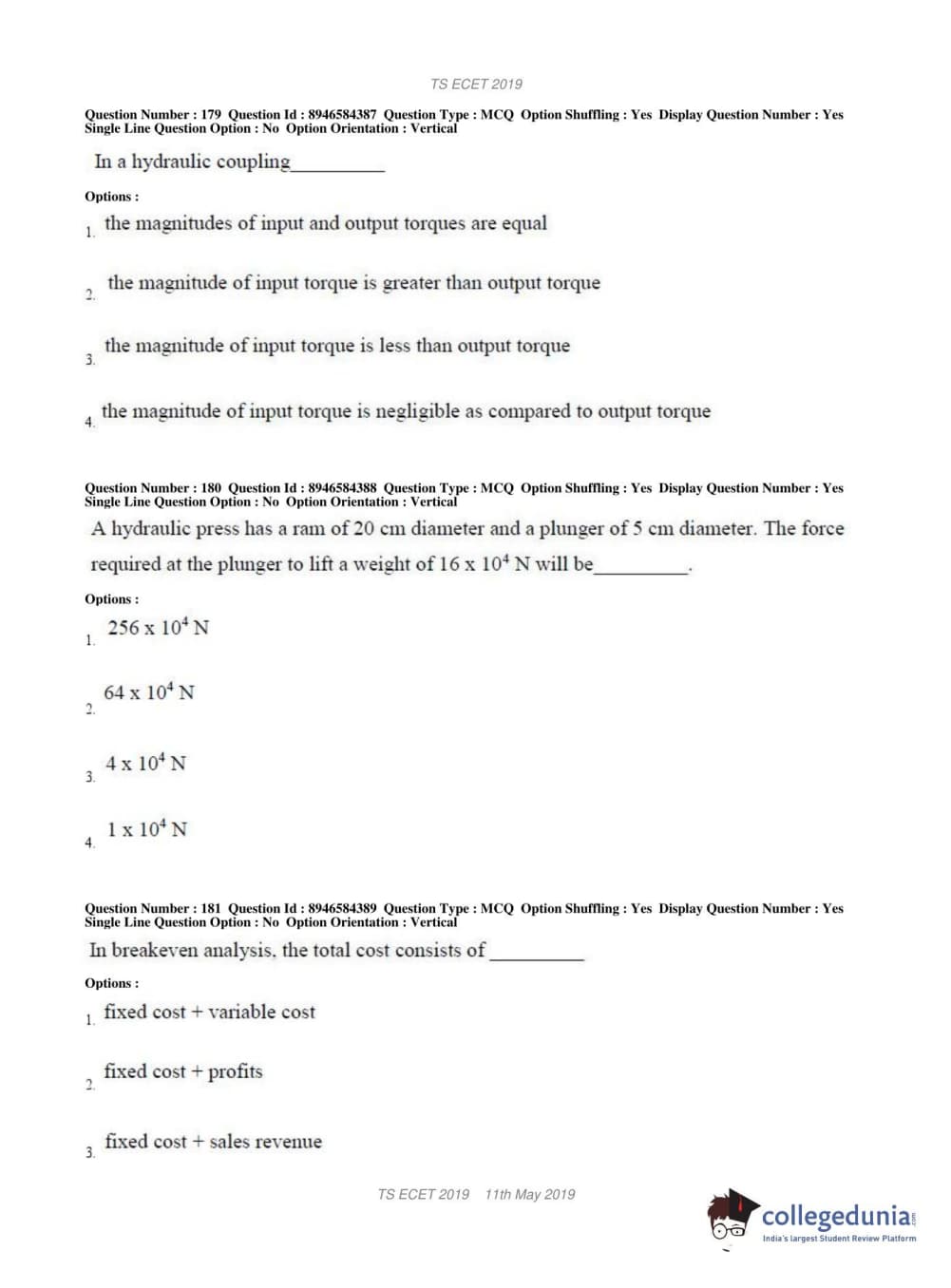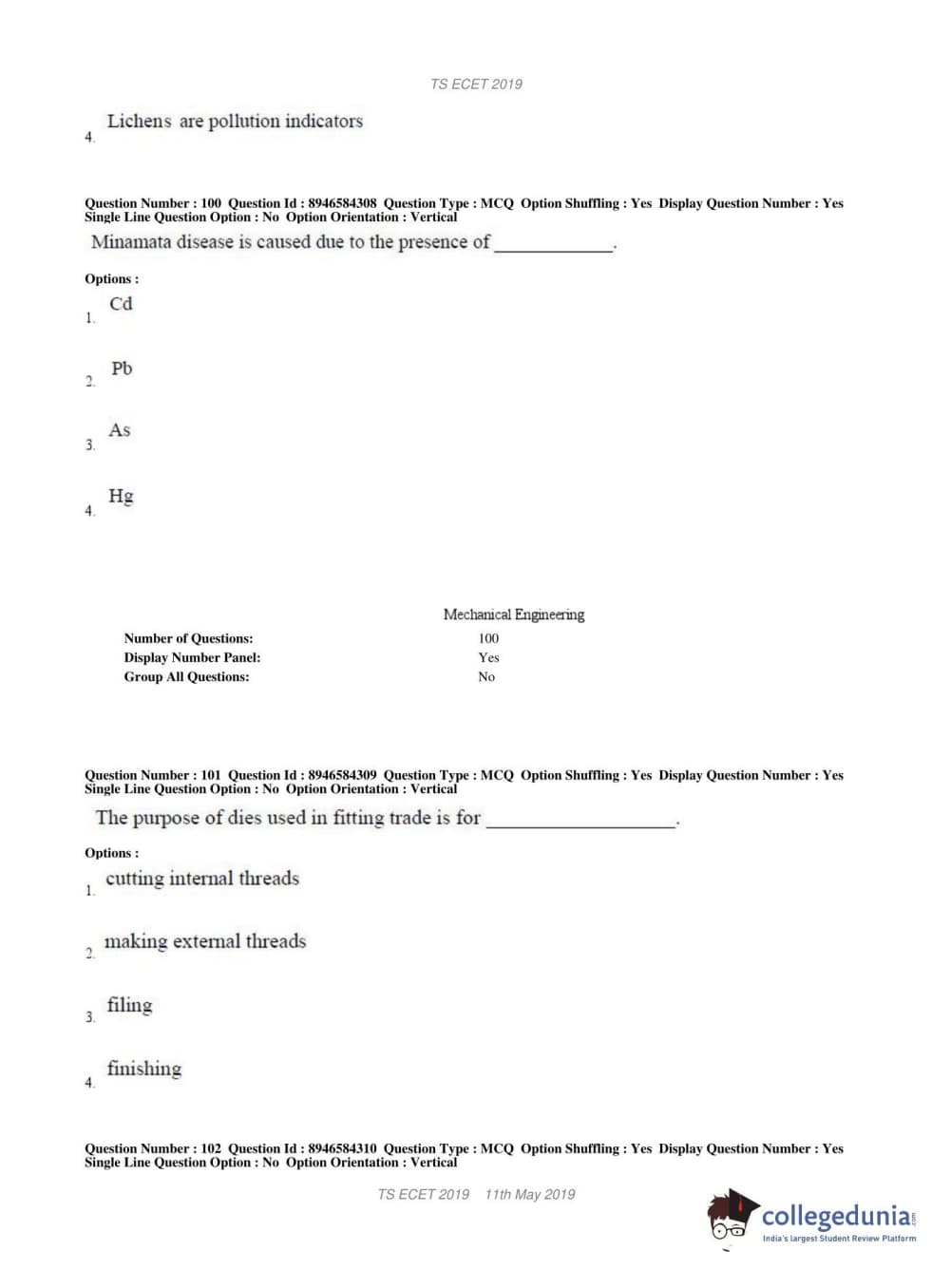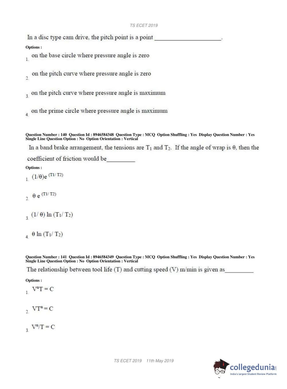 TS ECET 2019 MECHANICAL ENGINEERING Question Paper with Answer Key PDFs Shift 1