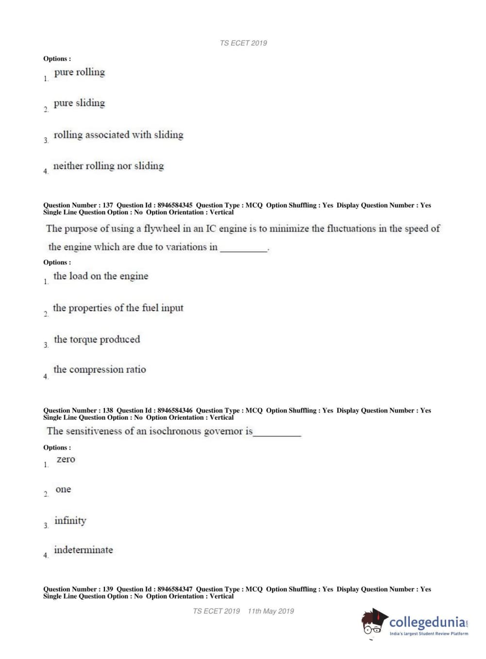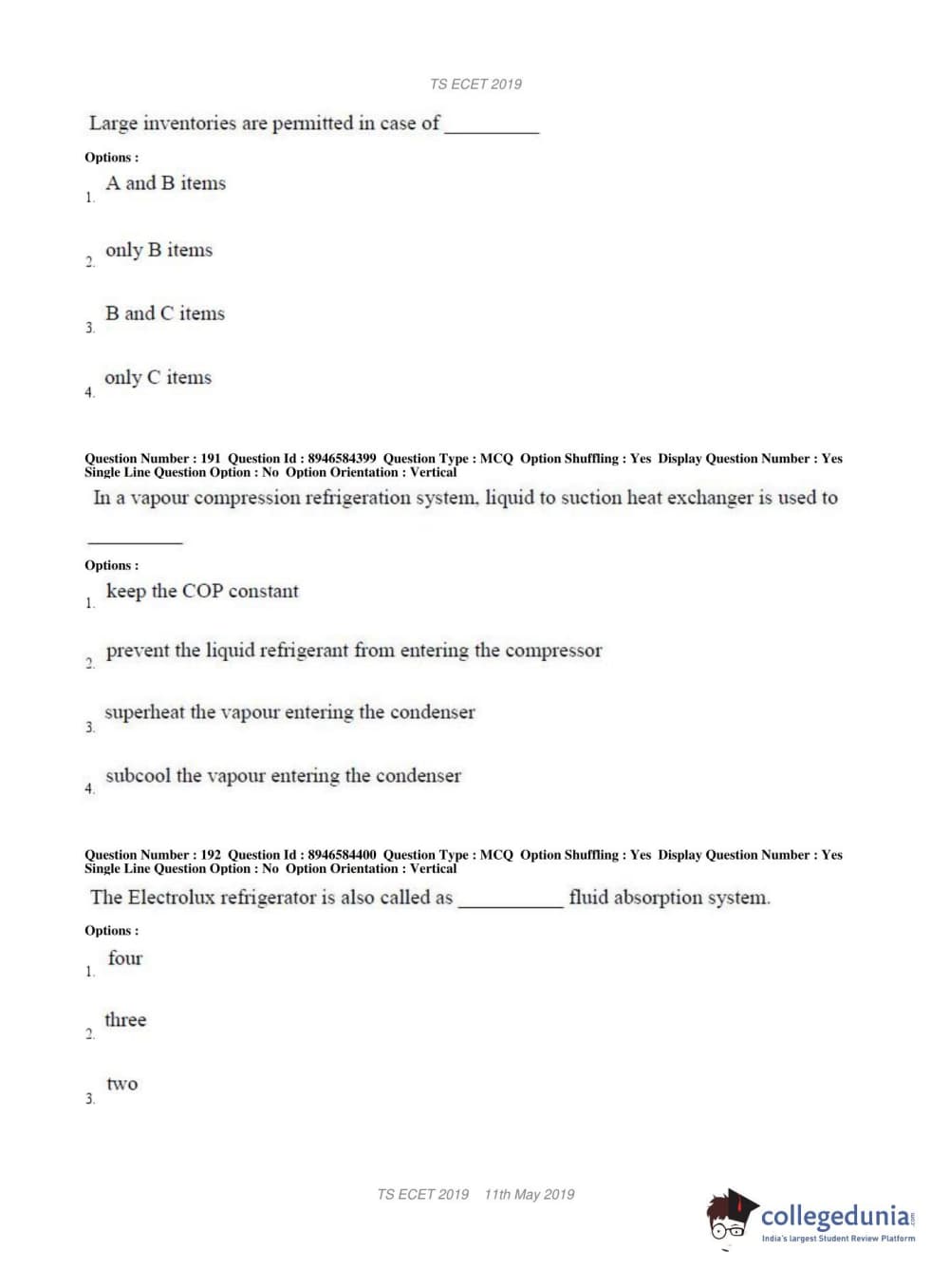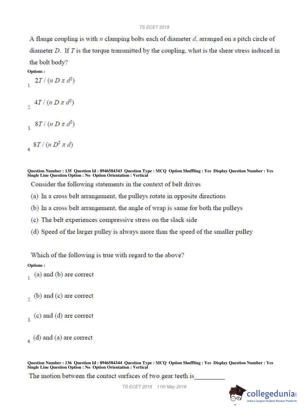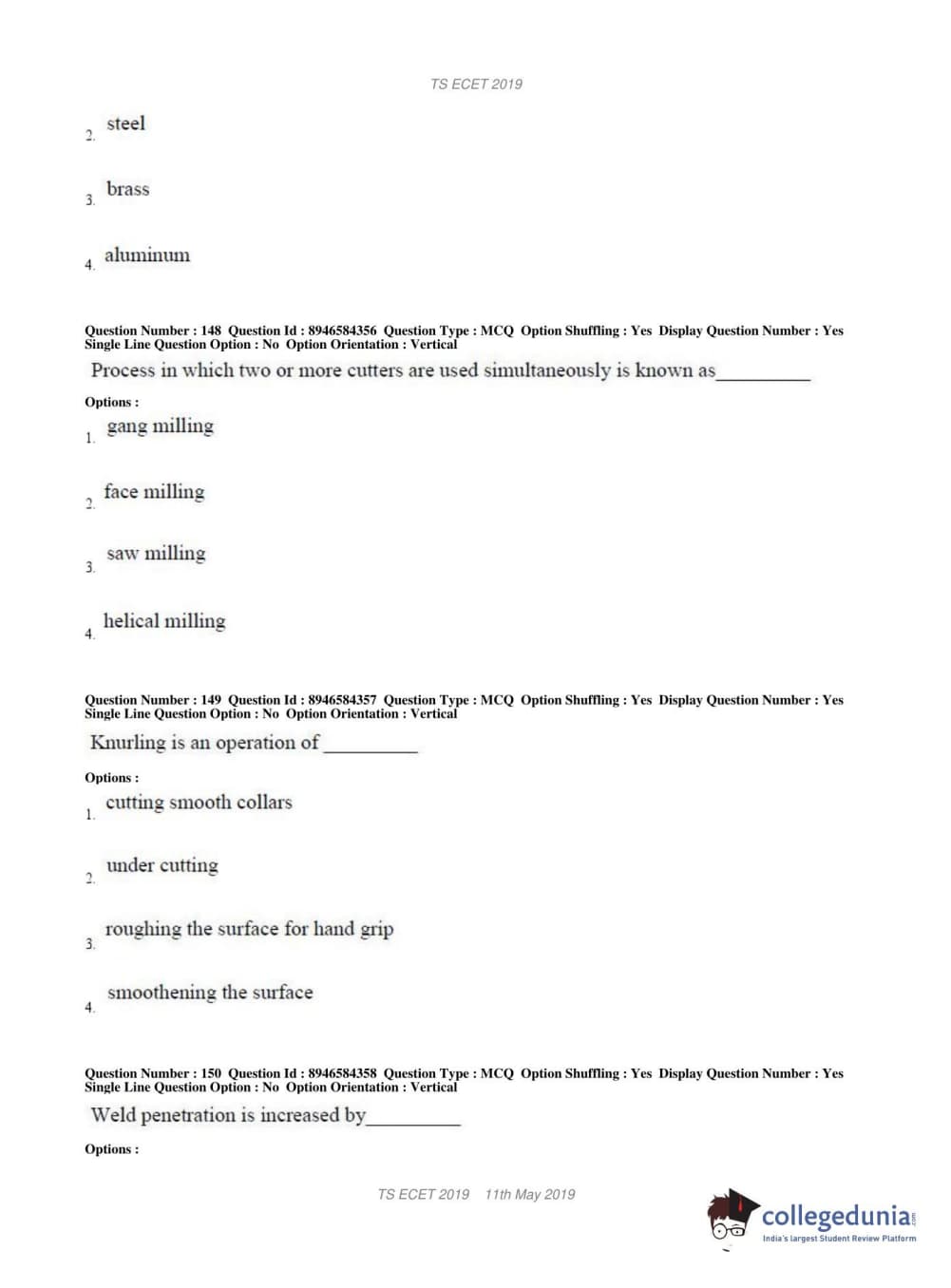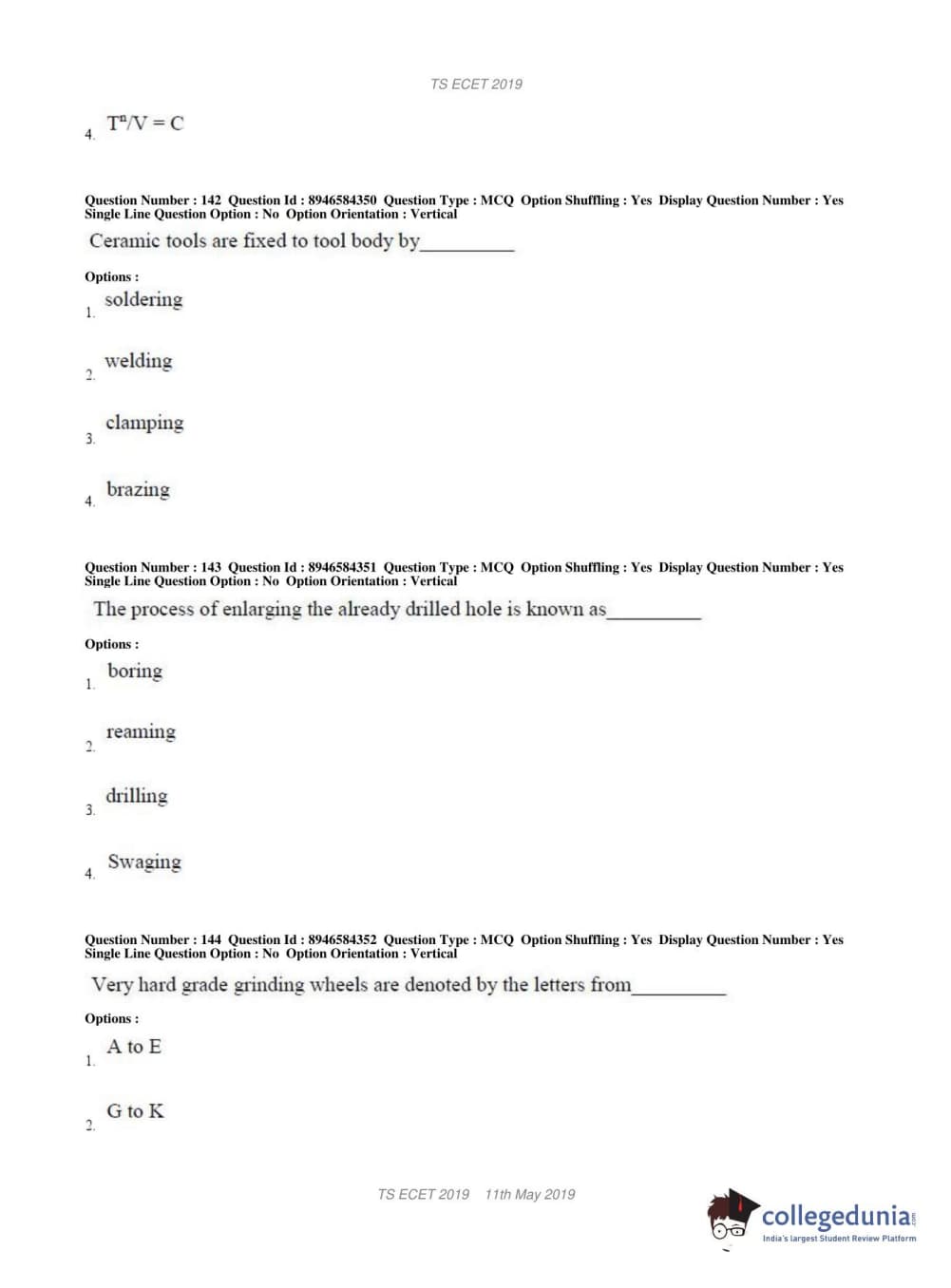 TS ECET 2019 MECHANICAL ENGINEERING Question Paper with Answer Key PDFs Shift 1
