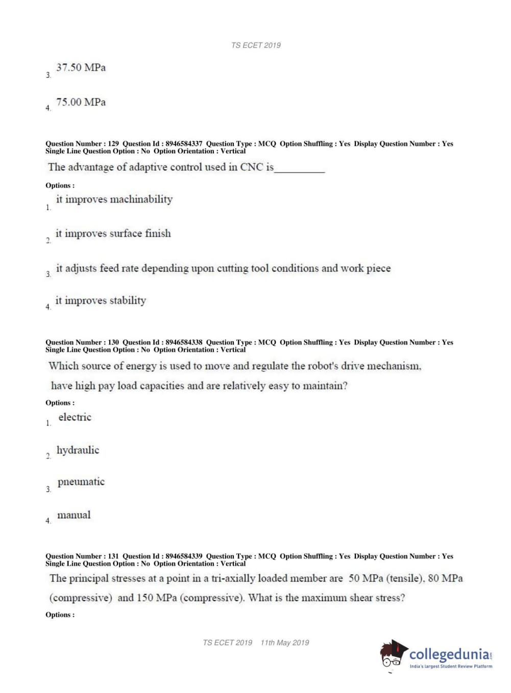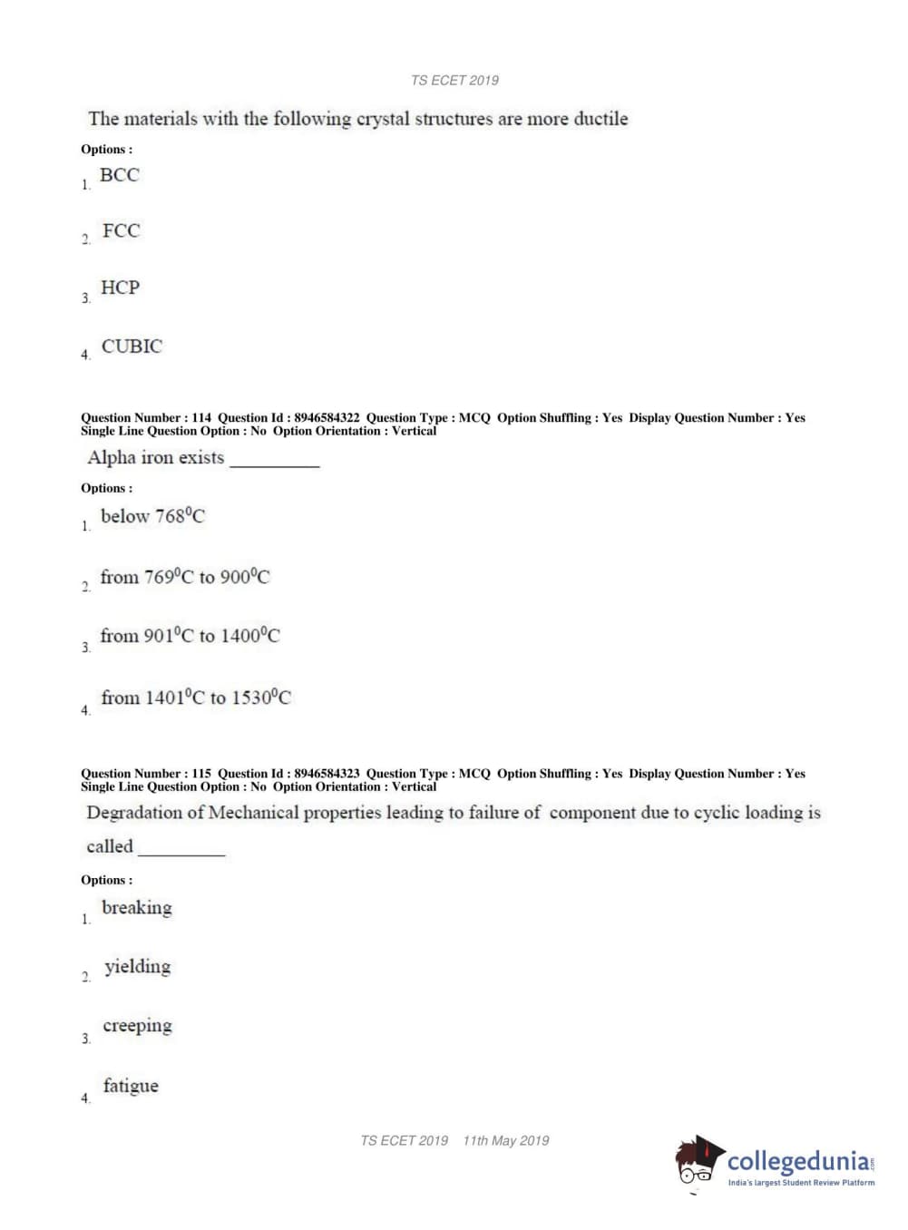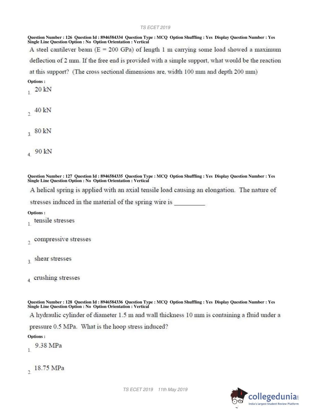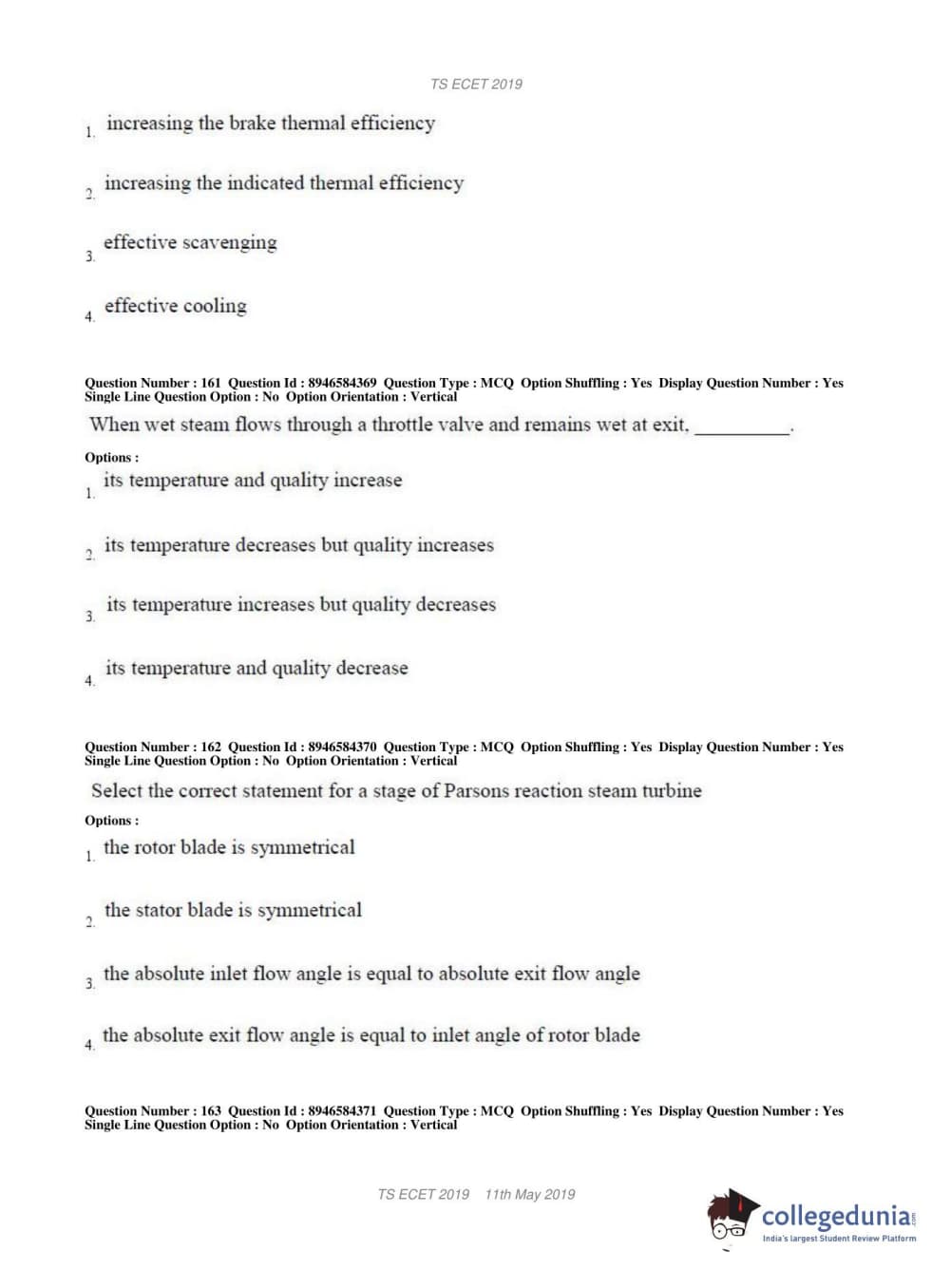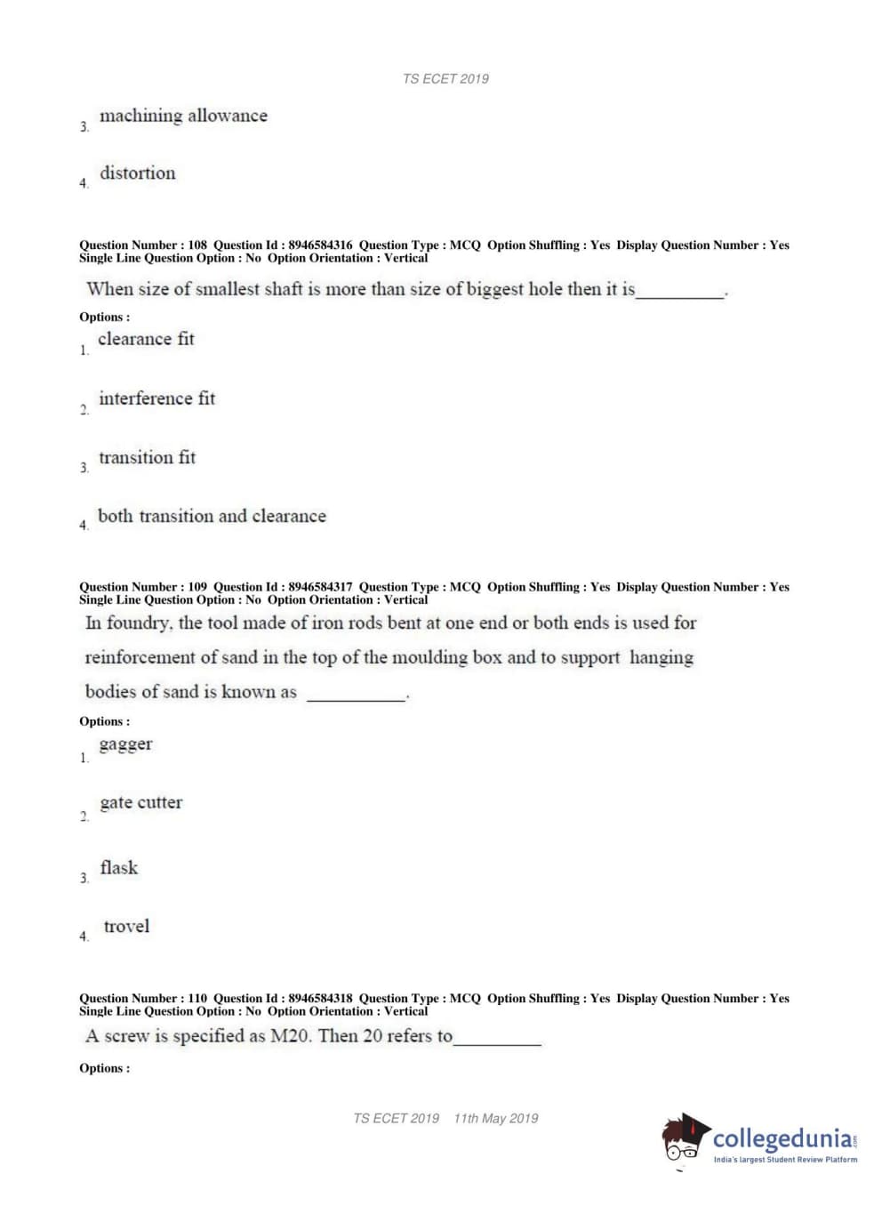 TS ECET 2019 MECHANICAL ENGINEERING Question Paper with Answer Key PDFs Shift 1