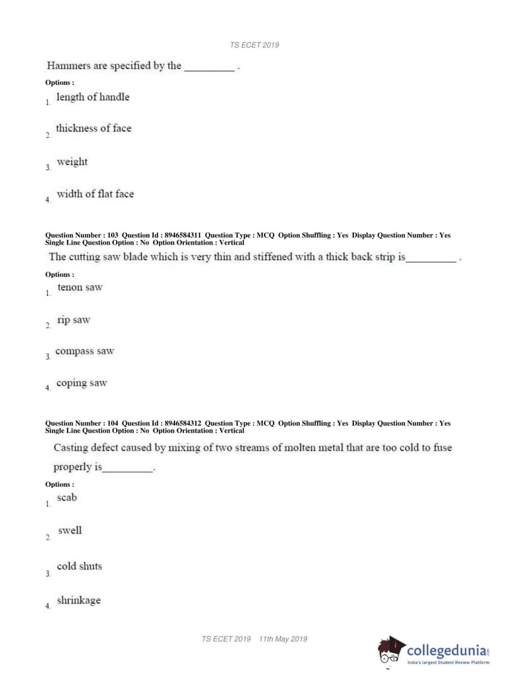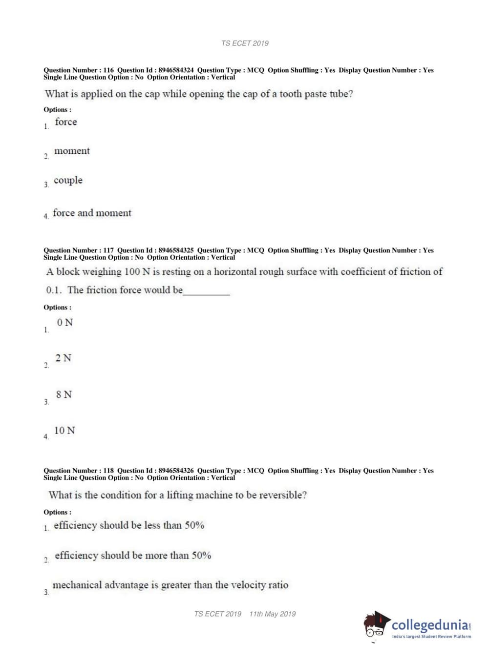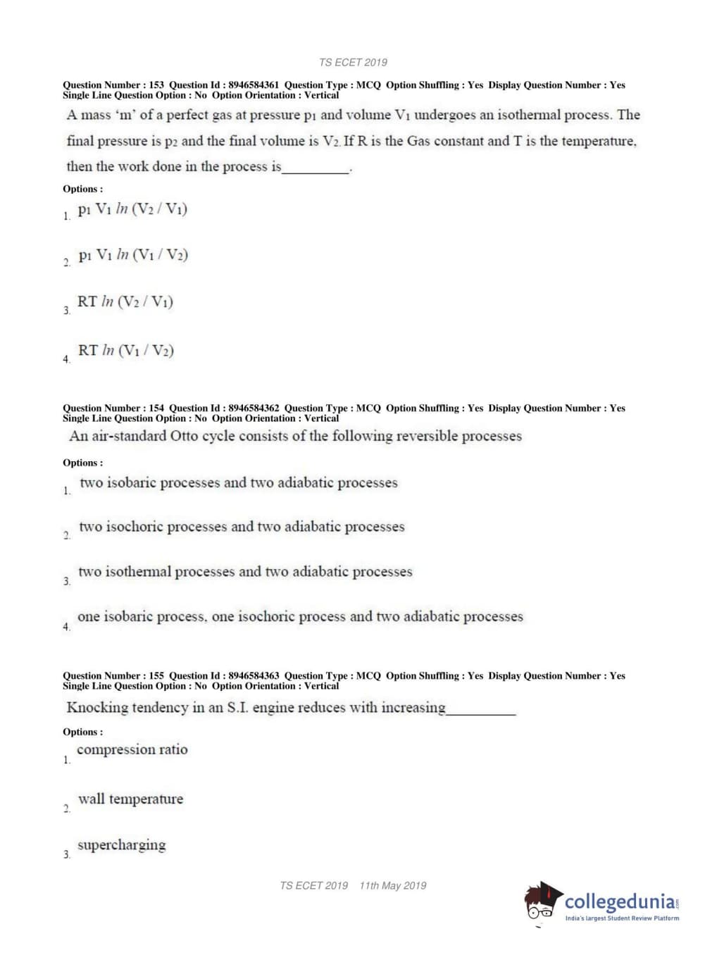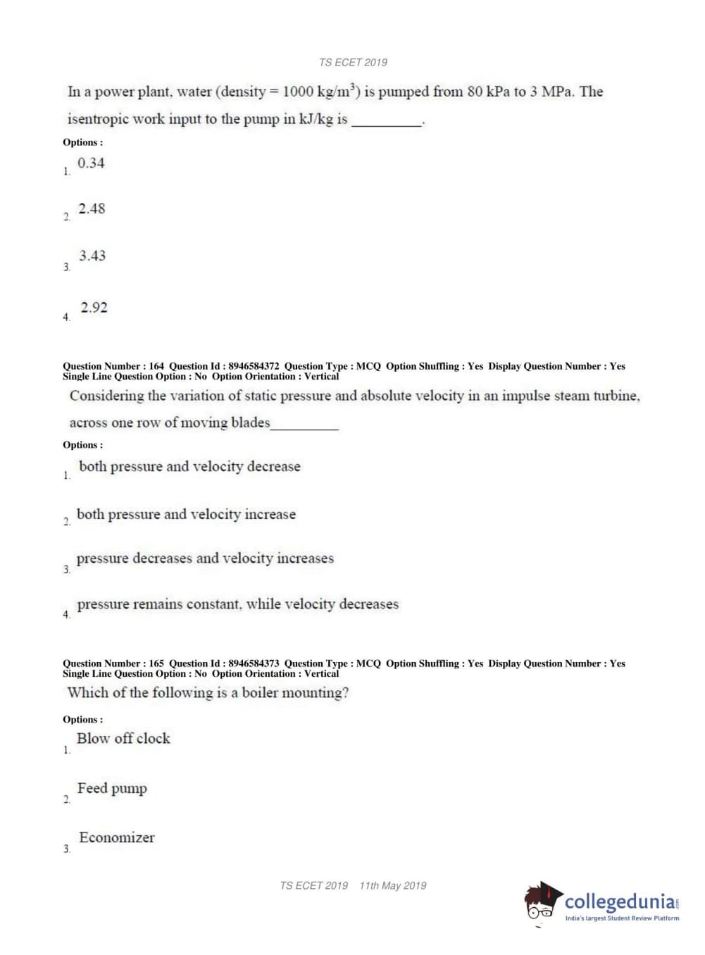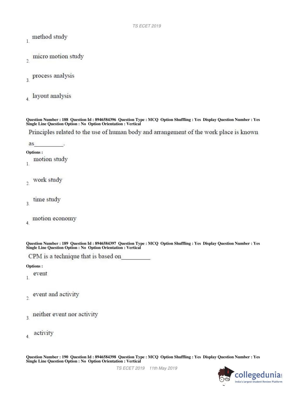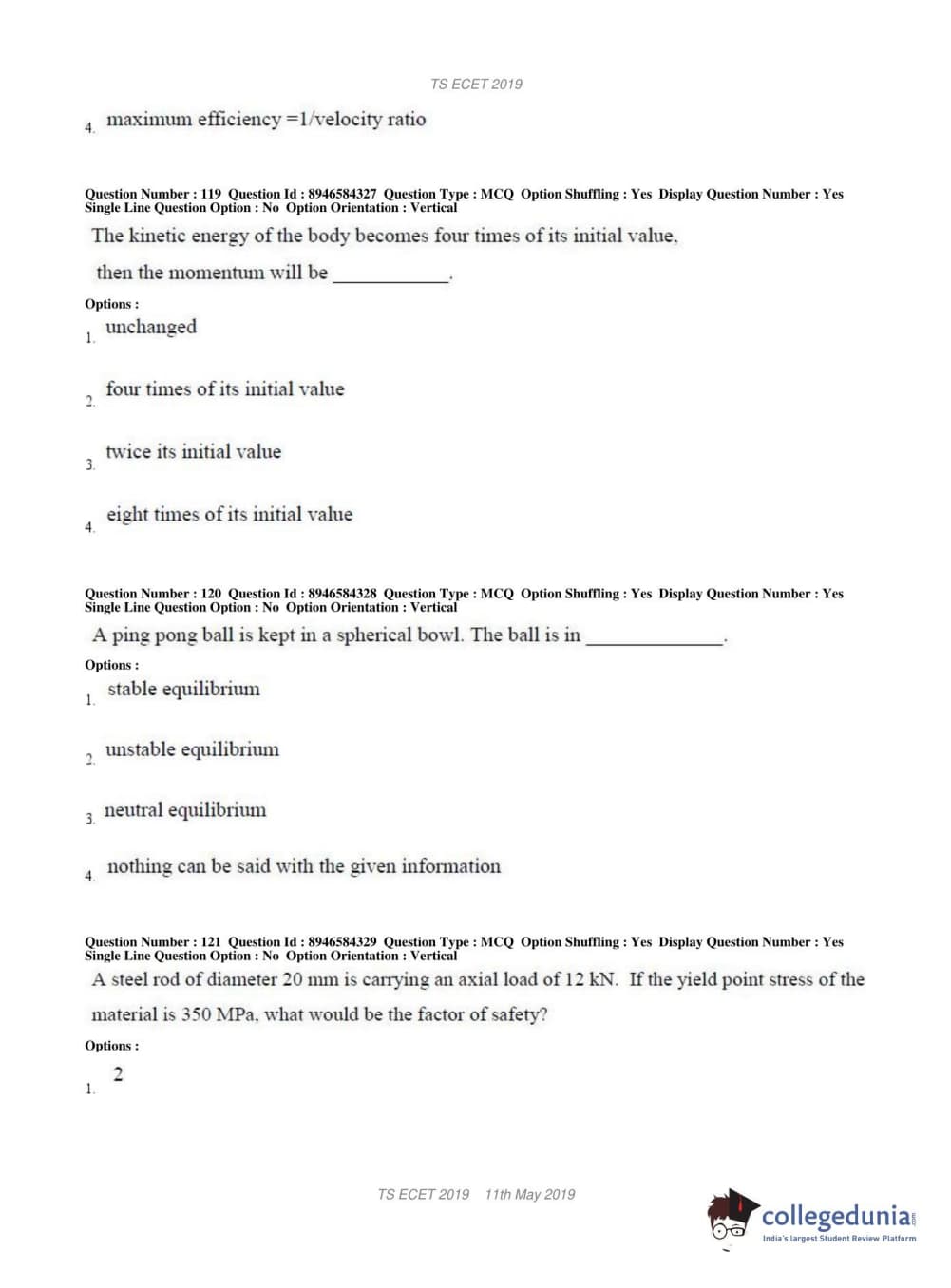 TS ECET 2019 MECHANICAL ENGINEERING Question Paper with Answer Key PDFs Shift 1