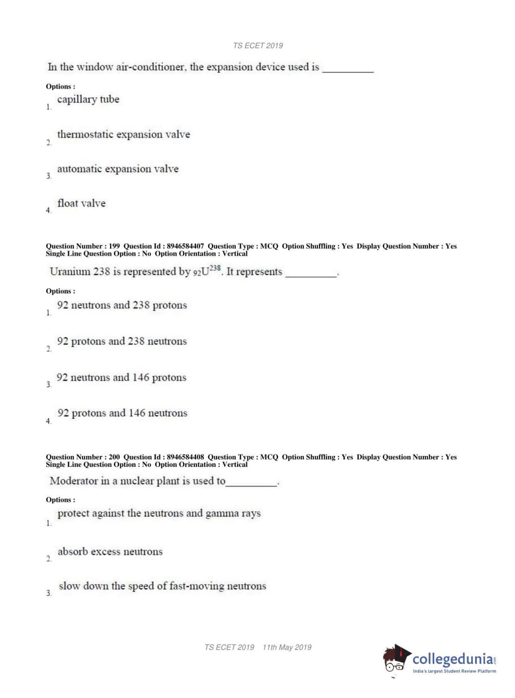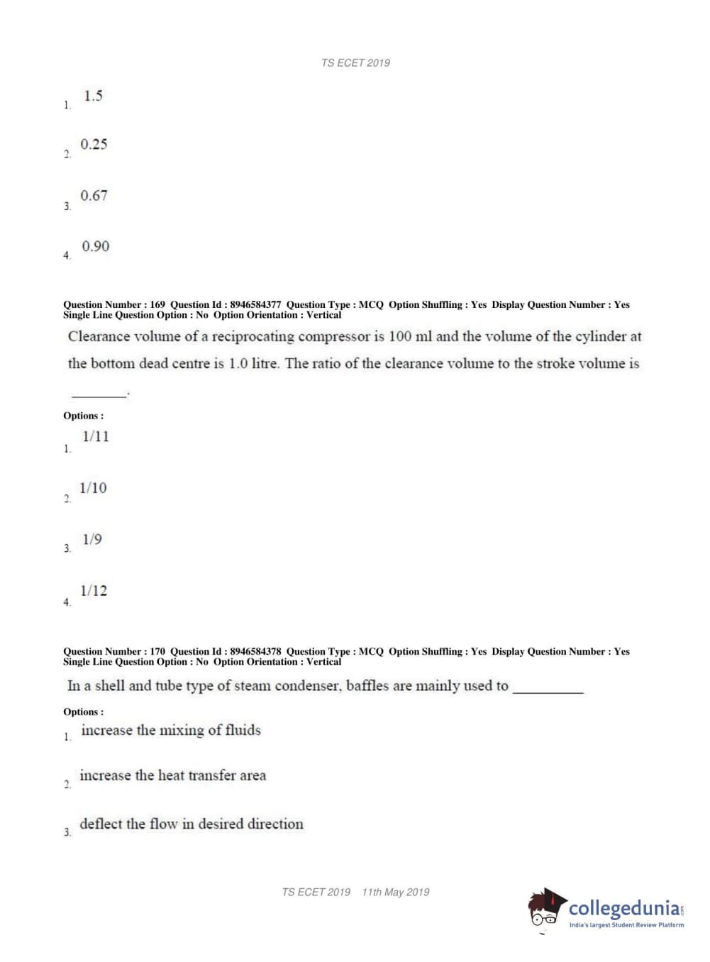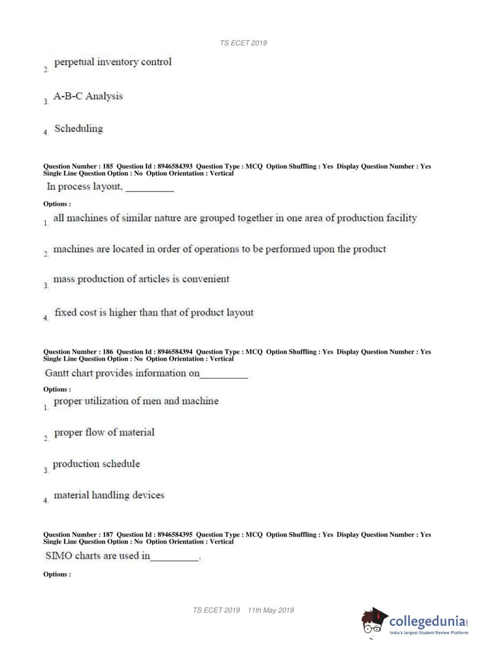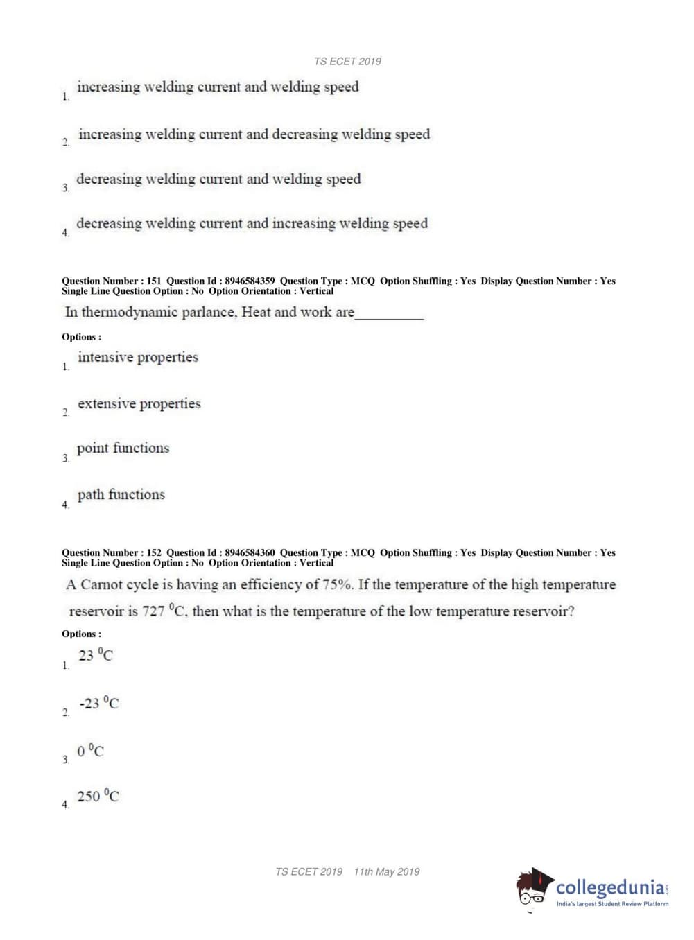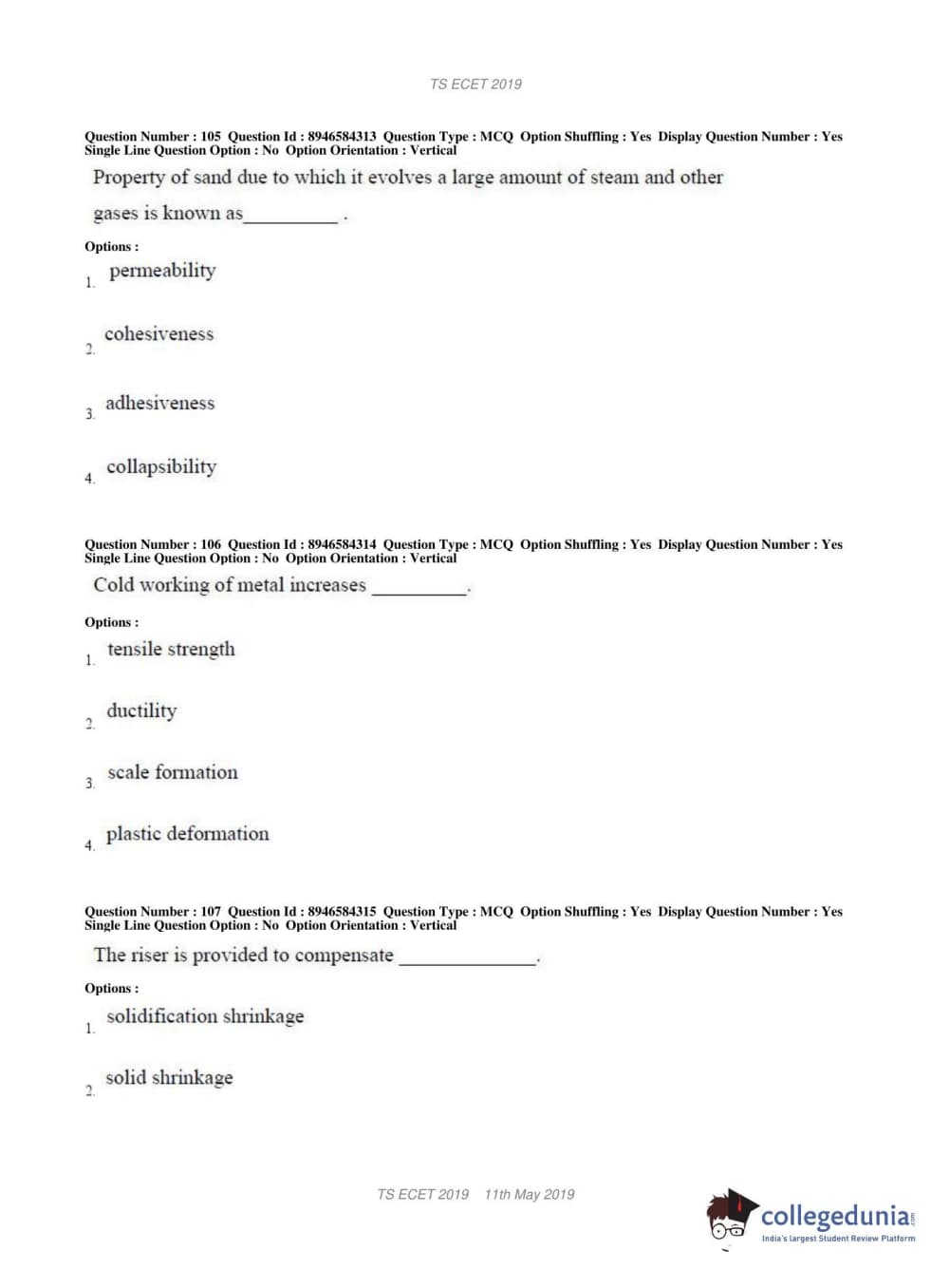 TS ECET 2019 MECHANICAL ENGINEERING Question Paper with Answer Key PDFs Shift 1