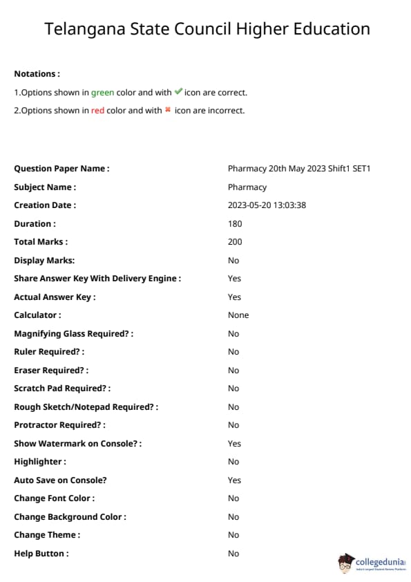 TS ECET 2023 Pharmacy Question Paper with Answer key PDF is available here for download. TS ECET 2023 was conducted by Osmania University on behalf of TSCHE on May 20, 2023. TS ECET 2023 Pharmacy Question Paper consisted of 200 questions carrying 1 mark for each. TS ECET 2023 Question Paper for Pharmacy included four subjects. Pharmacognosy, Pharmacology, Pharmaceutics and Pharmaceutical Chemistry section included 50 questions each.