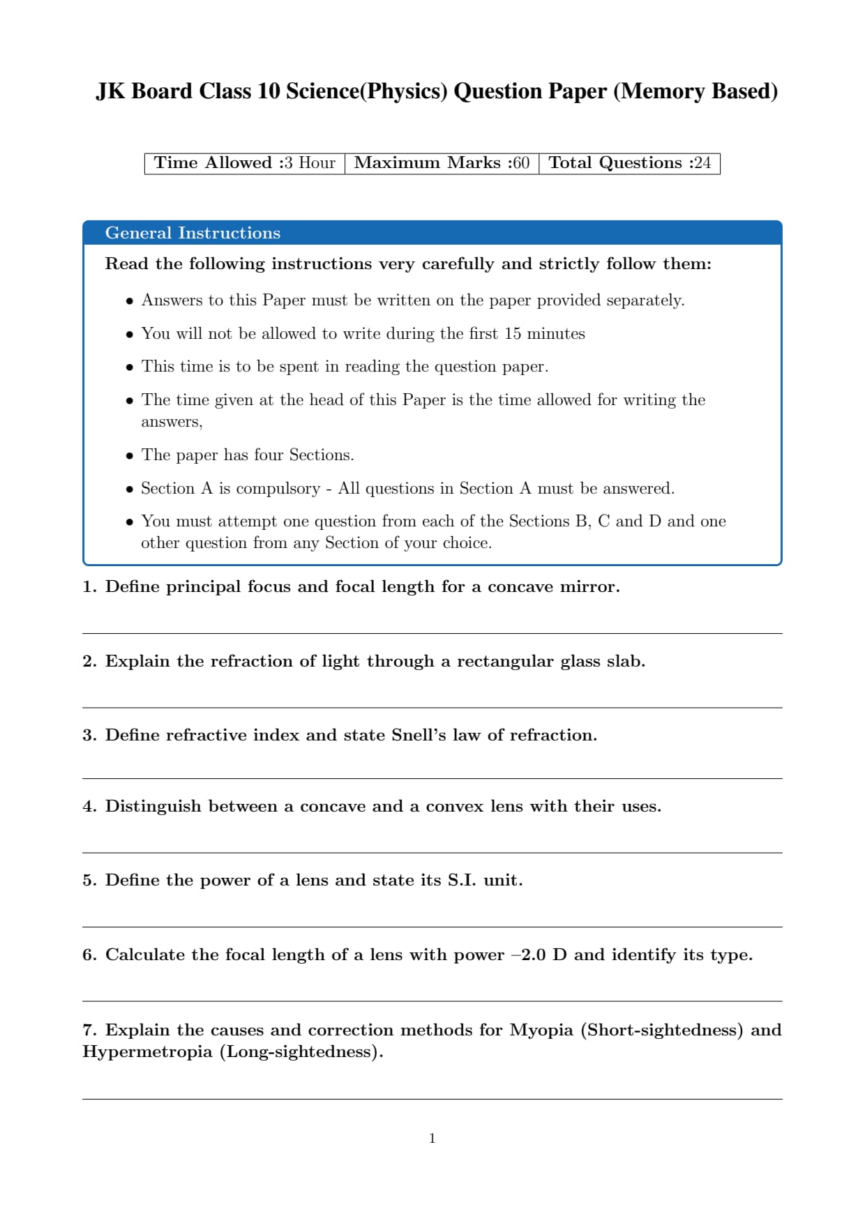 The Physics section of the paper focused on core chapters such as Light: Reflection and Refraction, Human Eye and the Colourful World, Electricity, and Magnetic Effects of Electric Current. The paper featured a mix of numerical problems, ray diagrams, and conceptual questions. Students found the application-based questions on Lens Formula and Ohm's Law particularly significant. Access the official JKBOSE Class 10 Physics solved paper below to understand the marking scheme and evaluation criteria.
