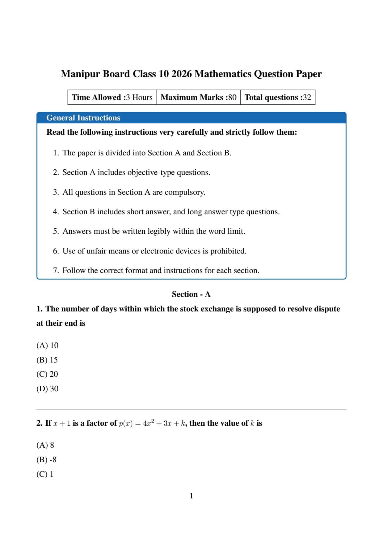 | Manipur Board Class 10 Mathematics Question Paper 2026 | Download PDF | Check Solution |