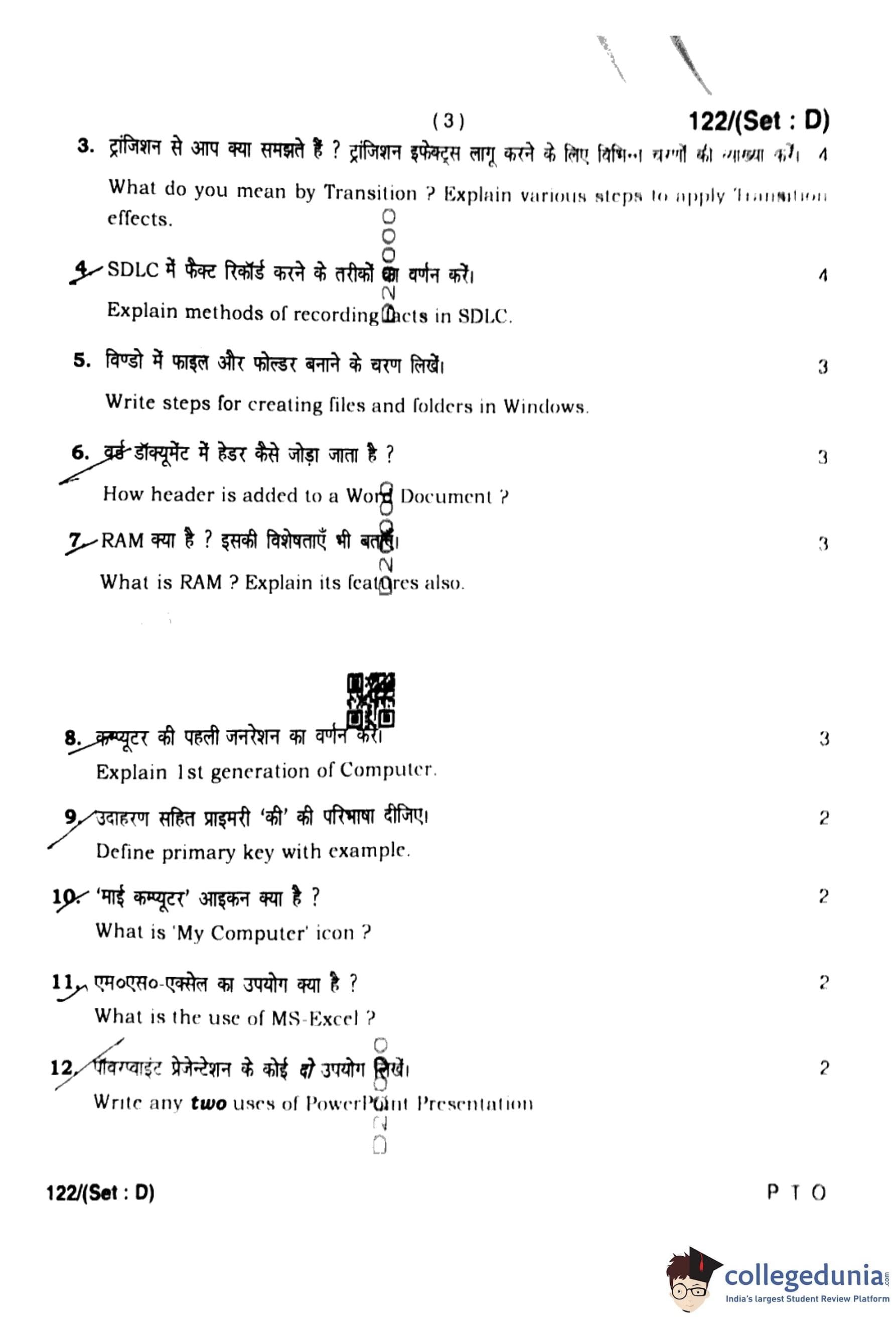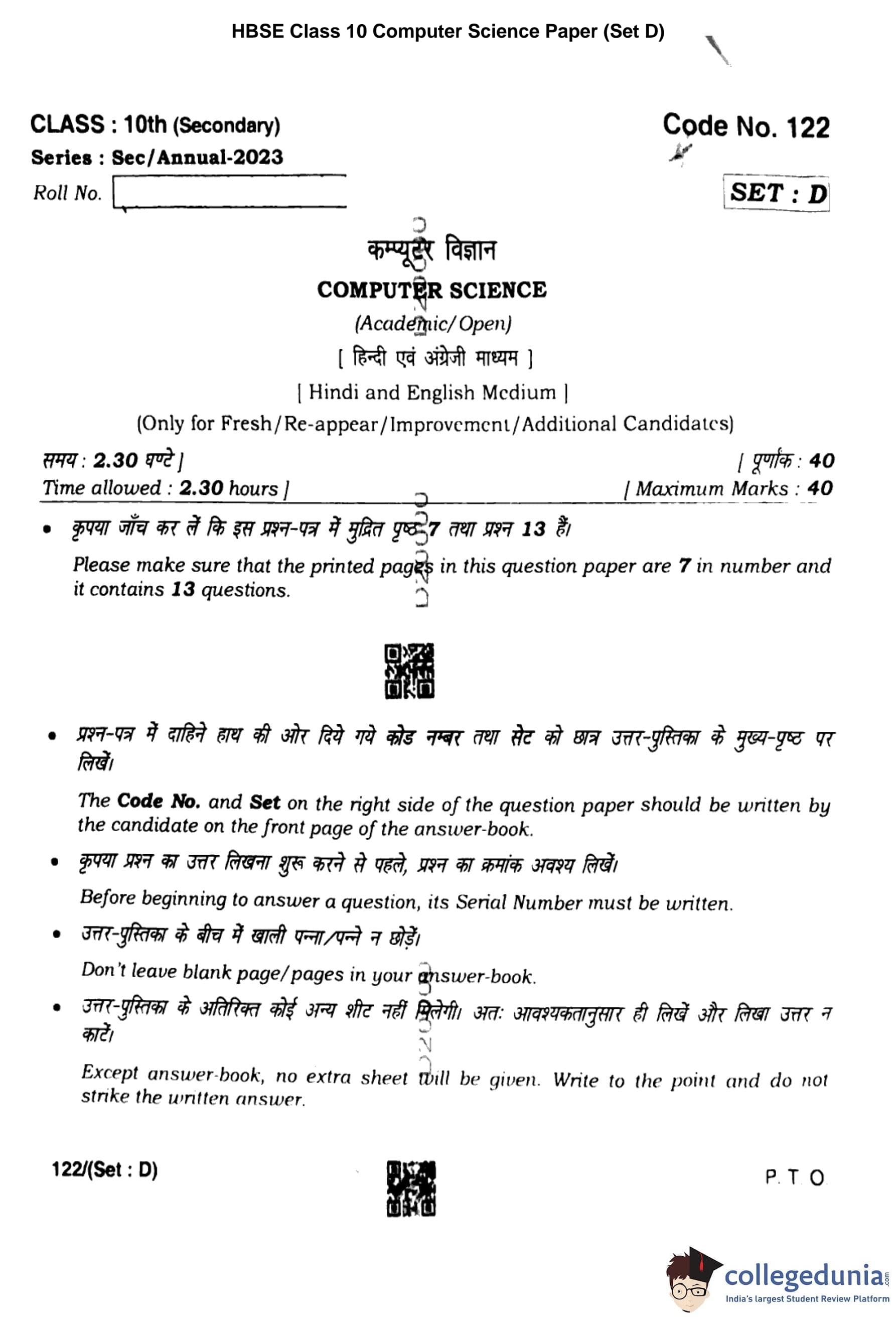 HBSE Class 10 Computer Science Set D Question Paper 2023 with Answer Key pdf is available for download here. The exam was conducted by Board of School Education Haryana (BSEH) on March 3, 2023. The question paper comprised a total of 13 questions.