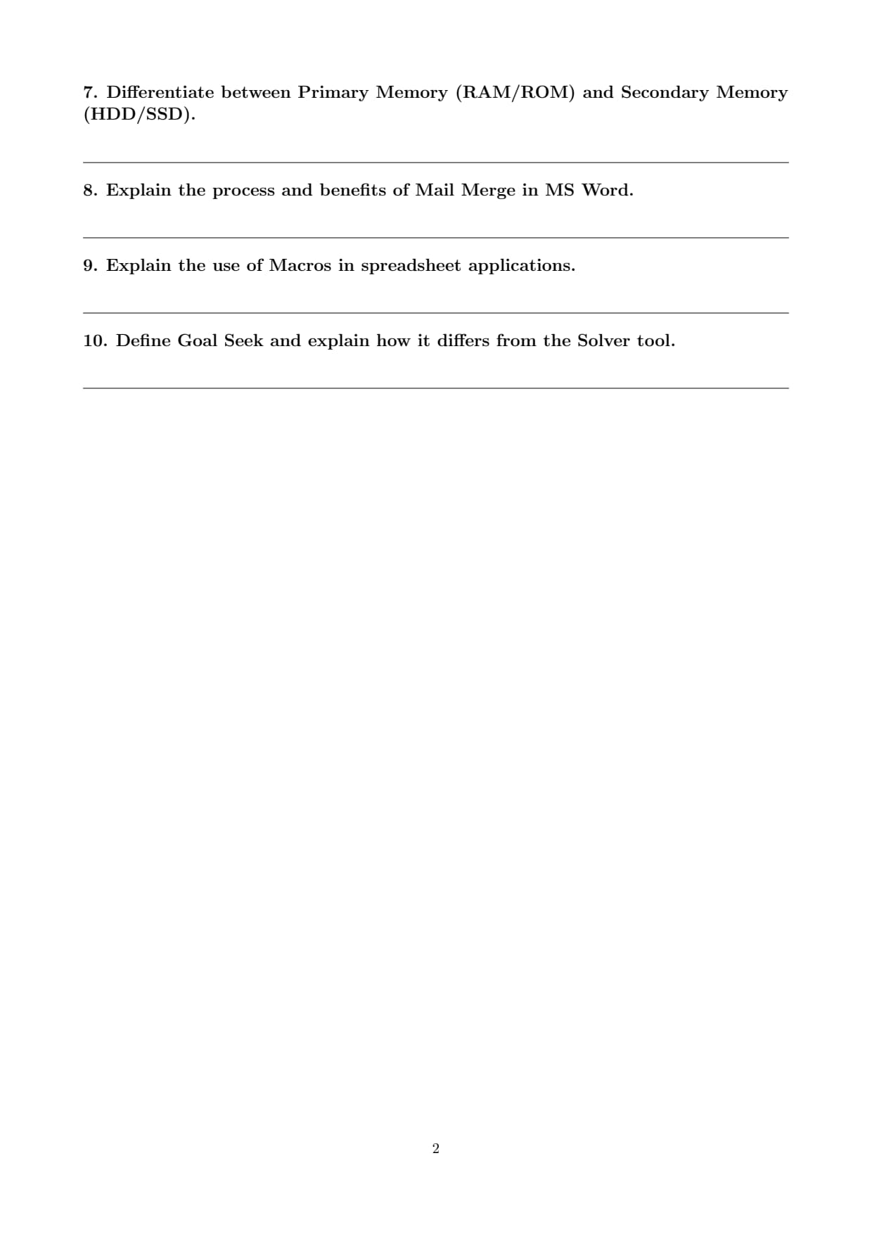 Differentiate between Primary Memory (RAM/ROM) and Secondary Memory (HDD/SSD).