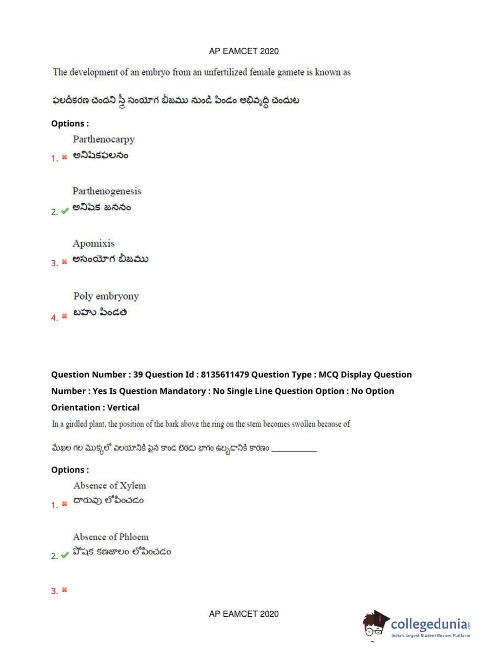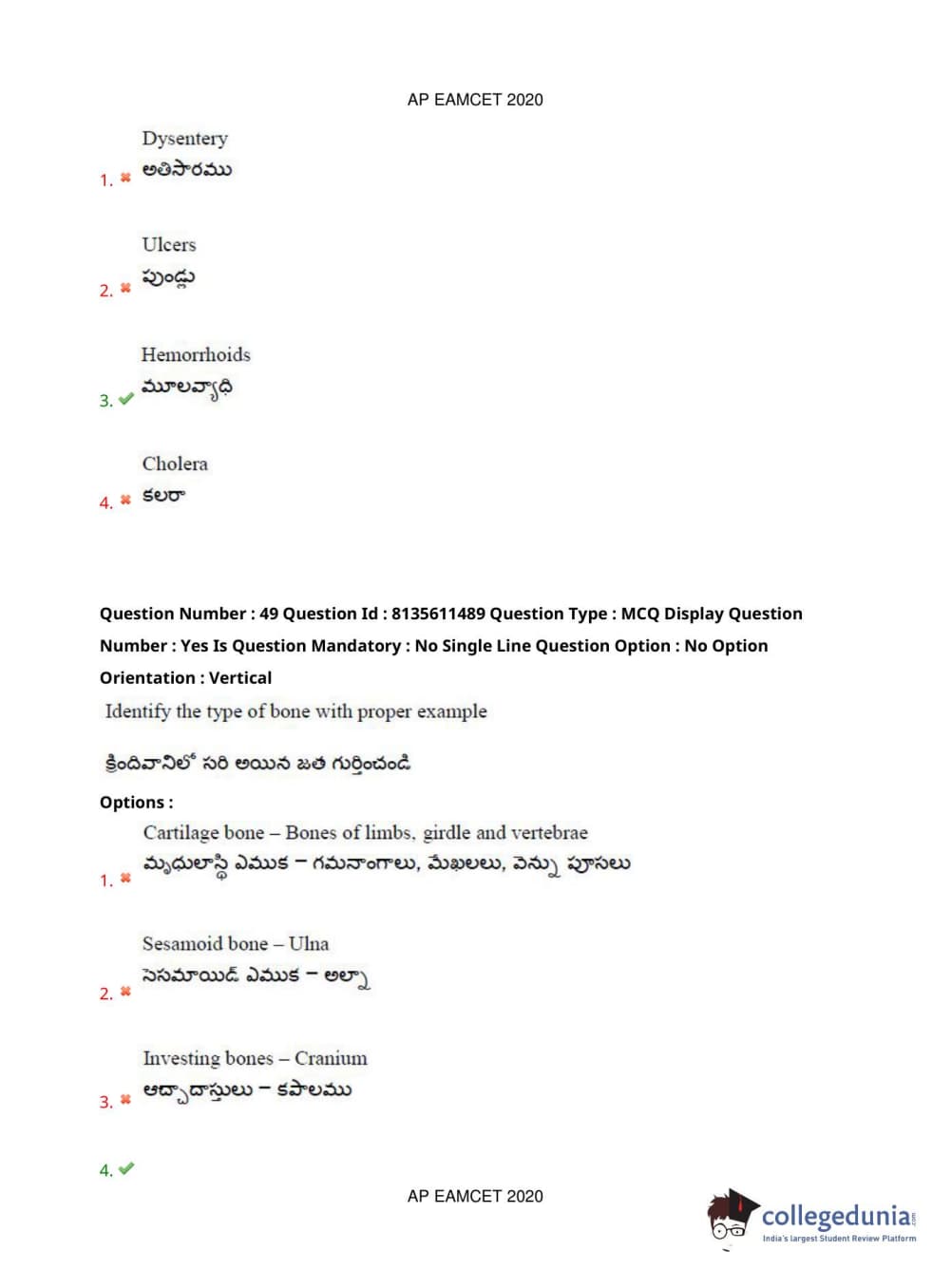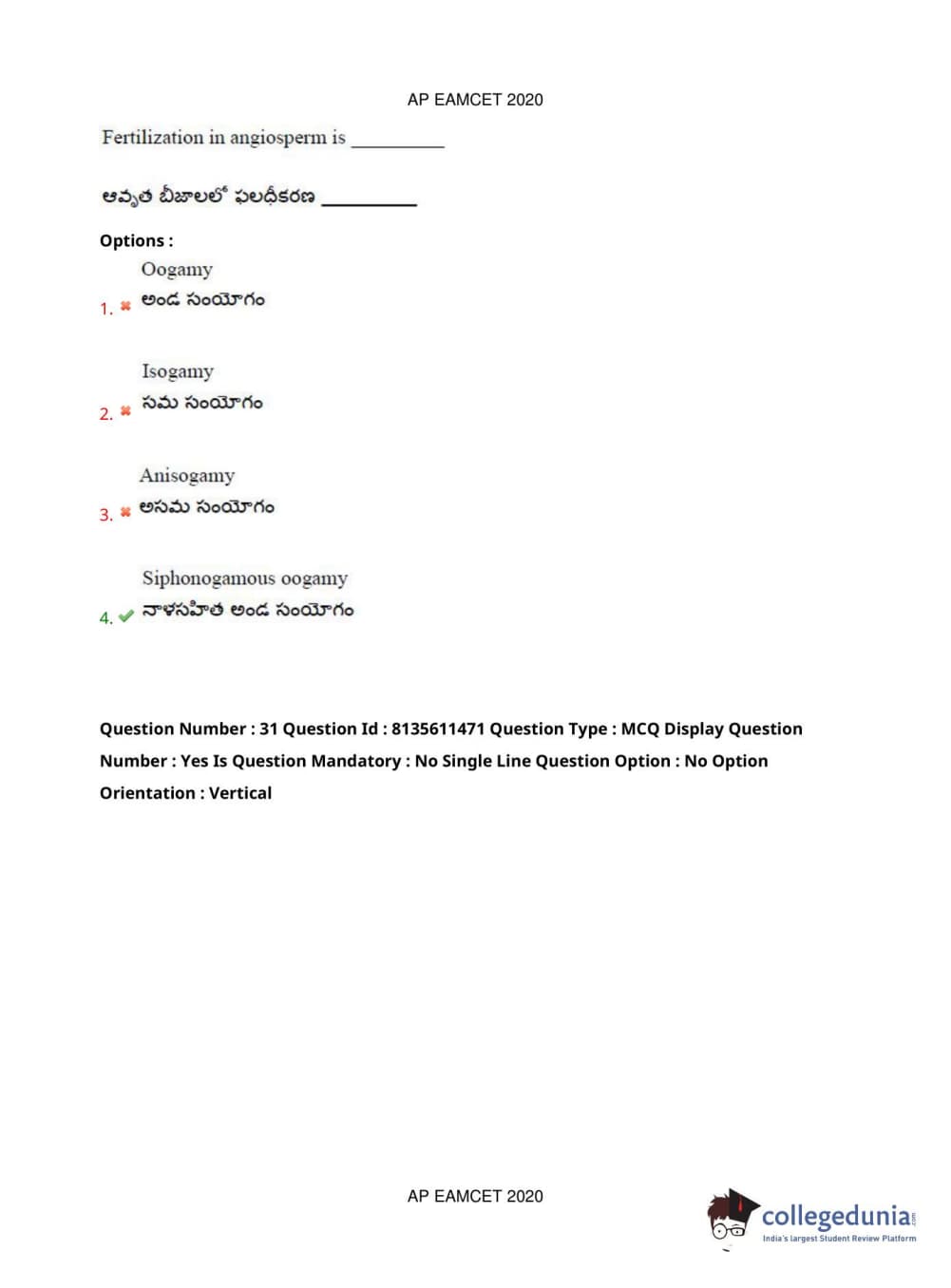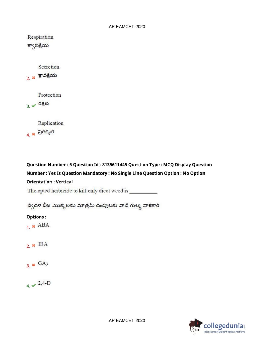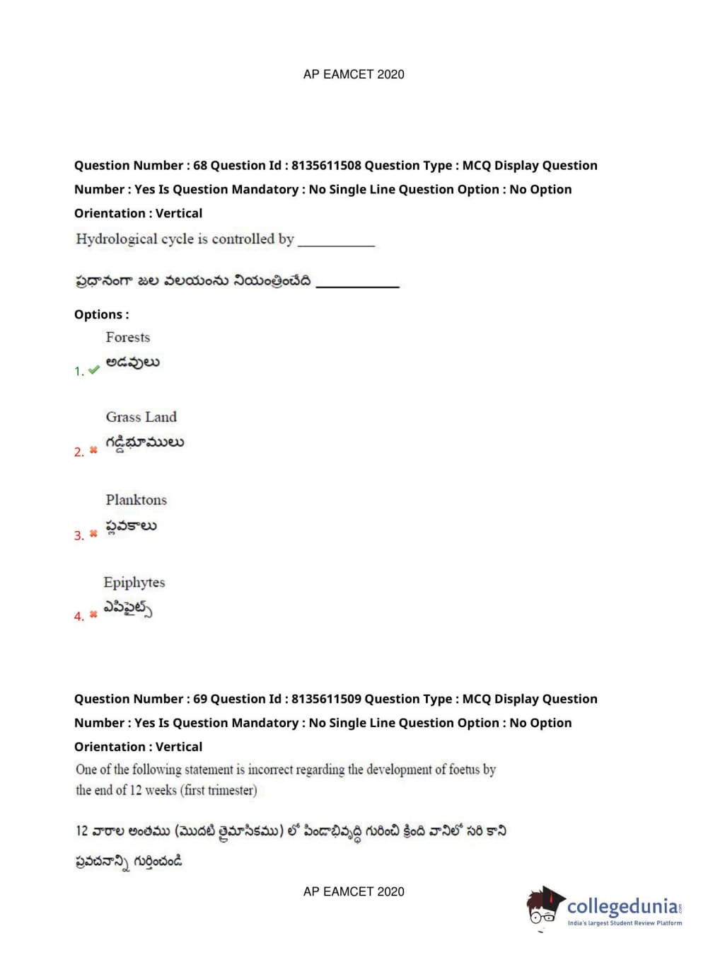 AP EAPCET 2020 Agriculture and Medical Question Paper with Answer Key PDFs Afternoon Session