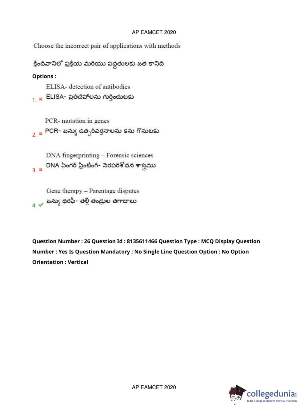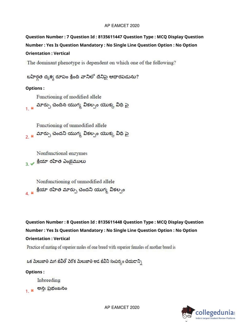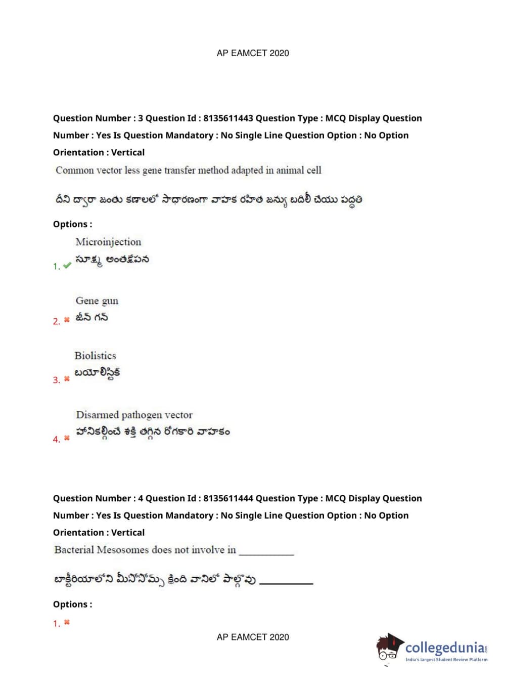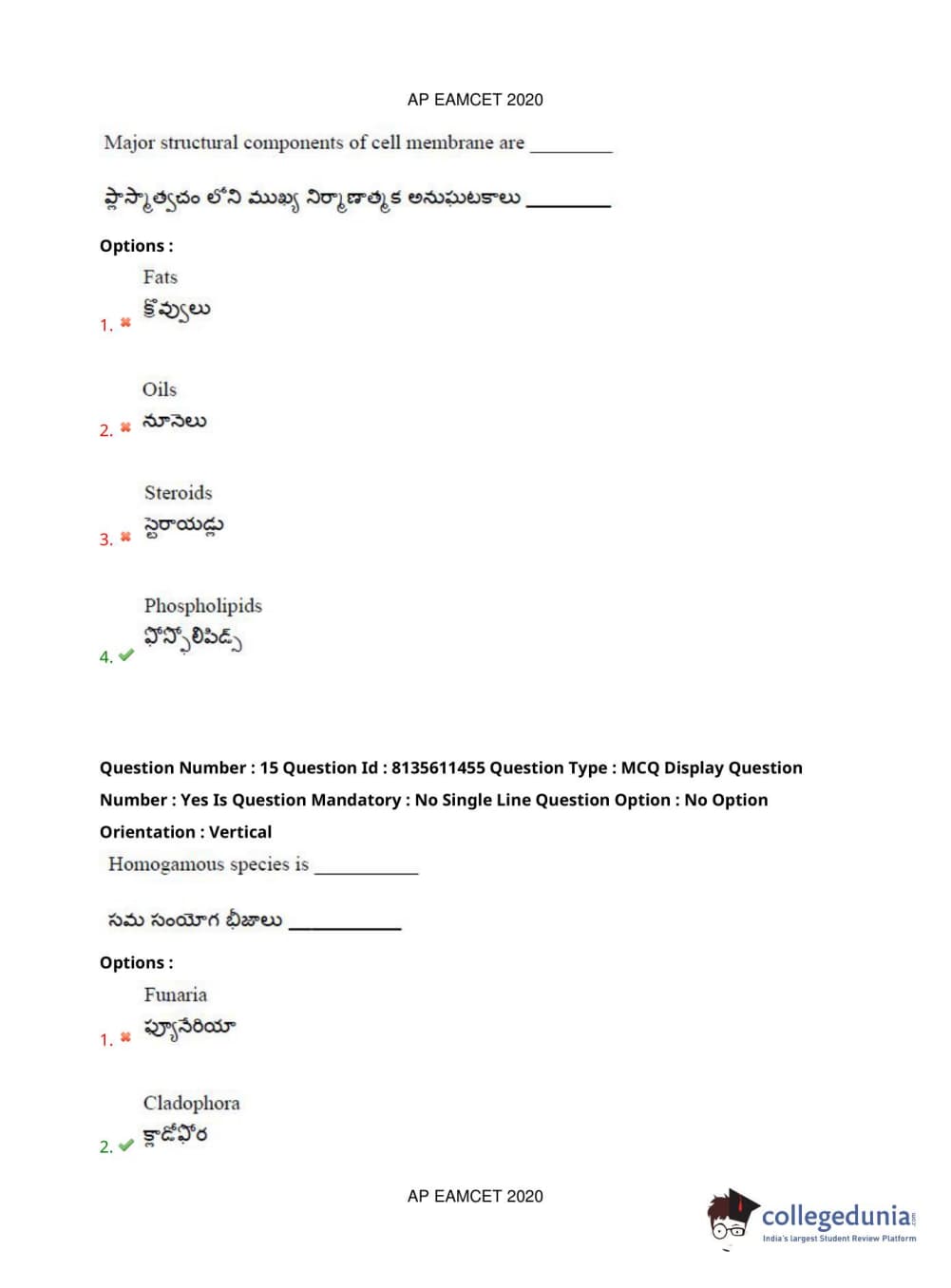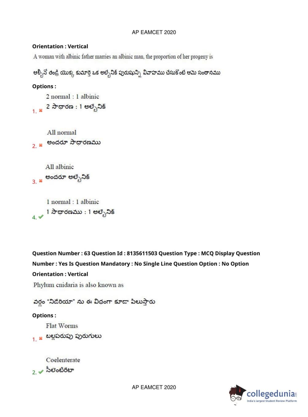 AP EAPCET 2020 Agriculture and Medical Question Paper with Answer Key PDFs Afternoon Session
