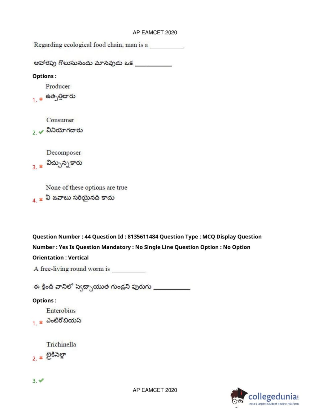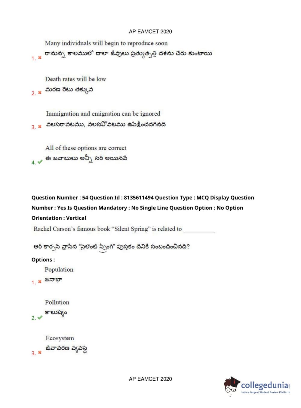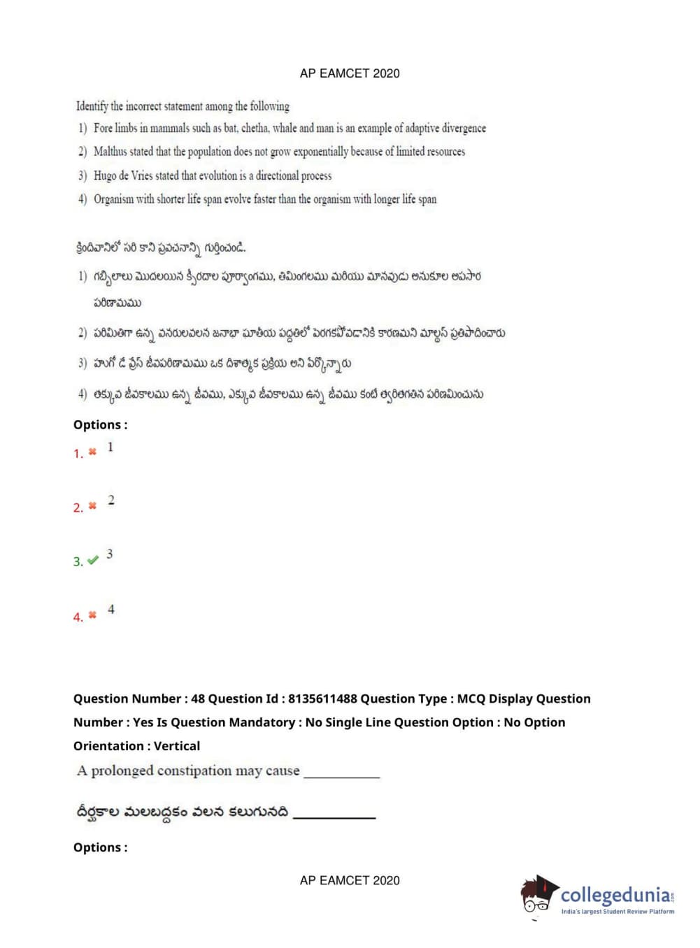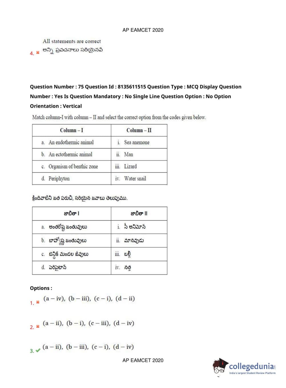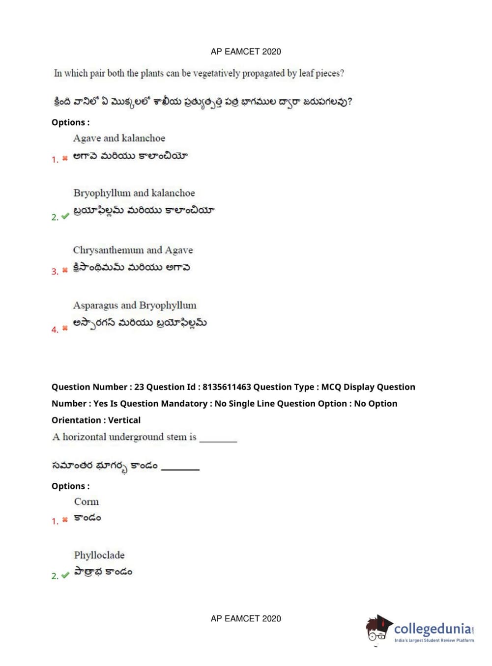 AP EAPCET 2020 Agriculture and Medical Question Paper with Answer Key PDFs Afternoon Session